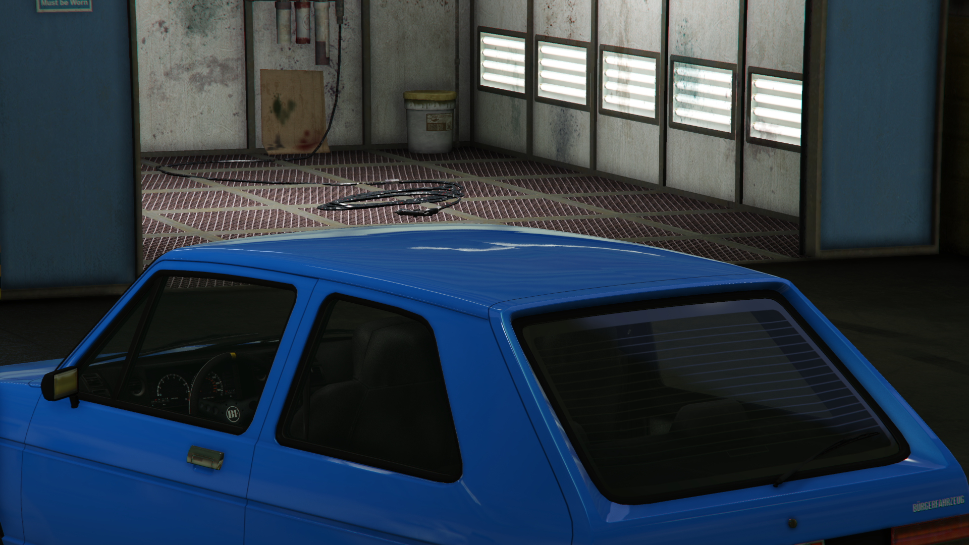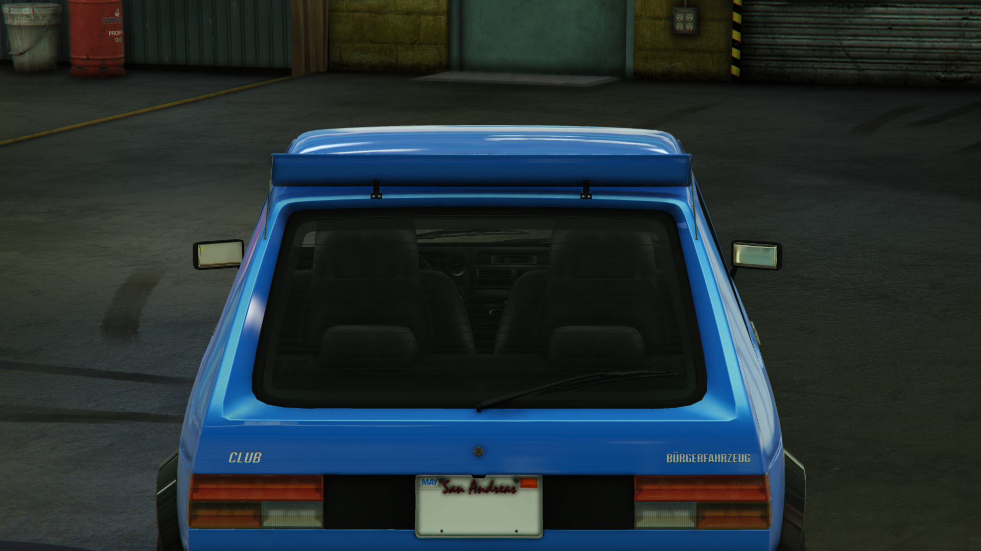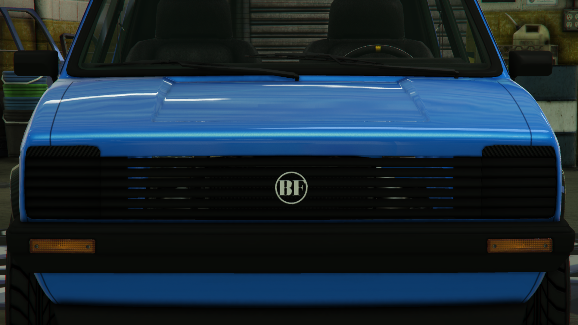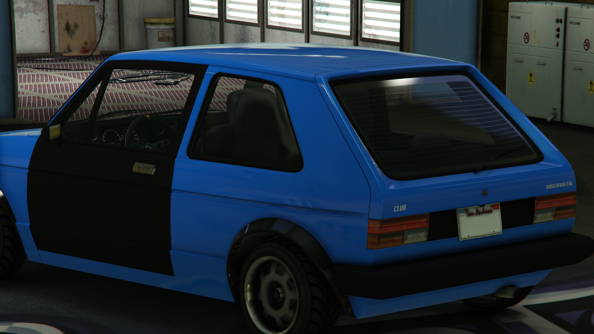 The Club returns to Grand Theft Auto Online in the Los Santos Summer Special update. Being manufactured by BF, it assumes an older design of the Volkswagen Golf Mk1. The front of the car is heavily inspired by the first-generation Ford Fiesta XR2, while the tail lights seem to bear resemblance to the Volkswagen Polo Mk1 or the Zastava Yugo Koral. The greenhouse area might come from the SEAT 133. The door handles are reminiscent of the SEAT or Yugo ones as well. Los Santos Customs features a variety of exterior modifications inspired by earlier variations of the Golf and more modern front and rear bumpers reminiscent of the 1984–2009 South African CitiGolf. The interior is an almost exact replica of the interior from a 1983 Toyota AE86, the only difference being that the air con controls and the radio are in slightly different positions.
