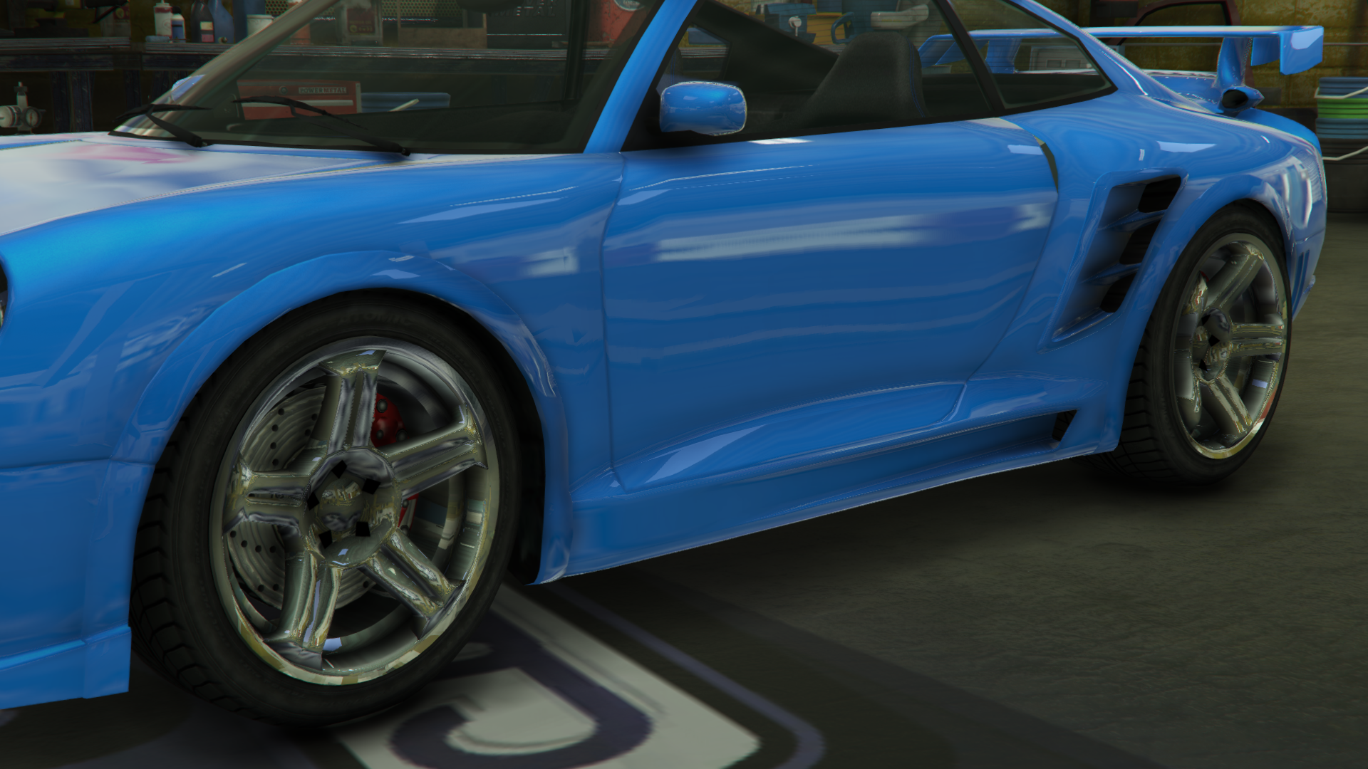 Colour distribution is the same as before, but the interior stitching matches with the body colour. The rims are similar to the ones from GTA IV, albeit featuring grooves on the spokes. However, there is a set of sport wheels in Los Santos Customs named "Super Five" which closely resemble the ones from GTA IV.