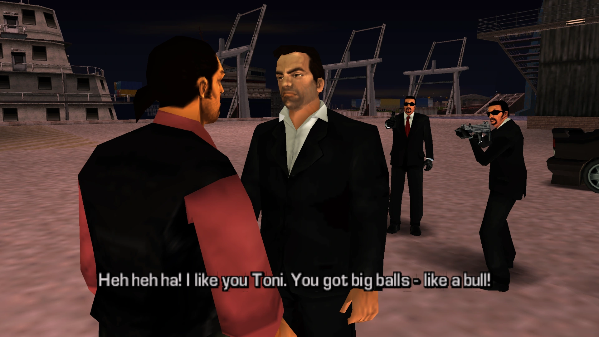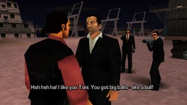 Toni takes three Leone Crime Family members with him to Portland Harbor, where it is revealed the drug dealers are Colombian Cartel members, with Miguel among the group. Just before the trade, however, the LCPD and FBI ambush the deal, and Toni calls Miguel a "greaseball fuck" for setting him up. Toni receives a three-star wanted level.