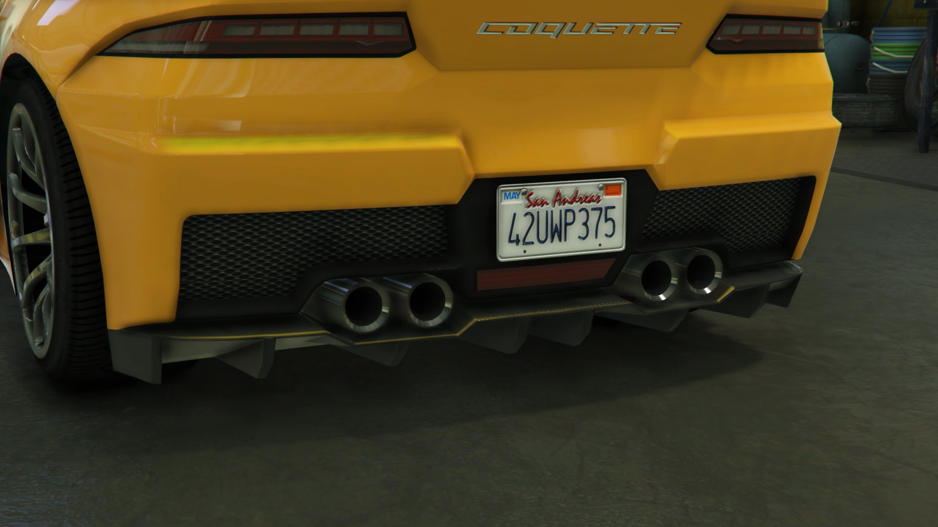 Coquettes spawn prominently in a single color, with the exception of a white and red one, where the red stripe is the secondary color. The car has five-split-spoke alloy rims wrapped by low-profile sport tires. The brakes are the same four very large, cross-drilled disc rotors found on the Infernus, Comet, and Turismo. Coquettes frequently have alarms.