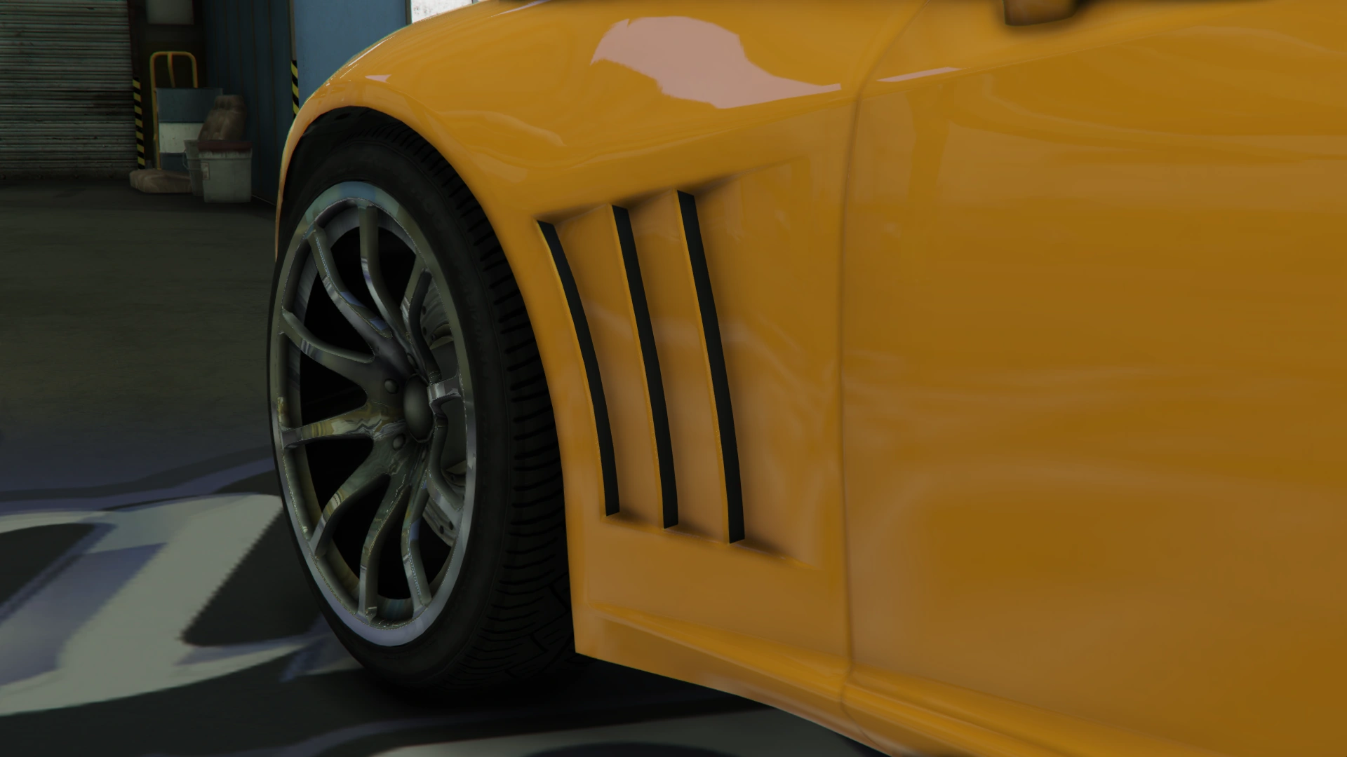 The fender vents on the sides have a different pattern, being triple vertical vents. The cabin's A-pillars are finished in black and the rear section features rear quarter windows and a separated rear window (opposed to the single rear window from the GTA IV iteration).