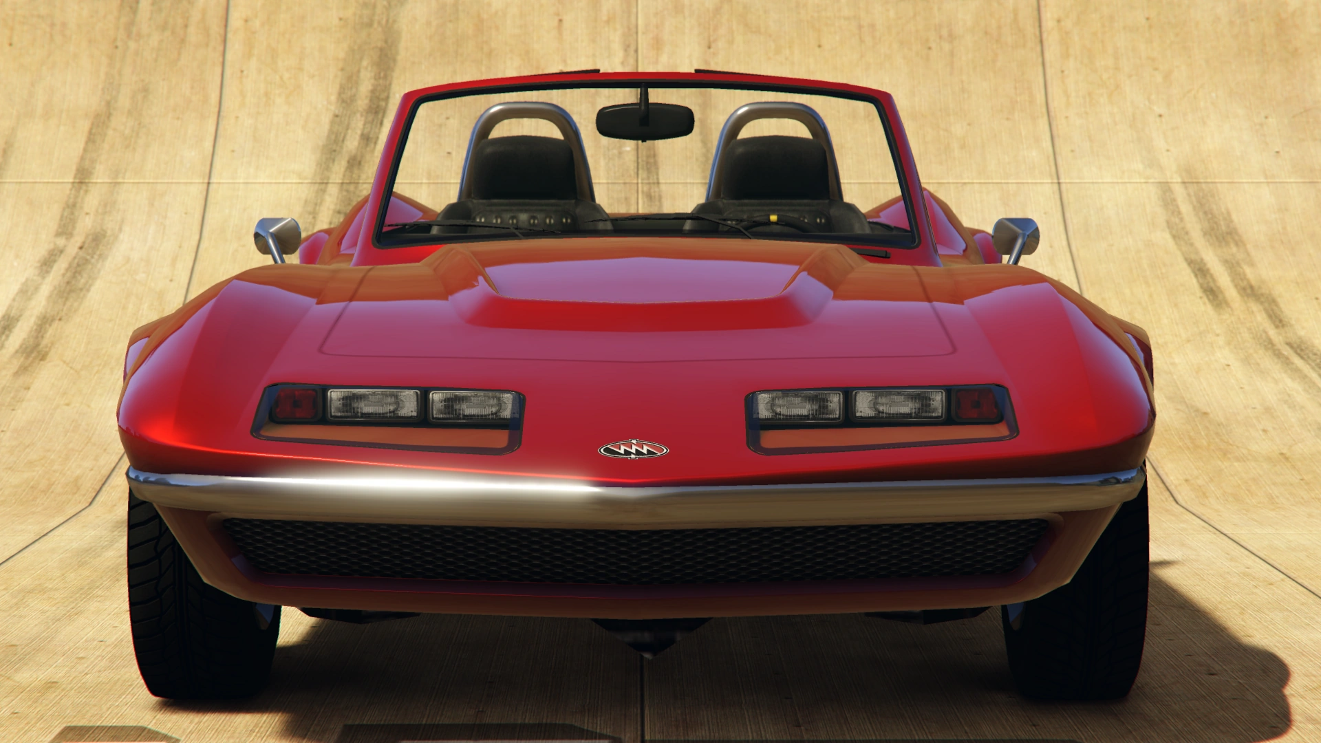 The car comes in two models: a hardtop coupe and a topless roadster. The hardtop version has a curved rear section with split windows, while the topless version uses a dedicated trunk. The vehicle uses a primary color for the body and a secondary color for the stitching. Its wheels uses the same rim design as the "Revolver" muscle rims available in Los Santos Customs.