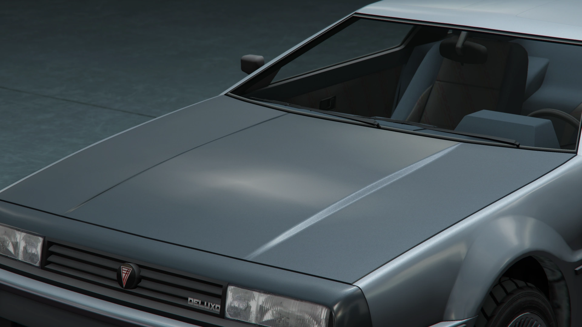 The interior of the car uses a large dial cluster in a similar way to cars such as the Turismo Classic and Cheetah Classic. However, it uses a black background with a green grid-like pattern for the main dials and the small gauges, with the warning lights displayed on squared details. The dashboard also has two rectangular aircon units on the edges and a horizontal vented unit in the center, while the radio set is visible on the central console. The inner portions of the seats and the central section where the handbrake is seen have unique red/green striped textures passing over. The steering wheel bears the Imponte logo. Interestingly, the Deluxo is stated in the files to use the same dials and part of the interior textures from the Sentinel Classic, a sports car which was released later.
