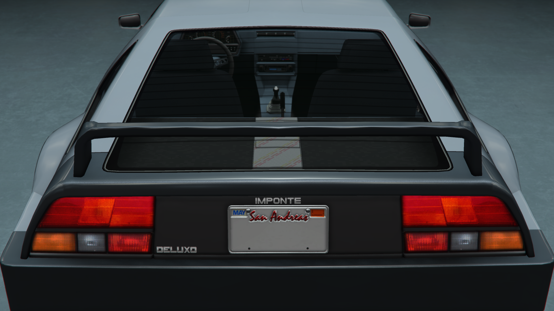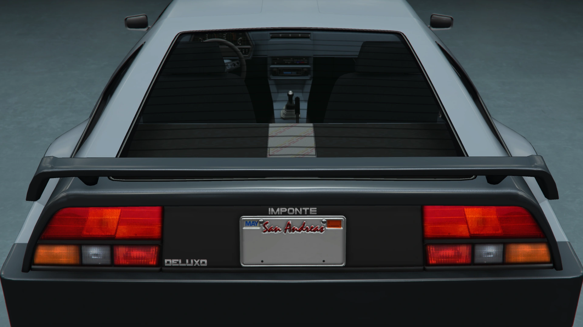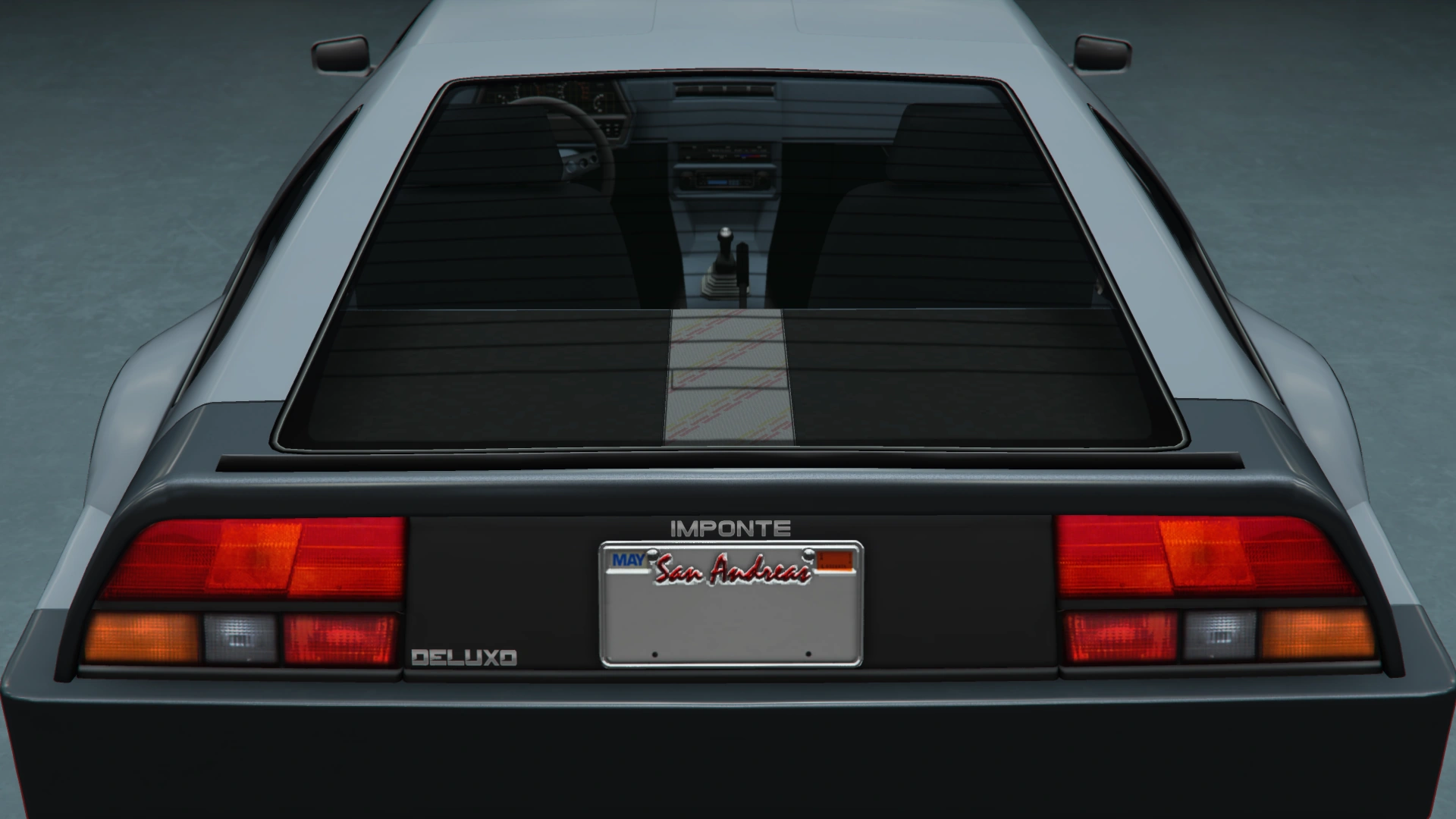 The Deluxo, like its real-life inspiration, is a rear-engine vehicle, powering the rear wheels through a 4-speed gearbox. However, by clipping the Rockstar Editor camera through the rear section, it does not have a model. The engine sound is shared with cars like the Buccaneer and the Nightshade.