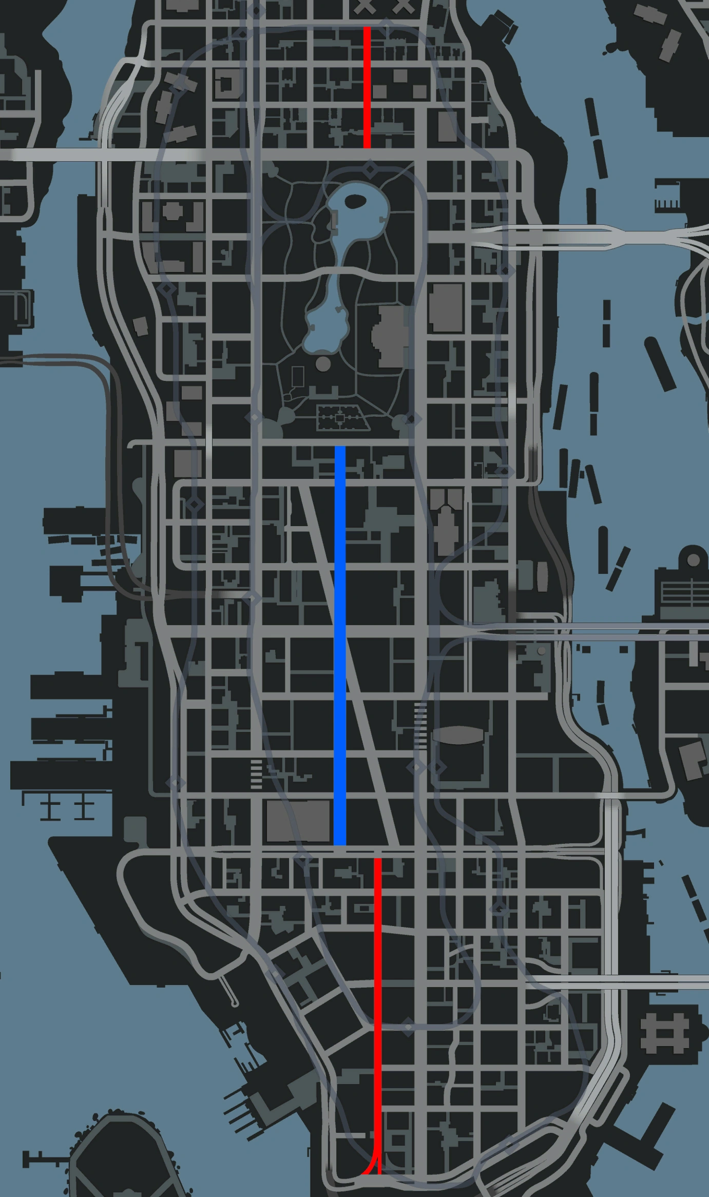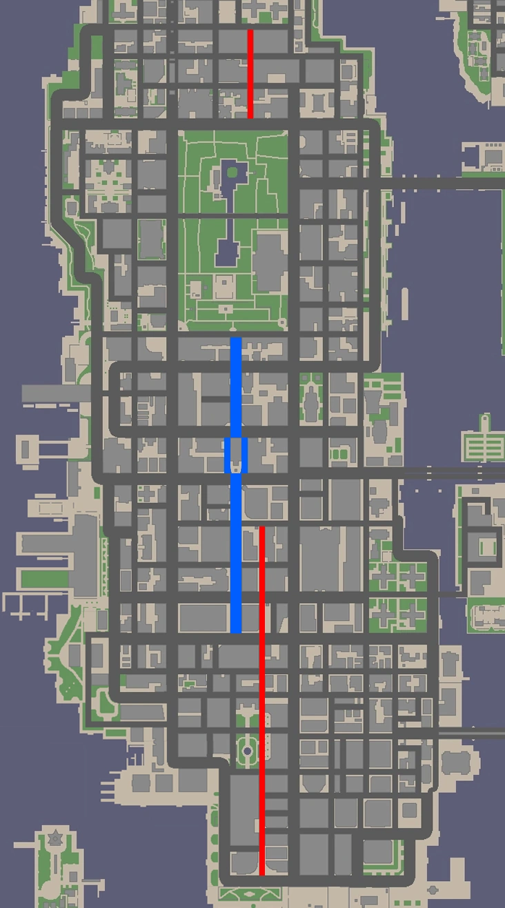 At the north end of the road, the geology of Northwood and East Holland causes a large descent in height as it approaches south towards Middle Park. Many low-end apartments, stores and businesses fill the area but become slightly more upper class approaching the Middle Park border. Continuing on from Star Junction, the road passes through the small district of Little Italy. This section of the road is cobbled and lacks road markings. Many Italian restaurants line the streets, with decorative Italian flag color-themed banners, flags and street lights. A contrasting backdrop leads into City Hall where tall, traditional buildings and upper-class stores line the southern Algonquin skyline, but seemingly loom around a central icon that is the City Hall Park, lined with trees, essentially dividing the district in two. Short-lasting, the avenue plunges into The Exchange, again bounded with high-rise offices, albeit more modern and taller. A short descent between Amethyst Street and South Parkway leads up to a road division where south-bound traffic is only able to make a left turn onto South Parkway. The avenue looks out onto the western region of Castle Gardens.