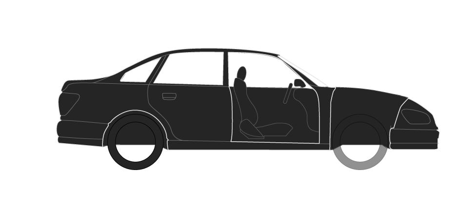 On the sides, the styling is very uniform, with many straight lines flowing throughout the body of the car, uninterrupted. However, the flared wheel arches are very exaggerated, which give the car depth. The cabin area is relatively curved and tall, with the window trims, inner pillars and rear-quarter sections finished in black, as well as the lines separating the roof panel from the rest of the car. A set of rounded mirror shells can be seen near the A-pillars, as well as an aerial on the rear section. The rear window of the trunk compartment door is very slanted, similar to the front windshield.