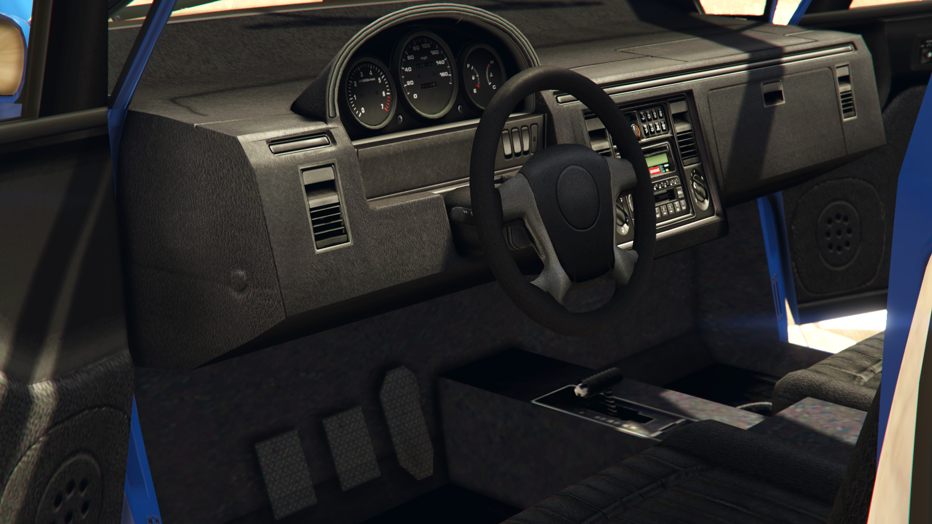 For Grand Theft Auto V and Grand Theft Auto Online, the Dilettante retains the same design and features as before, but the rear trunk compartment door bears a single badge on the driver-side lower corner, displaying the manufacturer name. In the enhanced version, it gains a restored interior used on cars like the Taxi and the Police/Sheriff Cruiser.
