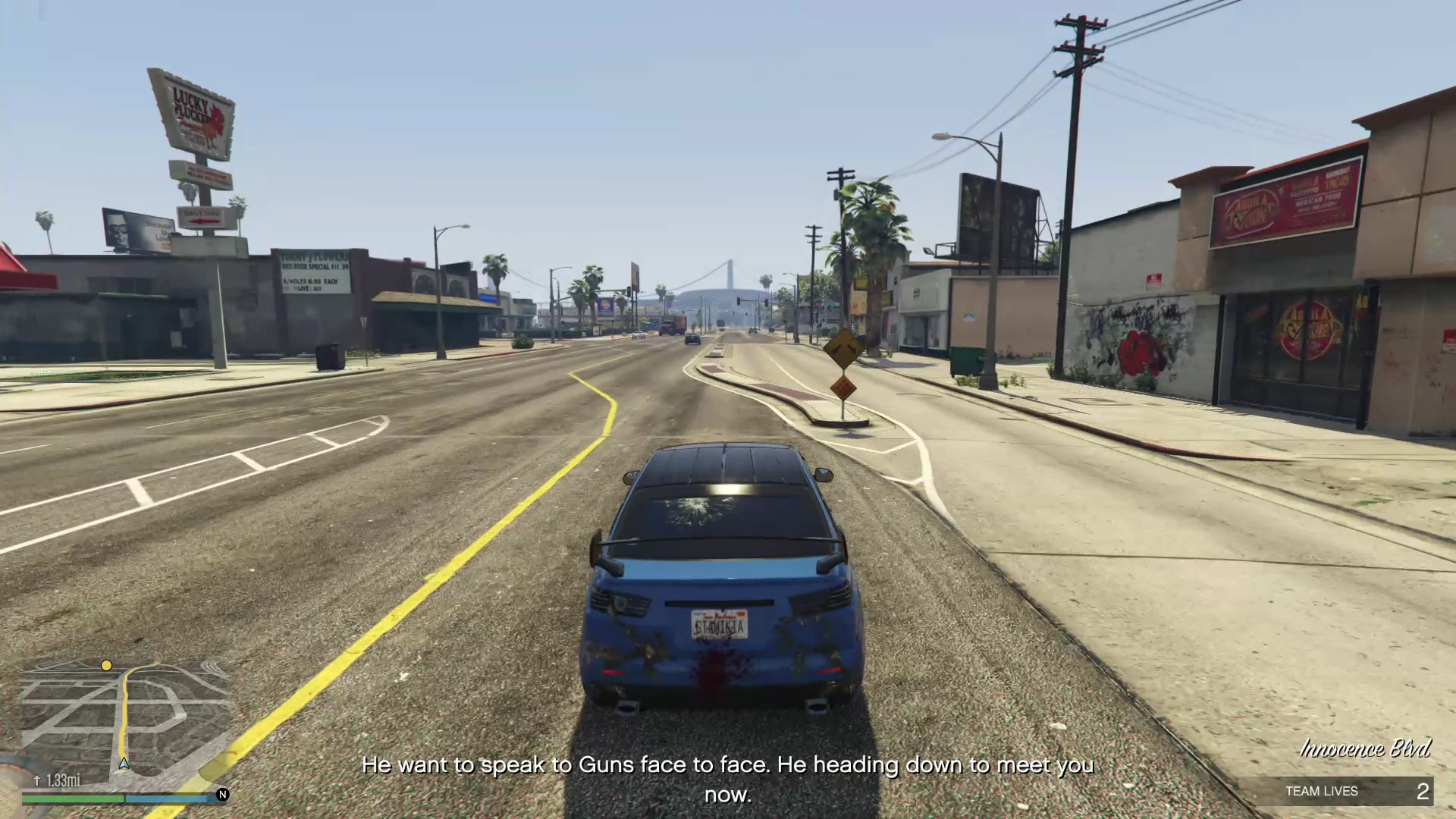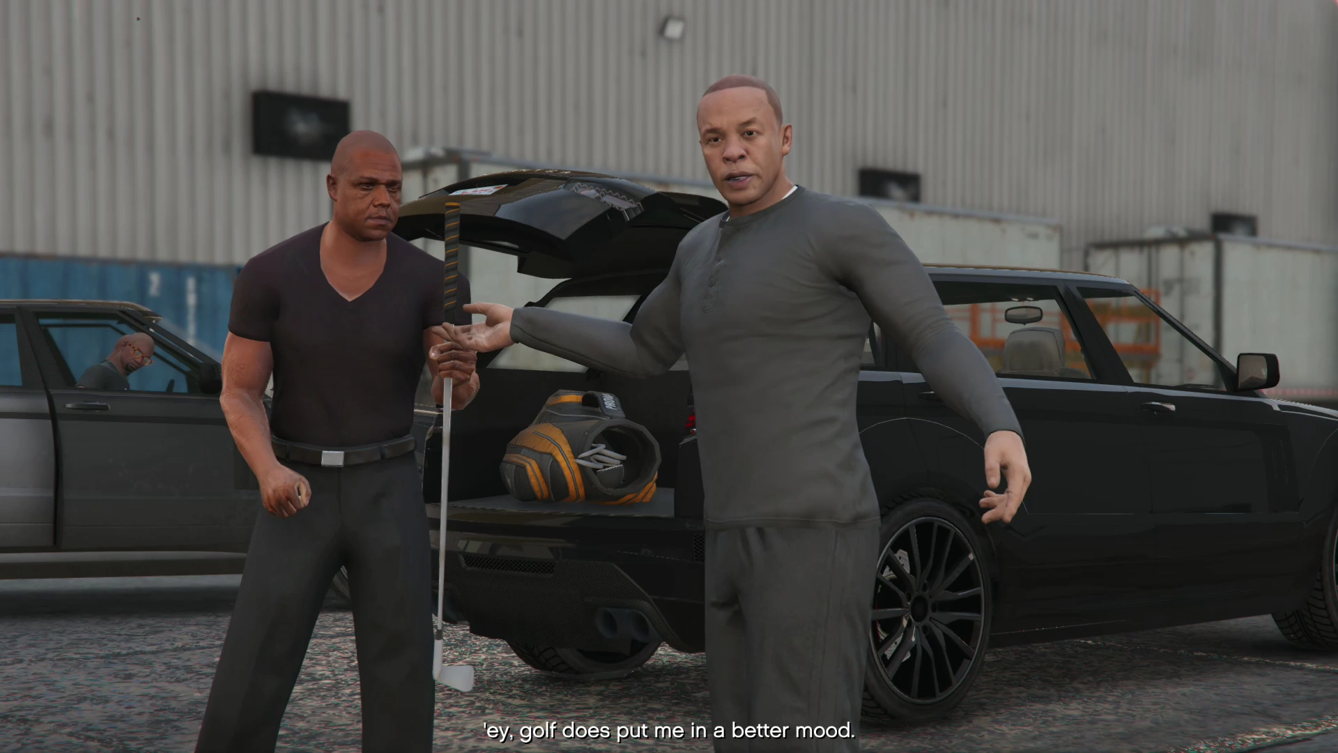 'ey, golf does put me in a better mood. (to the Protagonist) Alright, can you give me a ride home? I got somethin' I want you to hear. Let's ride. |