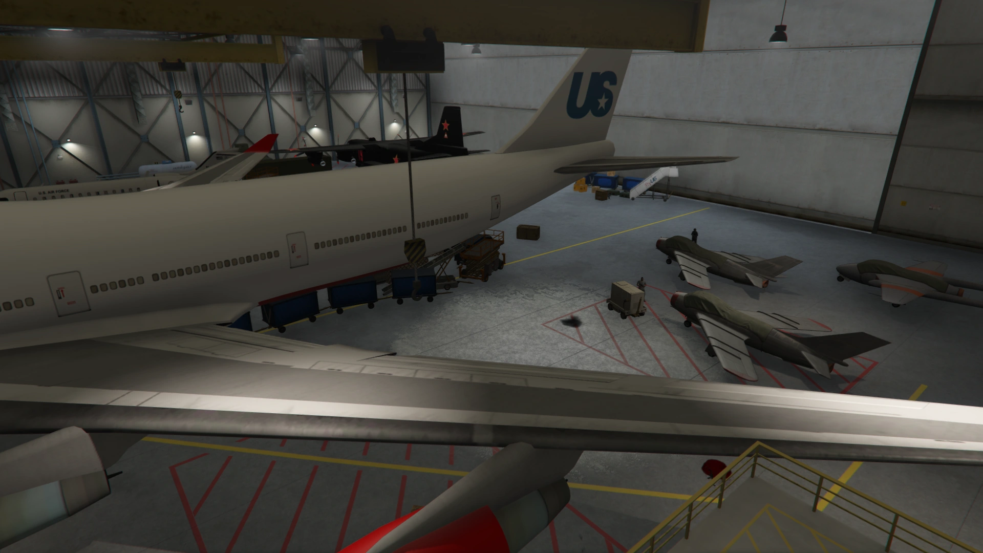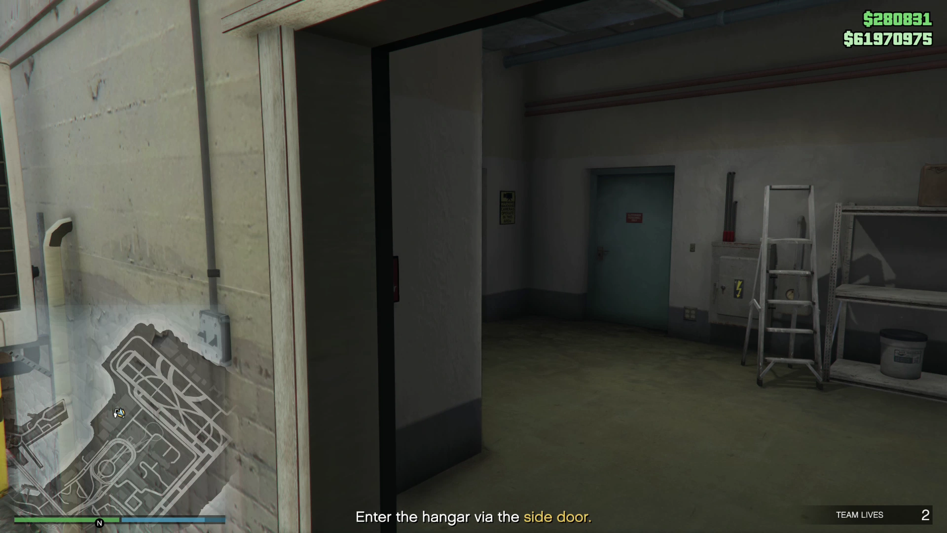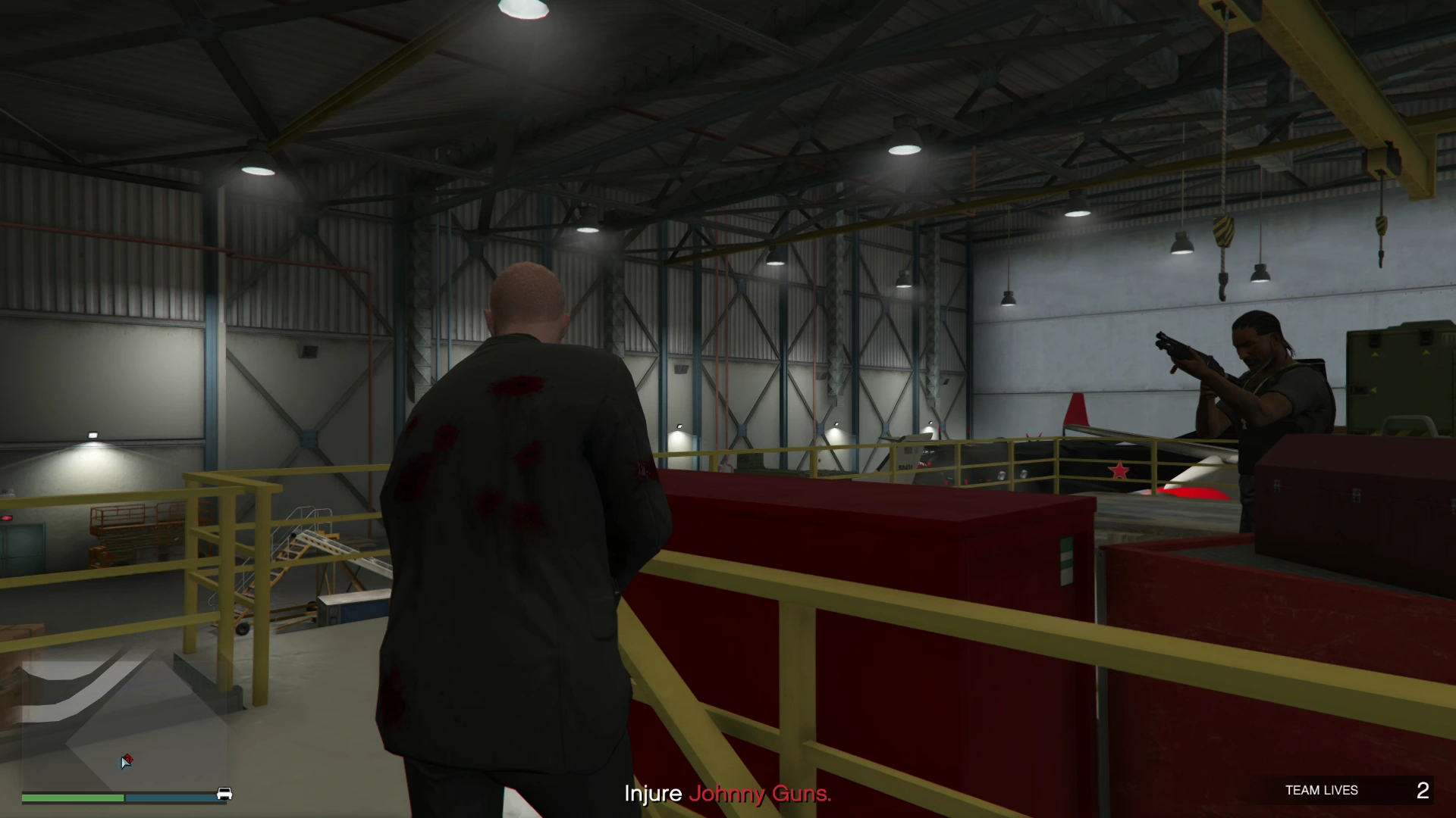 | The Protagonist enters the hangar through a side door then takes down numerous gunmen standing in their way. |