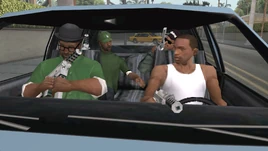 | CJ, Sweet, Ryder and Big Smoke pull up near Sweet's house. |