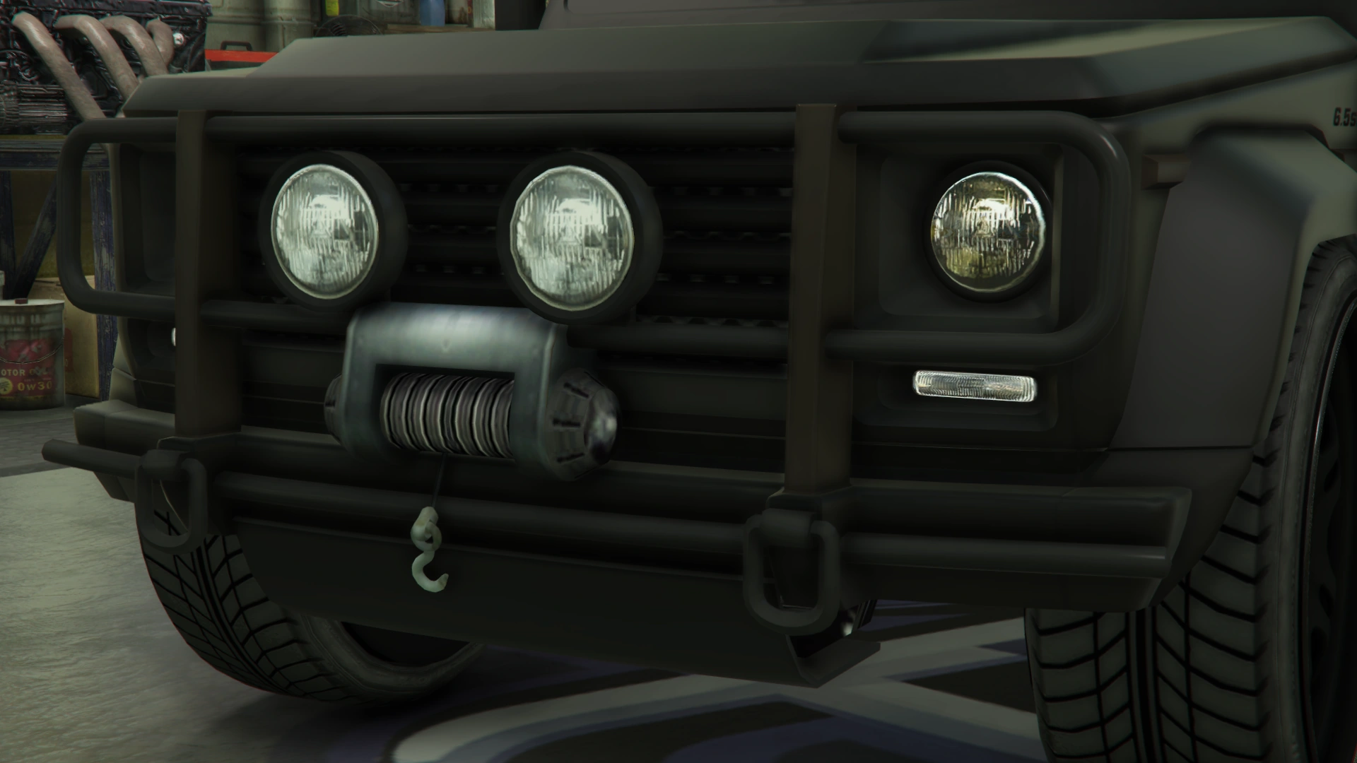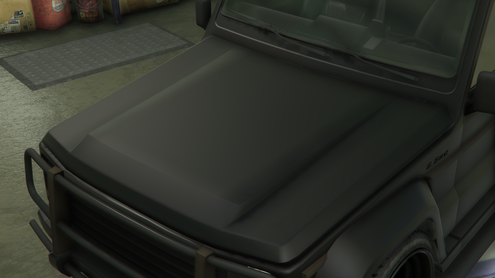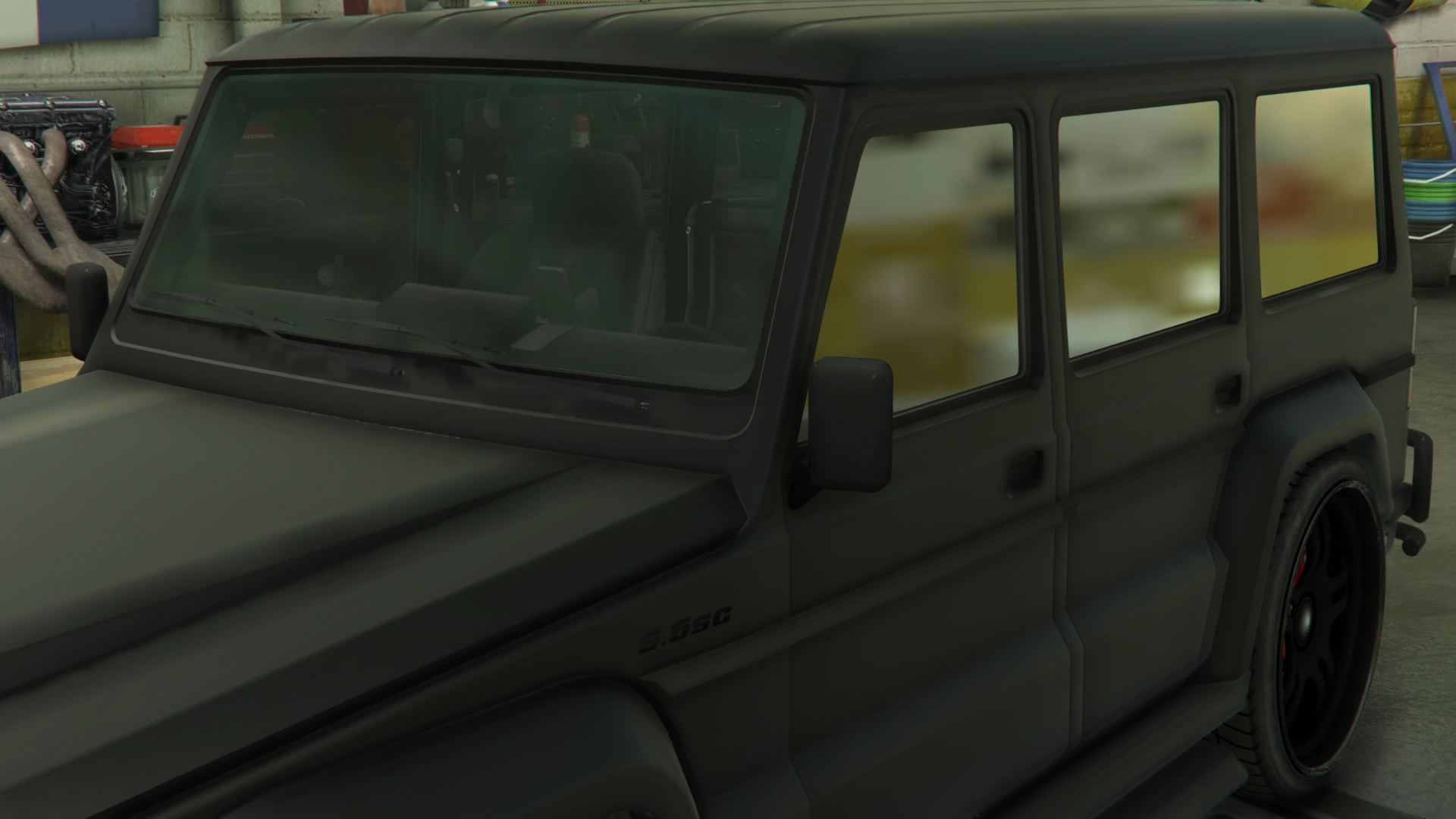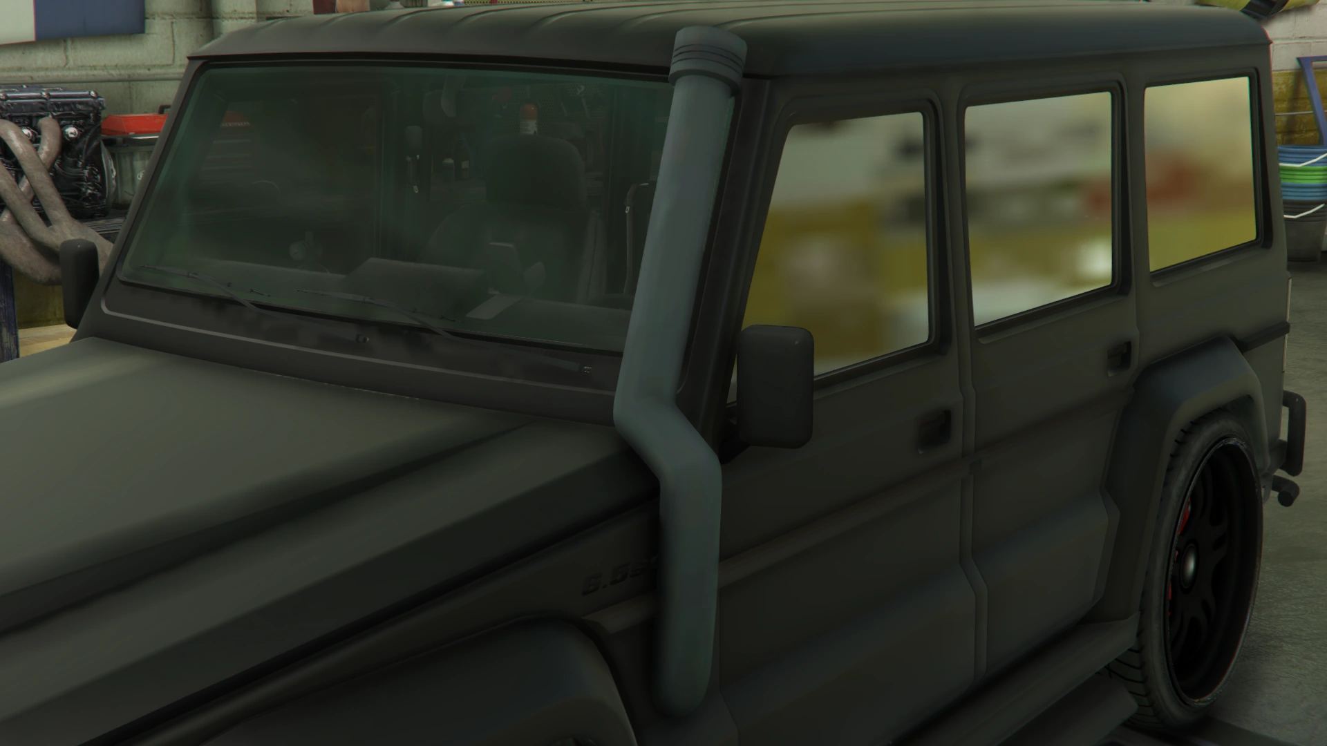 There is a modified version of the Dubsta which features the same design as the regular Dubsta, but all of the trim and chrome details have been blacked-out and also features more shallow roof indentations. The vehicle is set to spawn with various extras that are also available as modifications for the normal Dubsta, being a Black Bullbar, Black Rear Guard, Black Grille, Spare Tire and Black Side Steps. The car also has an unknown window tint applied by default.[2] The design details of this variant seem to be inspired by the Mercedes-Benz G Class models modified by the aftermarket tuning company Brabus.