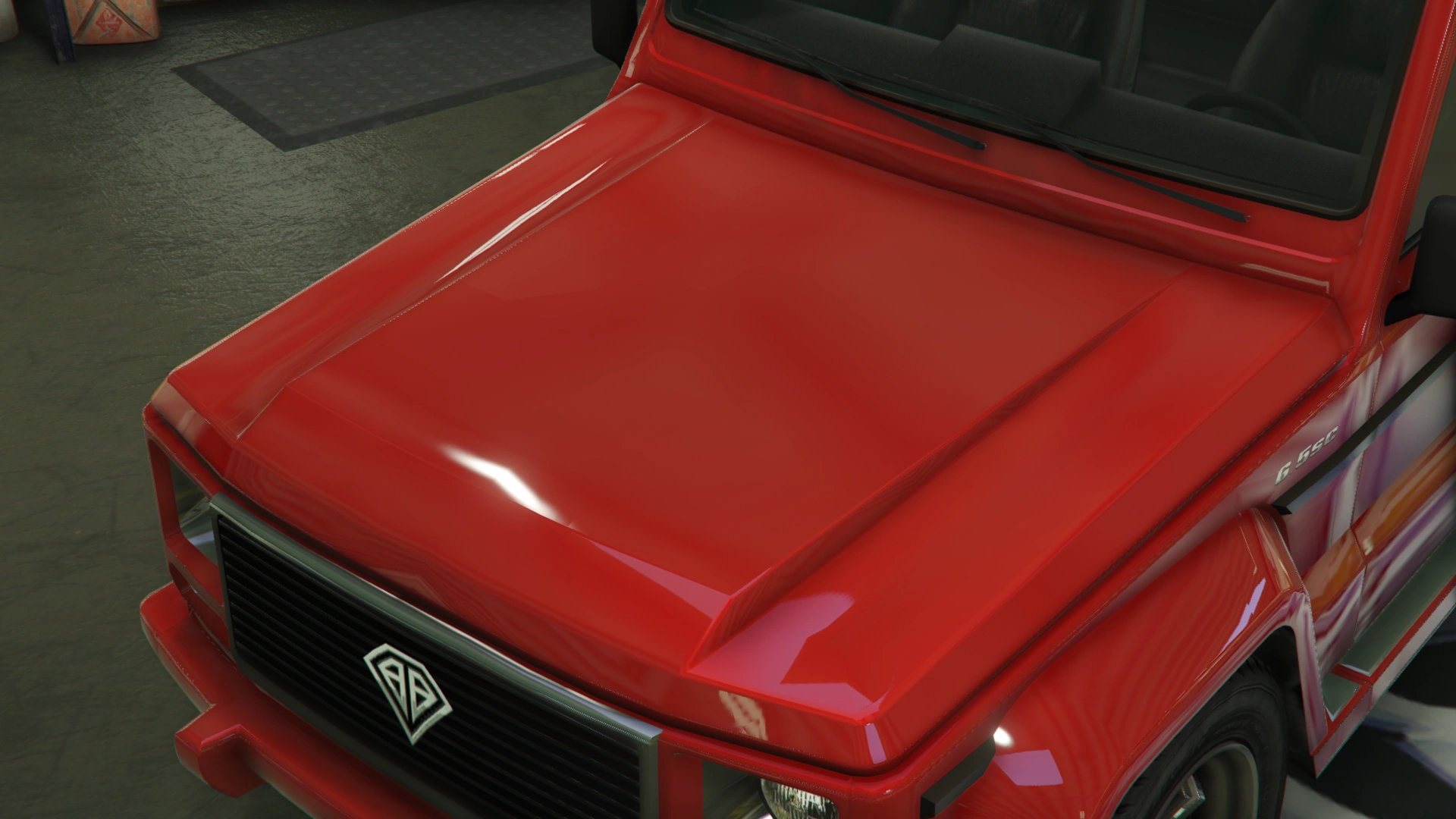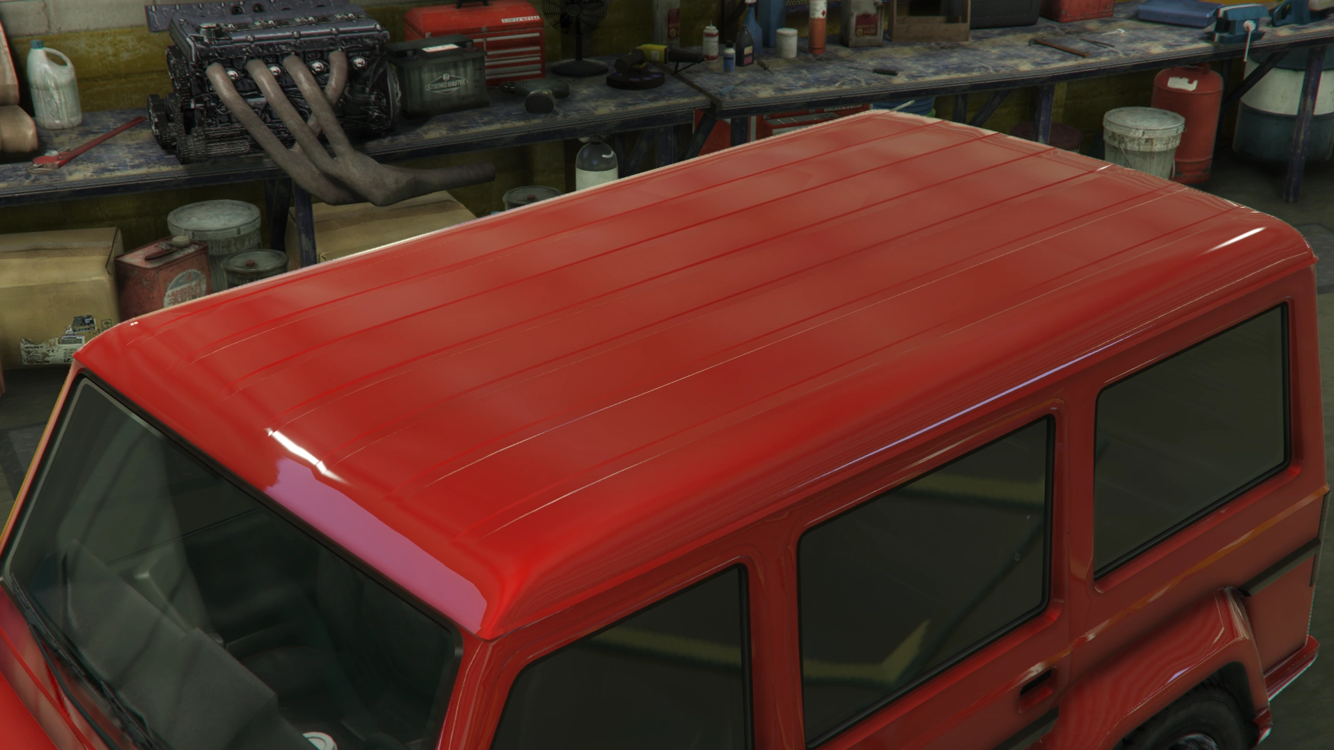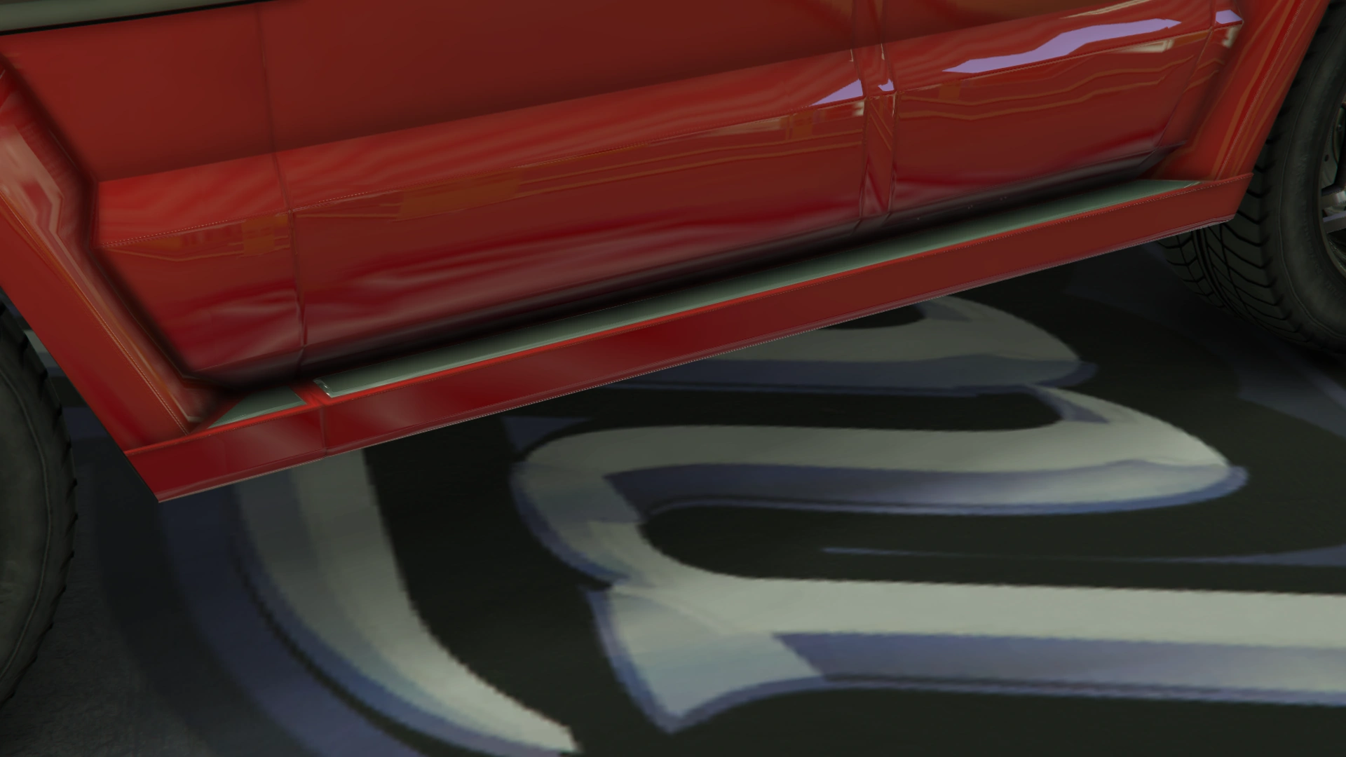 The primary colour of the vehicle is applied on the bodywork and the interior stitching, while the secondary colour is applied on the front bumper, arches, the bottom of either side, and the roof. Its wheels appear to be a derivative of the "Benefactor" SUV wheels available at Los Santos Customs, but having a concave shape on the centre, and using high-profile tyres. While the rims themselves cannot be painted due to the permanent chrome finish, the pearlescent colour gives the rims a slight tint/shade on it.