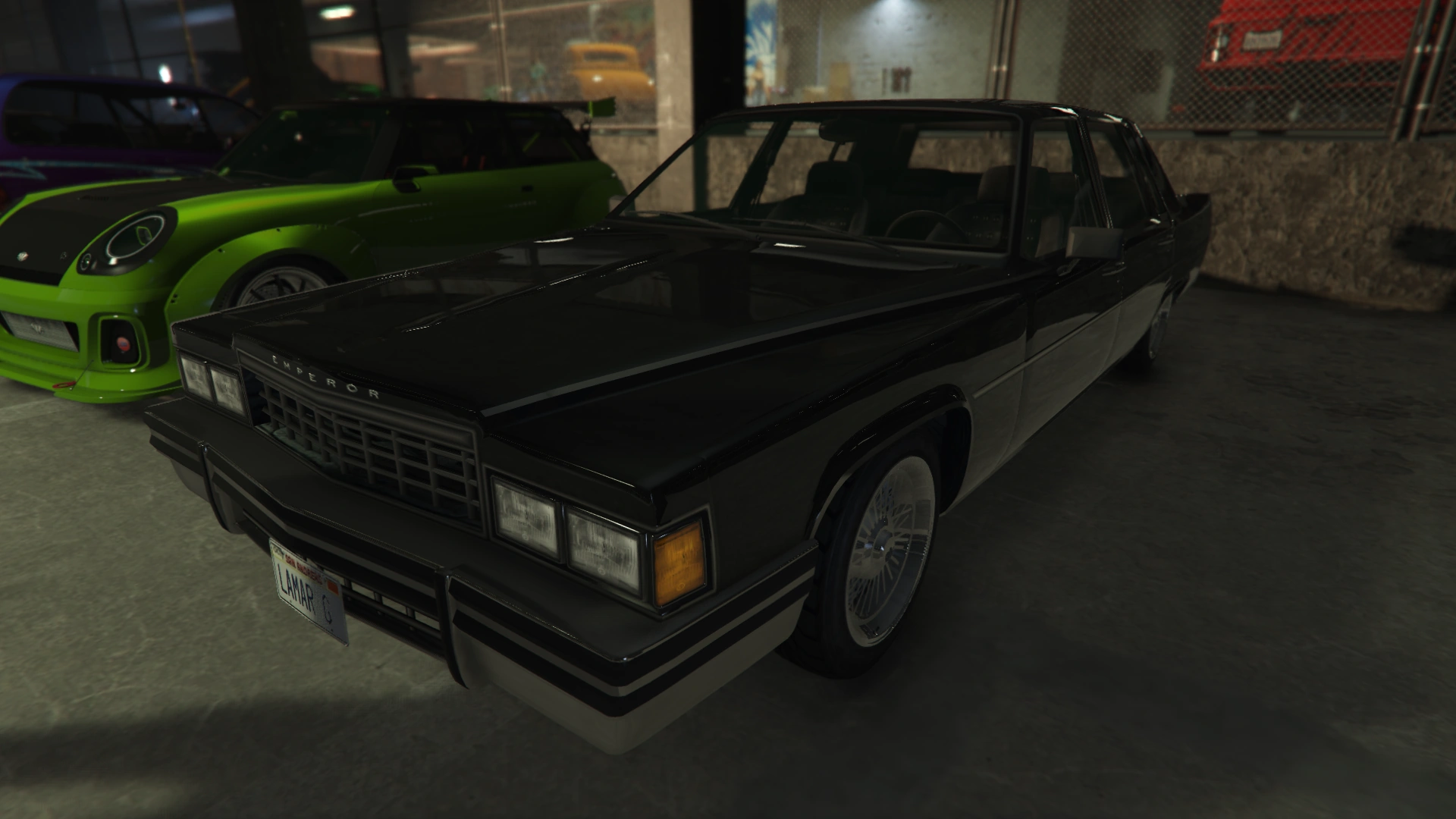 Lamar's Emperor, painted black inside the LS Car Meet in mid-2021 (Rear view)