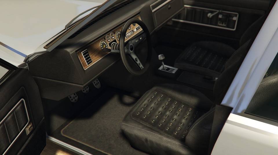 The Emperor returns to GTA V and GTA Online with an identical overall profile and design, but with slight deviations, such as a black "eggcrate" grille replacing the chrome mesh, a wider bottom grille, more pronounced detailing, different windshield wipers, a black finish on the side mirrors, and the removal of white-wall tires, giving the Emperor a somewhat less luxurious appearance than its previous iteration.