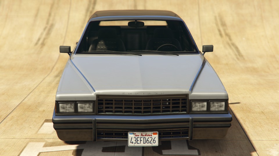 The normal Emperor can take multiple impacts to the engine, chassis, suspension, and tires without taking significant damage that will disable the car, and it is considered one of the most underestimated and under-rated cars in terms of overall durability. The engine, as stated before, is unspectacular, but does have decent torque, which allows the large and bulky car to accelerate very quickly and also enables it to take on off-road courses that some other cars in the same class may have issues with (such as climbing Mount Chiliad). The car is fairly large and has one of the largest trunks in the game. It seats four occupants. The car's torque, combined with its weight, durability, and apparent body on frame design allows it to obtain an impressive amount of momentum at full speed, and the Emperor is easily capable of barreling through Police Roadblocks, and is also rarely affected by other cars slamming into it or ramming it. It is one of the most durable cars in the game.