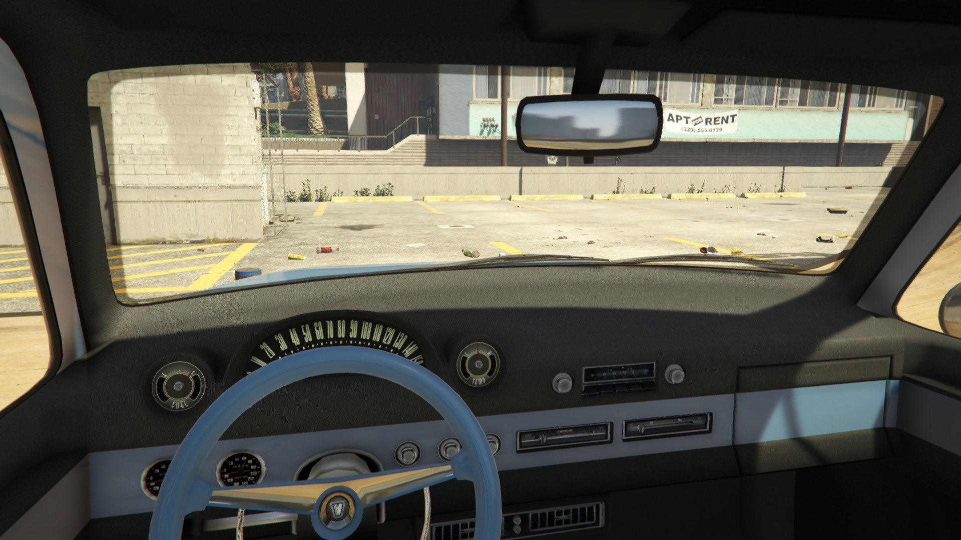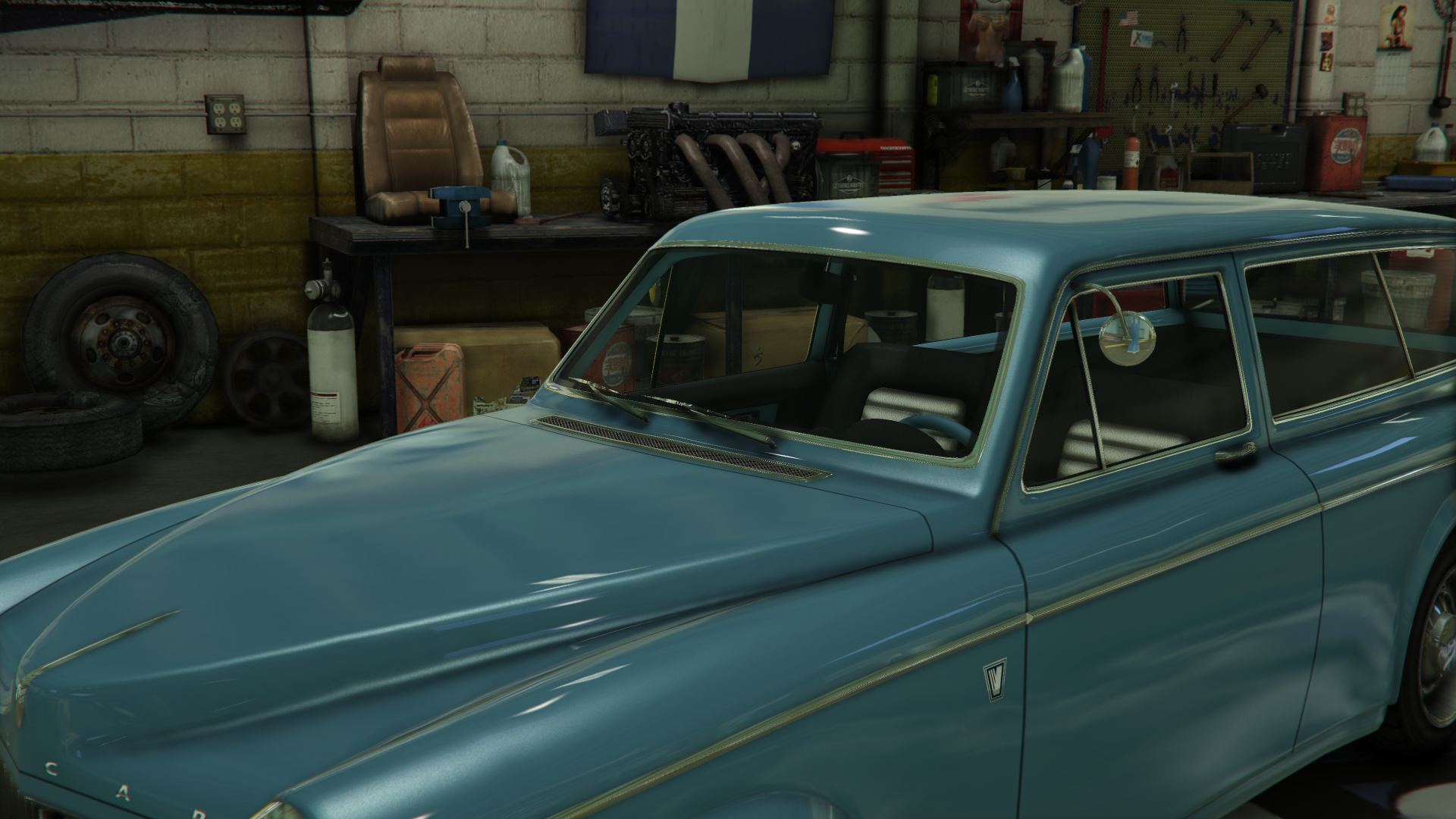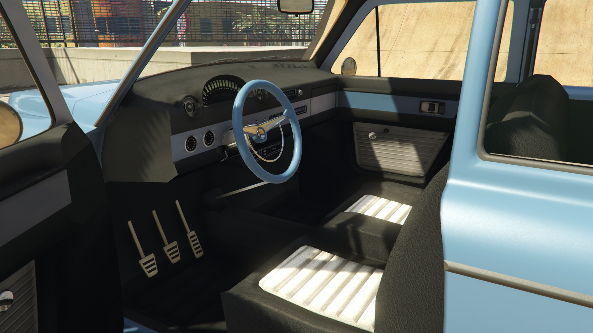The interior of the car uses the same dial set and details from cars like the Peyote and the Voodoo Custom. However, the metallic strips on the dashboard and the doors are not present, likely to make way for the wooden strips installed with the "Wooden Interior" modification.