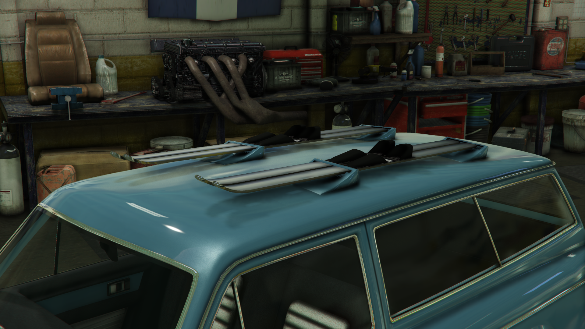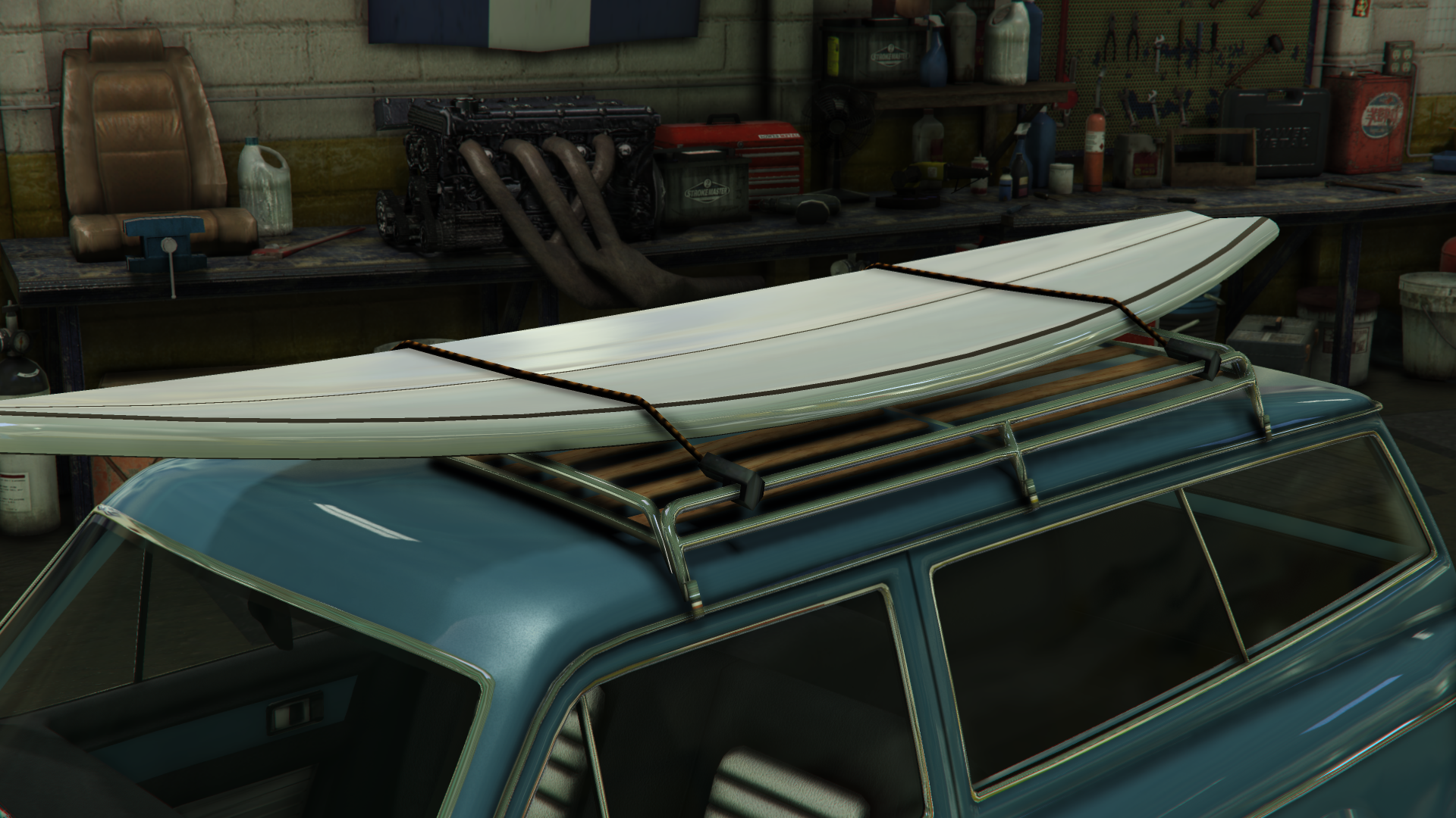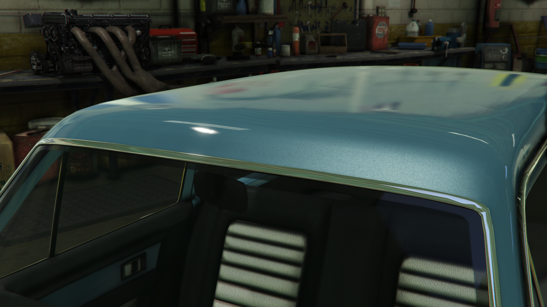 The interior of the car uses the same dial set and details from cars like the Peyote and the Voodoo Custom. However, the metallic strips on the dashboard and the doors are not present, likely to make way for the wooden strips installed with the "Wooden Interior" modification.
