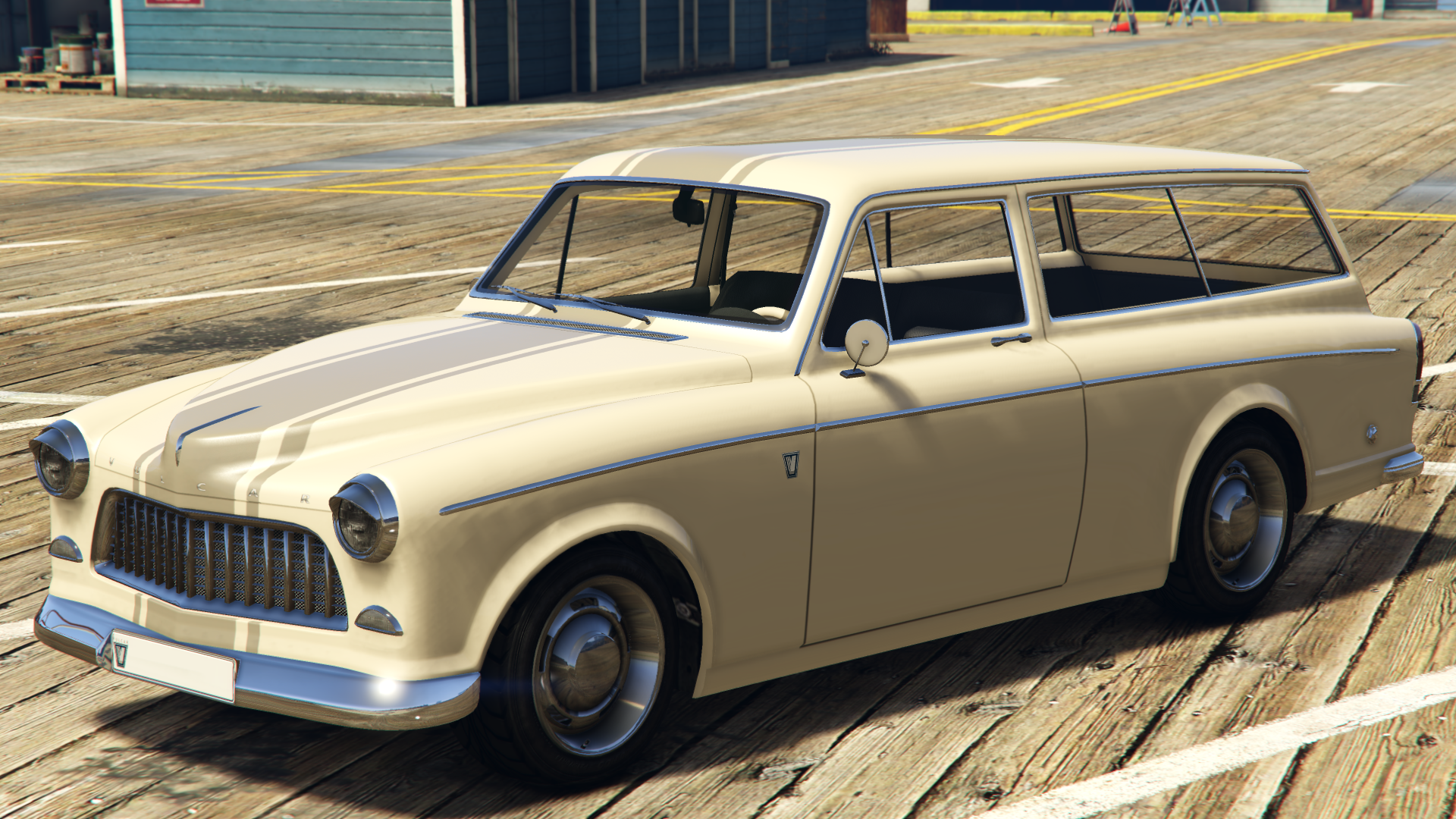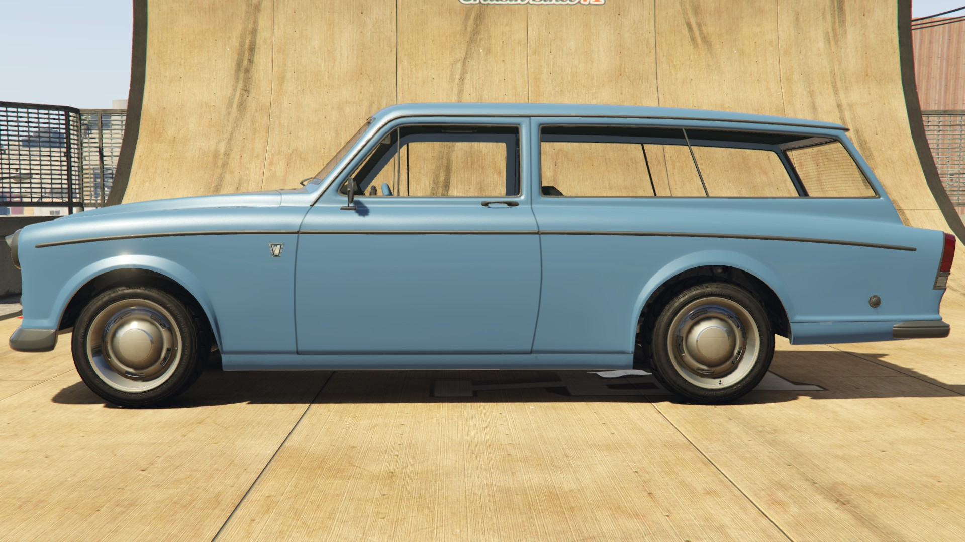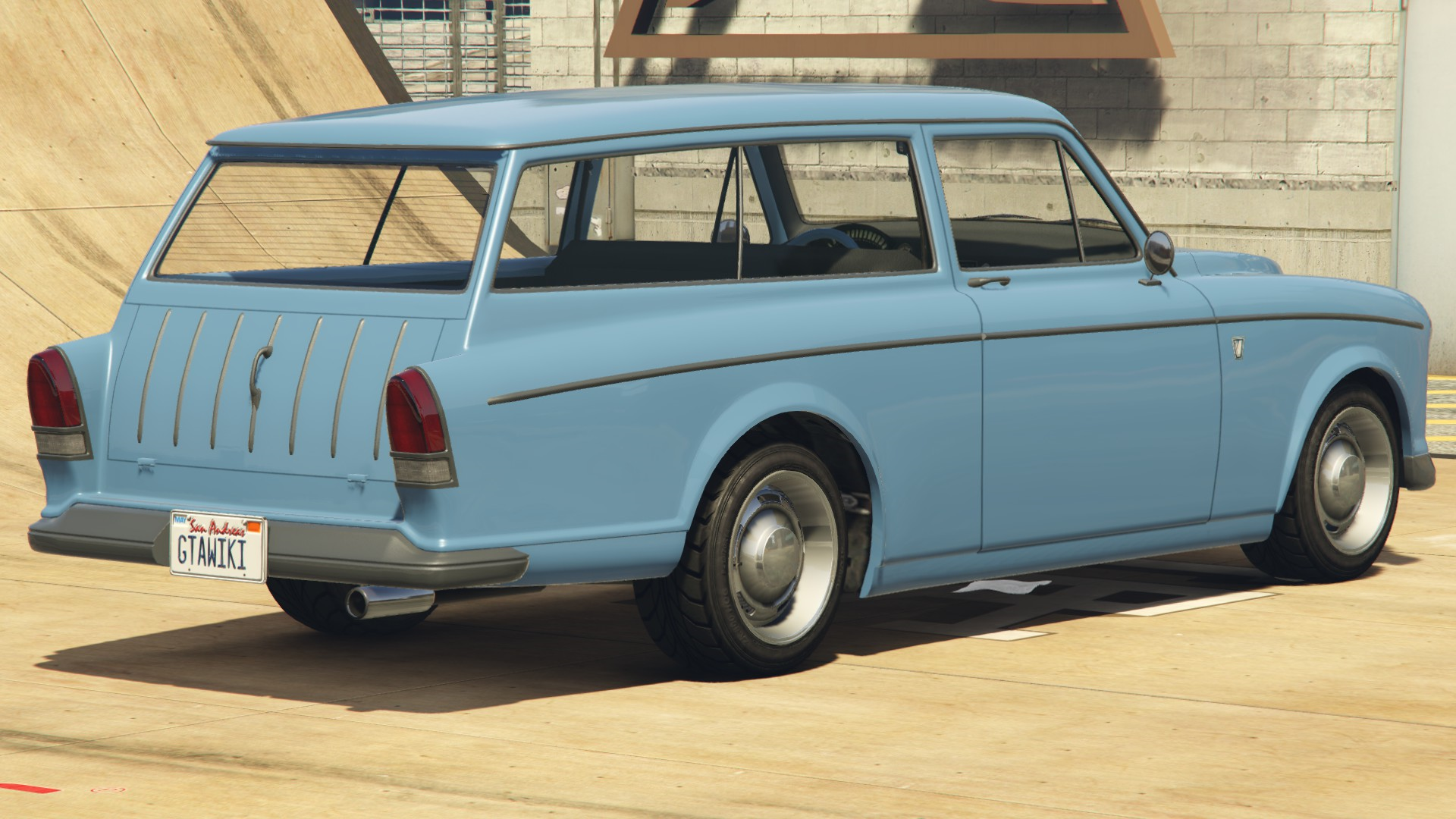 The primary colour of the car is applied on the bodywork and the strips on the dashboard and doorcards, while the secondary colour is applied on the bumpers, grille and trims around the windows and on the sides. A trim color is also available the majority of the interior. It uses a set of rims that are similar to the "Old School" muscle rims available in Los Santos Customs, but they have large hubcaps on the centre, in a similar way to the Police Transporter and the Youga Classic.