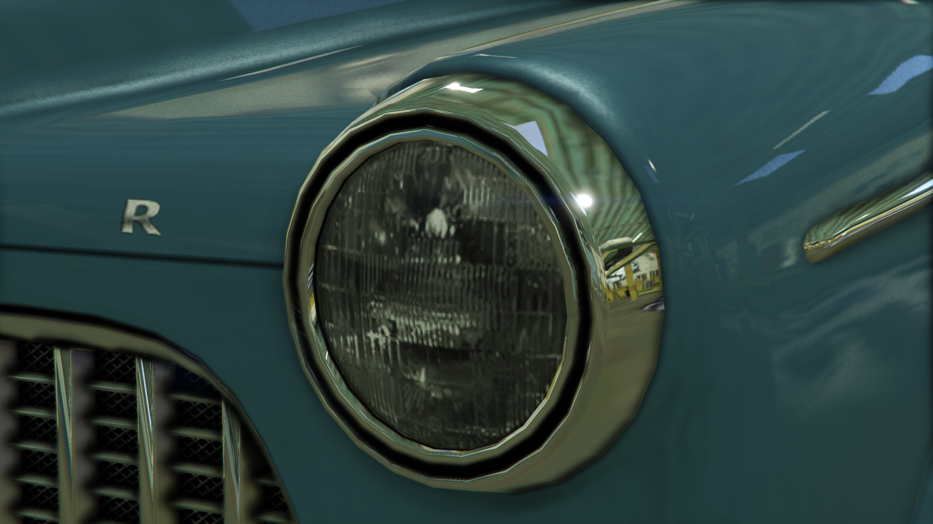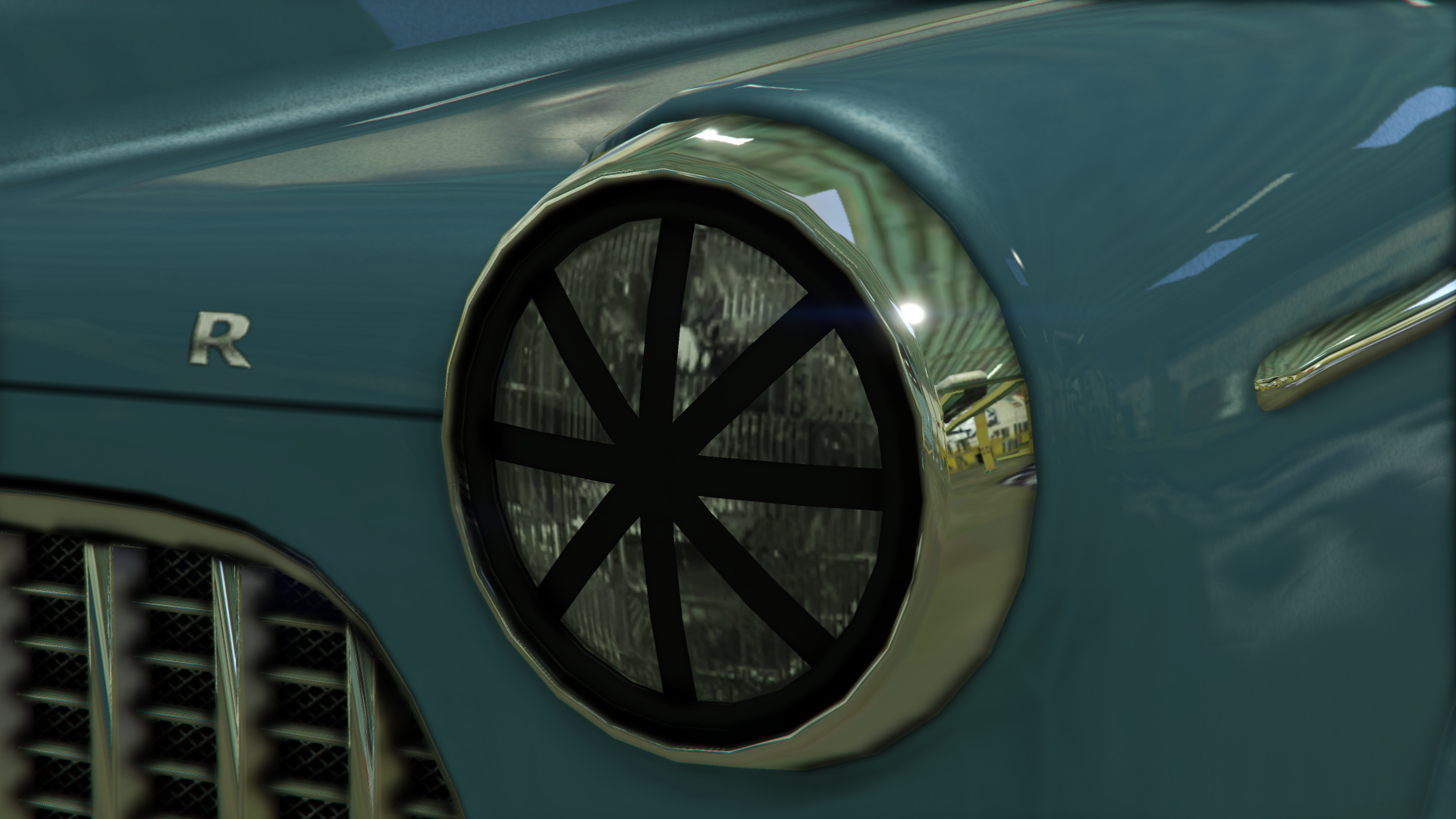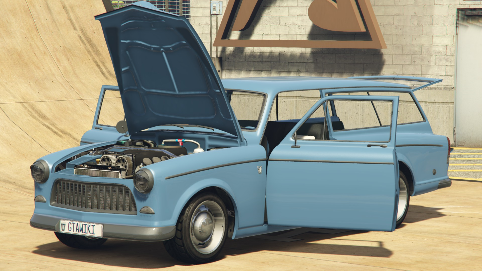 The primary colour of the car is applied on the bodywork and the strips on the dashboard and doorcards, while the secondary colour is applied on the bumpers, grille and trims around the windows and on the sides. A trim color is also available the majority of the interior. It uses a set of rims that are similar to the "Old School" muscle rims available in Los Santos Customs, but they have large hubcaps on the centre, in a similar way to the Police Transporter and the Youga Classic.