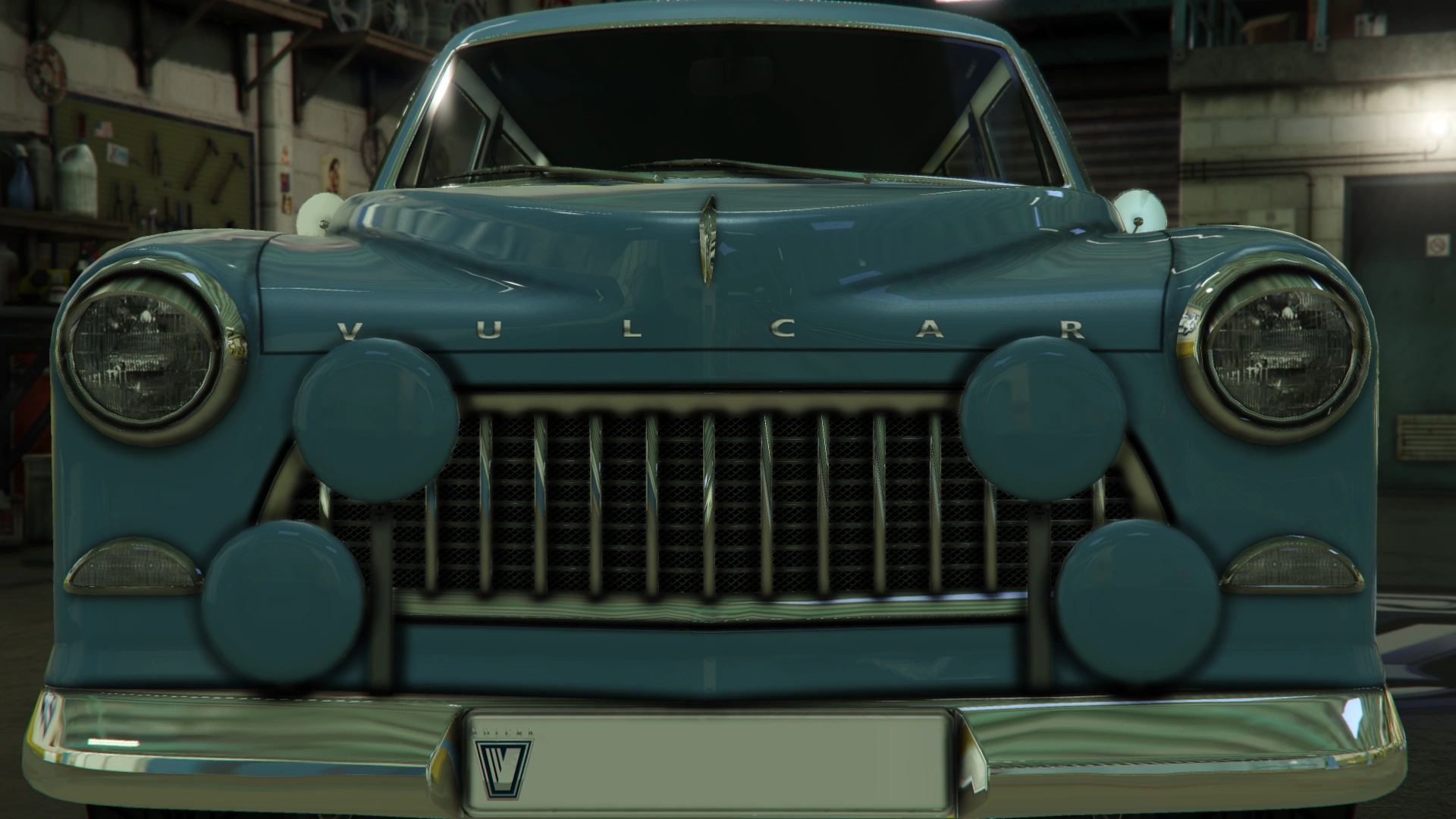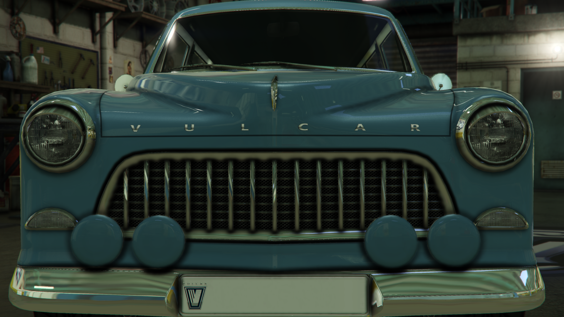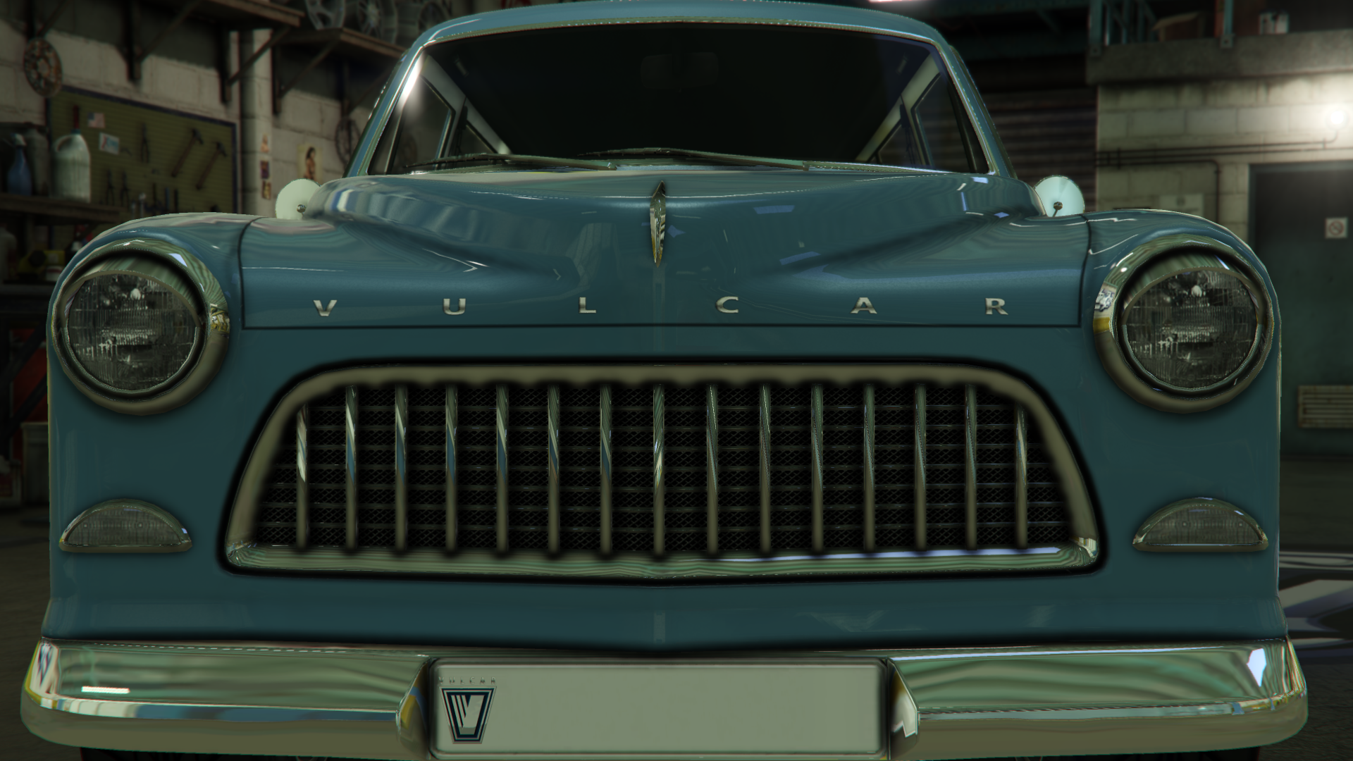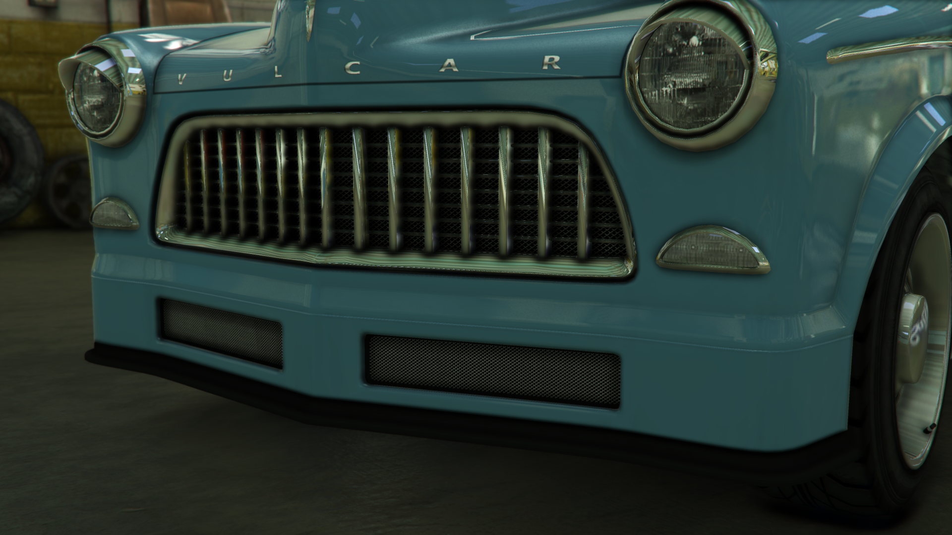 The sides of the car are very traditional, featuring slightly-flared arches and two details running through the sides, along with Vulcar badges near the doors and a fuel cap on the rearmost area of the rear left fender. The cabin area has inner pillars on the door windows and the rear side windows, as well as circular rear-view mirrors on the doors, near the A-pillars.