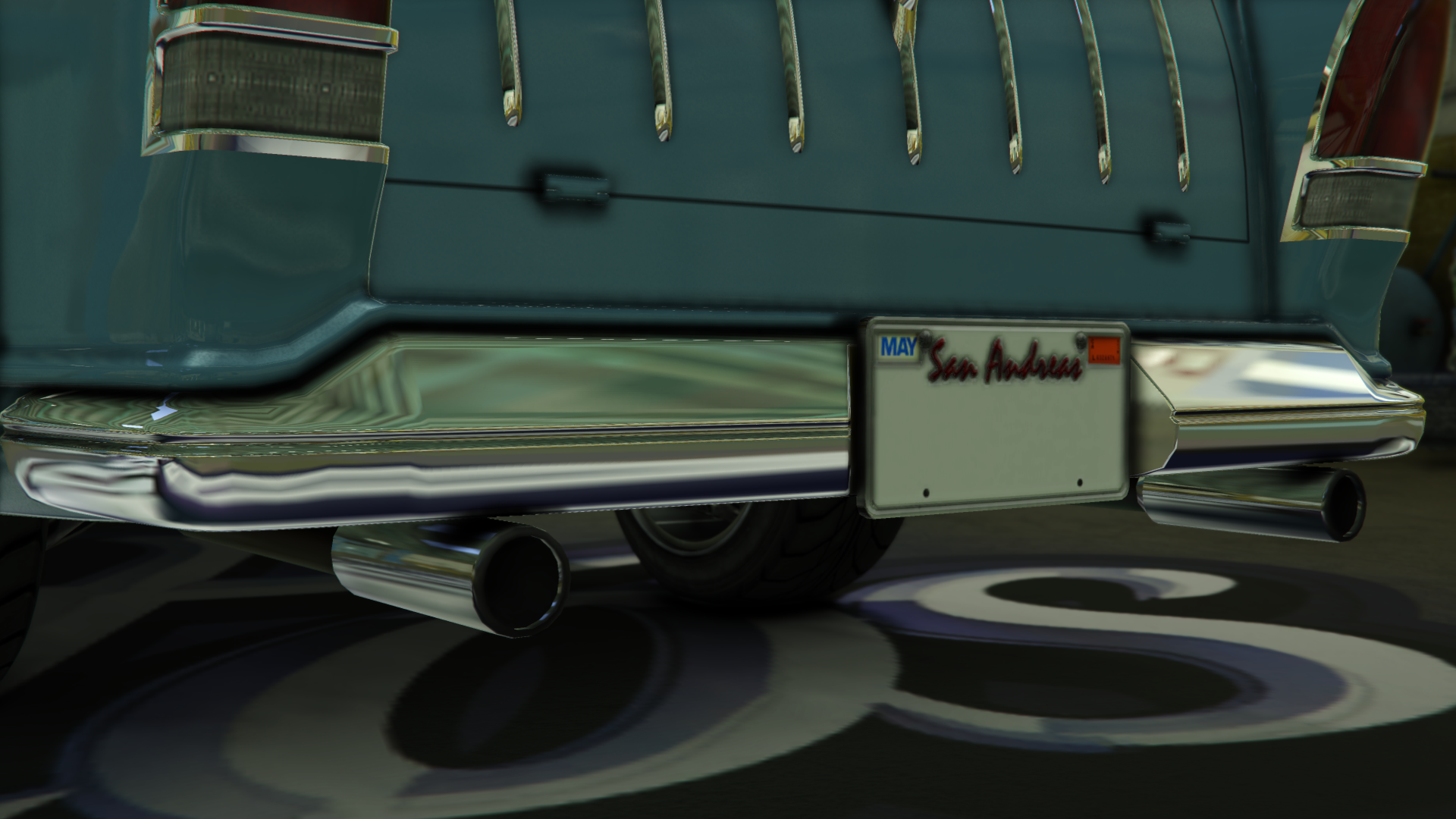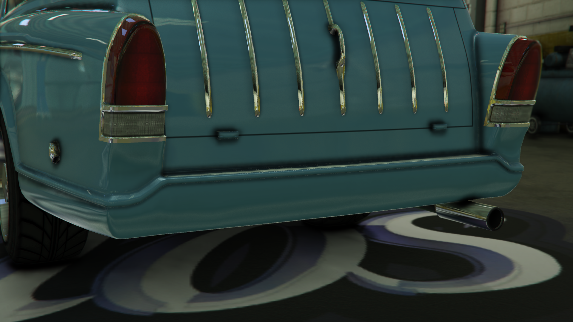 The rear of the car features dual boot compartments on the centre, with the lower one having a single handle and various vertical details on it. The outer edges of the car has protruding tail lamp units, consisting of upper red lamps and lower reverse lamps. A small bumper spans the whole width of the car and holds the standard California-style plate on the centre, while a small exhaust tube can be seen below it, on the passenger side.