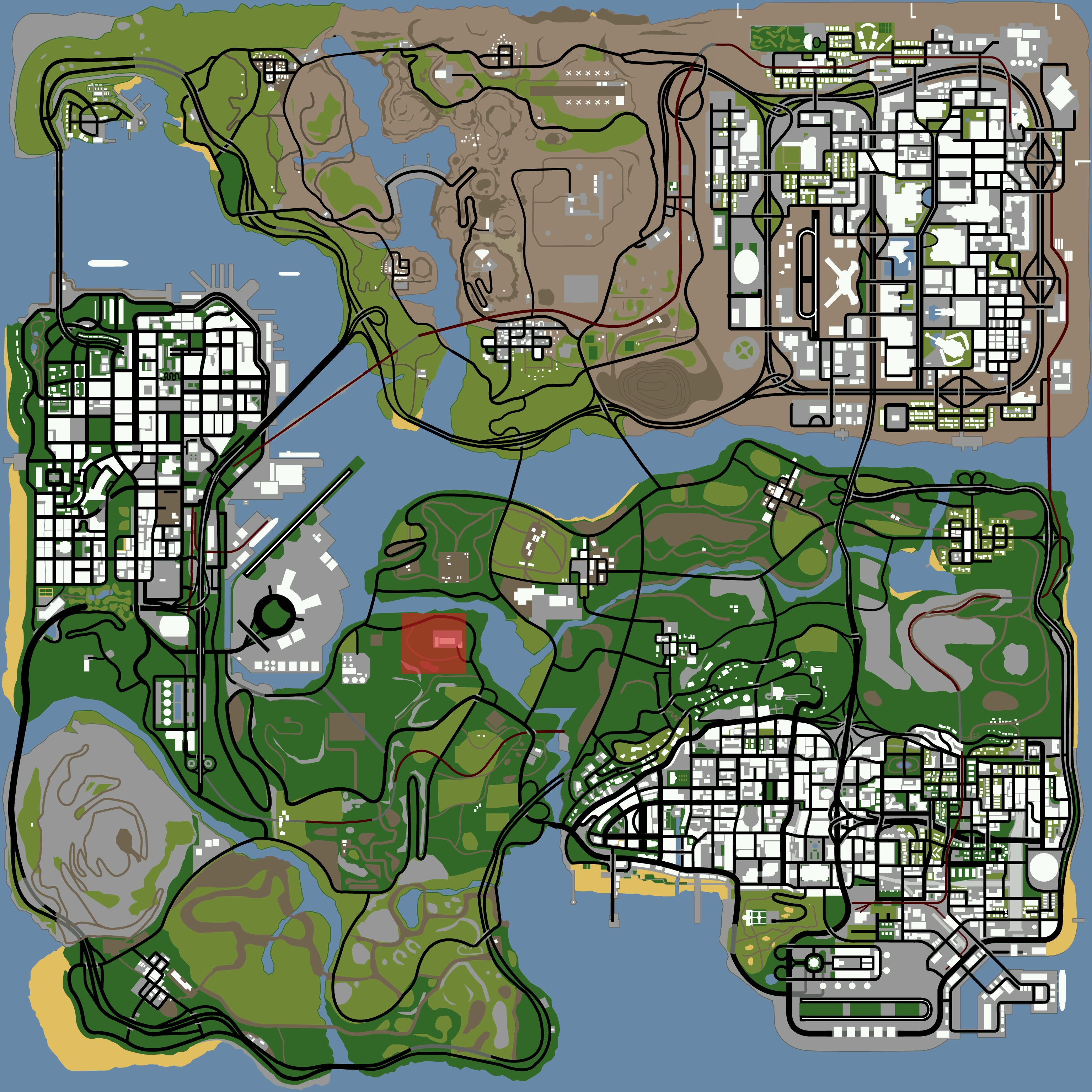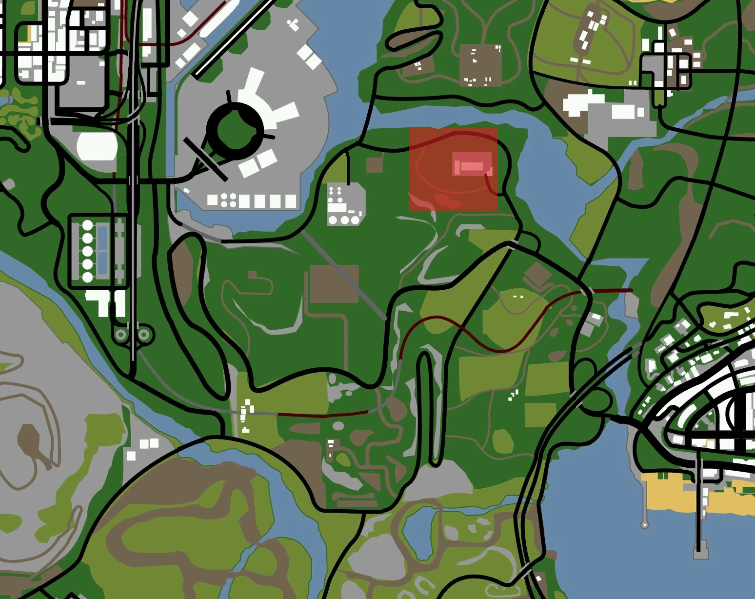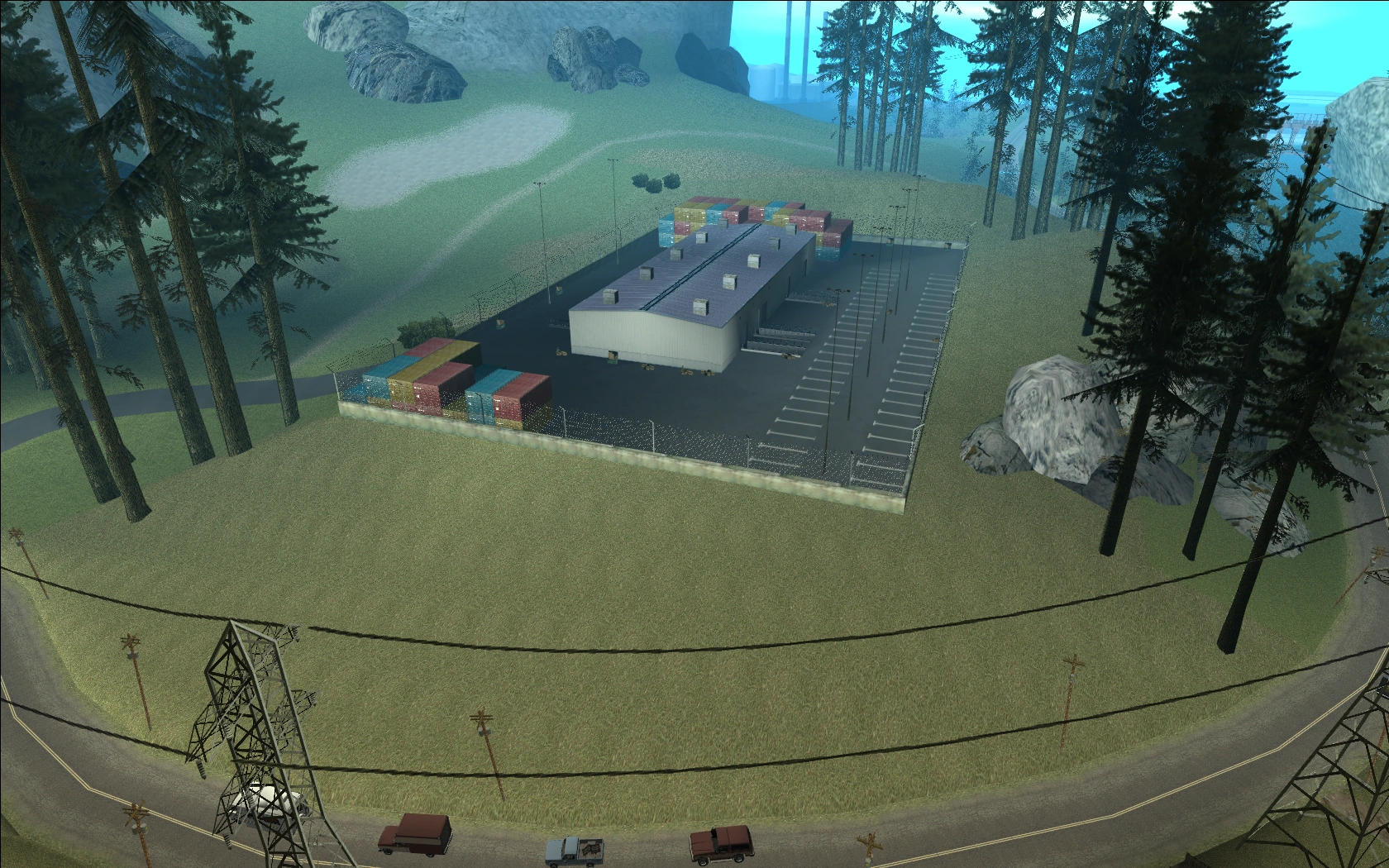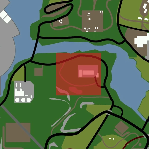 The main location in this area is a freight depot, with numerous industrial equipment and two buildings. Numerous vehicles also spawn here, specifically vans and industrial vehicles.