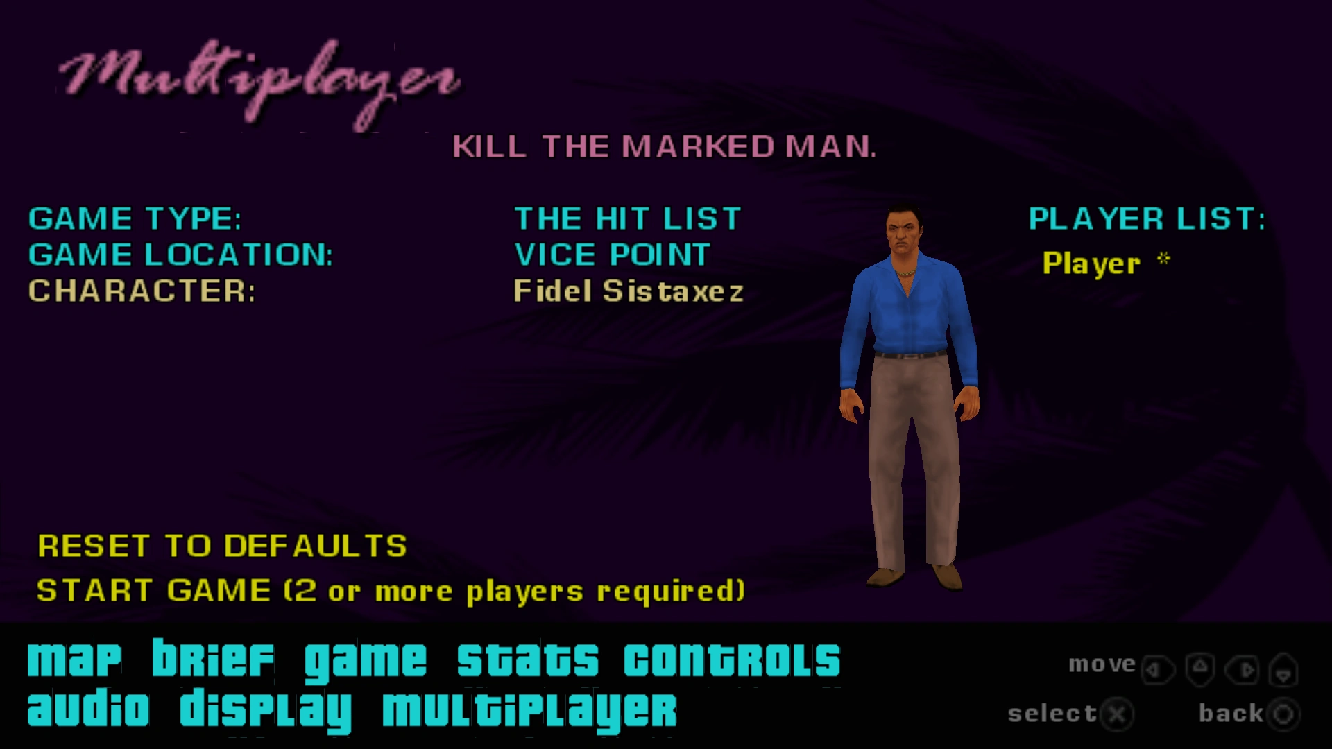 Fidel Sistaxez is a selectable playable character for certain multiplayer game modes, and plays no role in the storyline. This character is available in Vice City Survivor, Street Rage, Tanks for the Memories, The Hit List, Grand Theft Auto and Might of the Hunter.