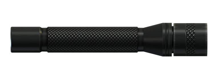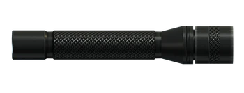 The weapon is an average, cylindrical flashlight that appears to be a shorter Kel-Lite model, mixed with elements of a Lenser M7R Flashlight, without an LED. It comes with a black color and a rugged pattern on the handle.