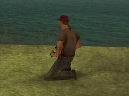 Across the road to the south of the trailer park, a random pedestrian will often be seen shooting photographs of the Los Santos skyline across the inlet. This involves some detailed animation: the pedestrian is shown both standing erect and kneeling, holding a camera up to their face, clicking the shutter (which is heard), and a camera flash is also seen. If the player observes the pedestrian for a while, eventually they will stop taking photos, sometimes will utter a random phrase or greeting to Carl, and then walk away right into the water, where the photographer drowns.