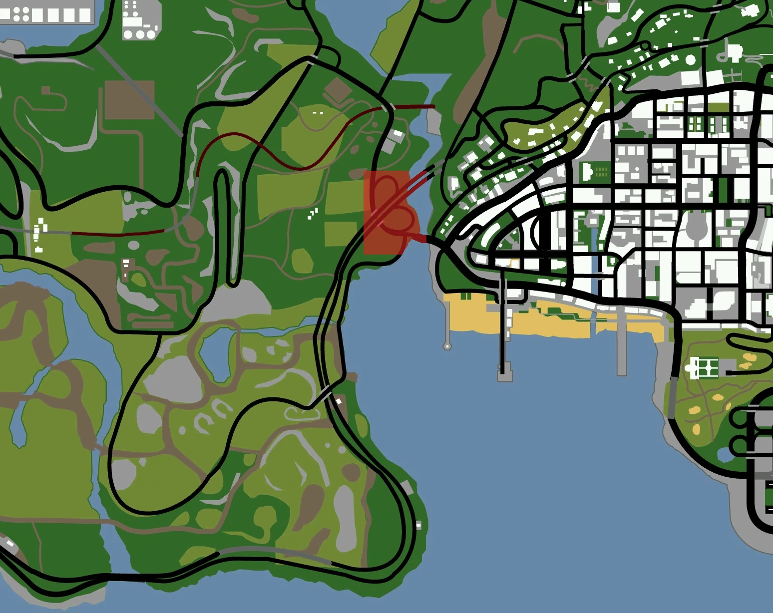 The intersection is very limited and can be classed as "incomplete". There are only two loops, serving cars coming from the west (Angel Pine and west San Fierro) going to the north, and those coming from the south (Los Santos) going to the west. There are no roads serving any other directions.