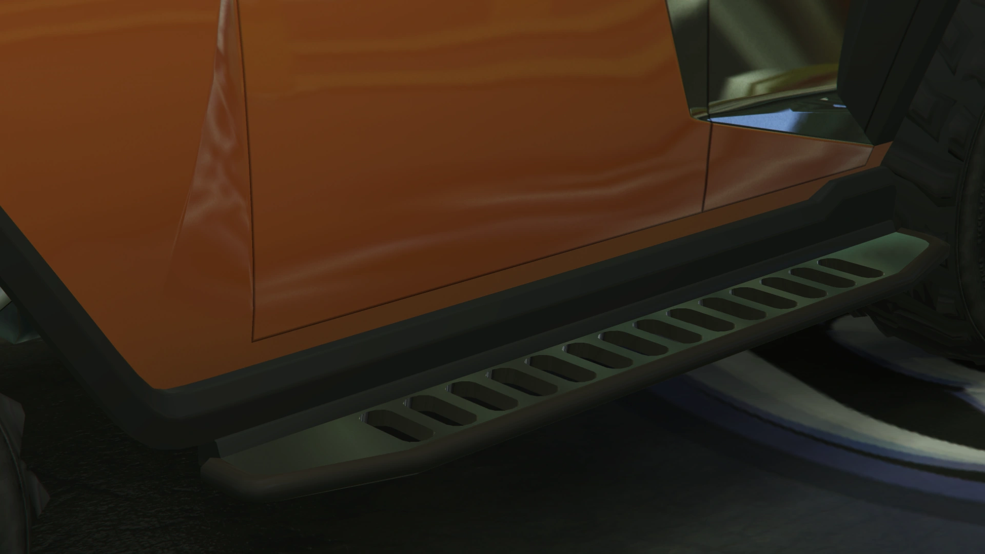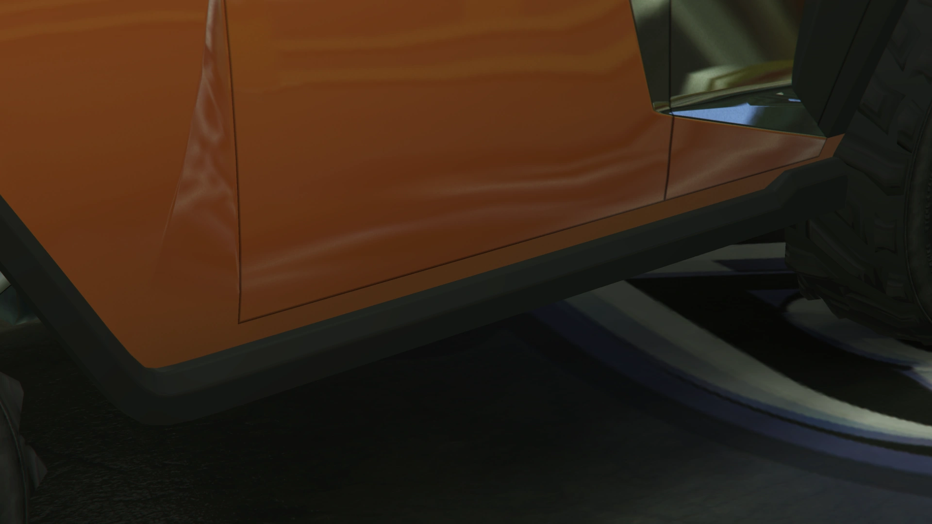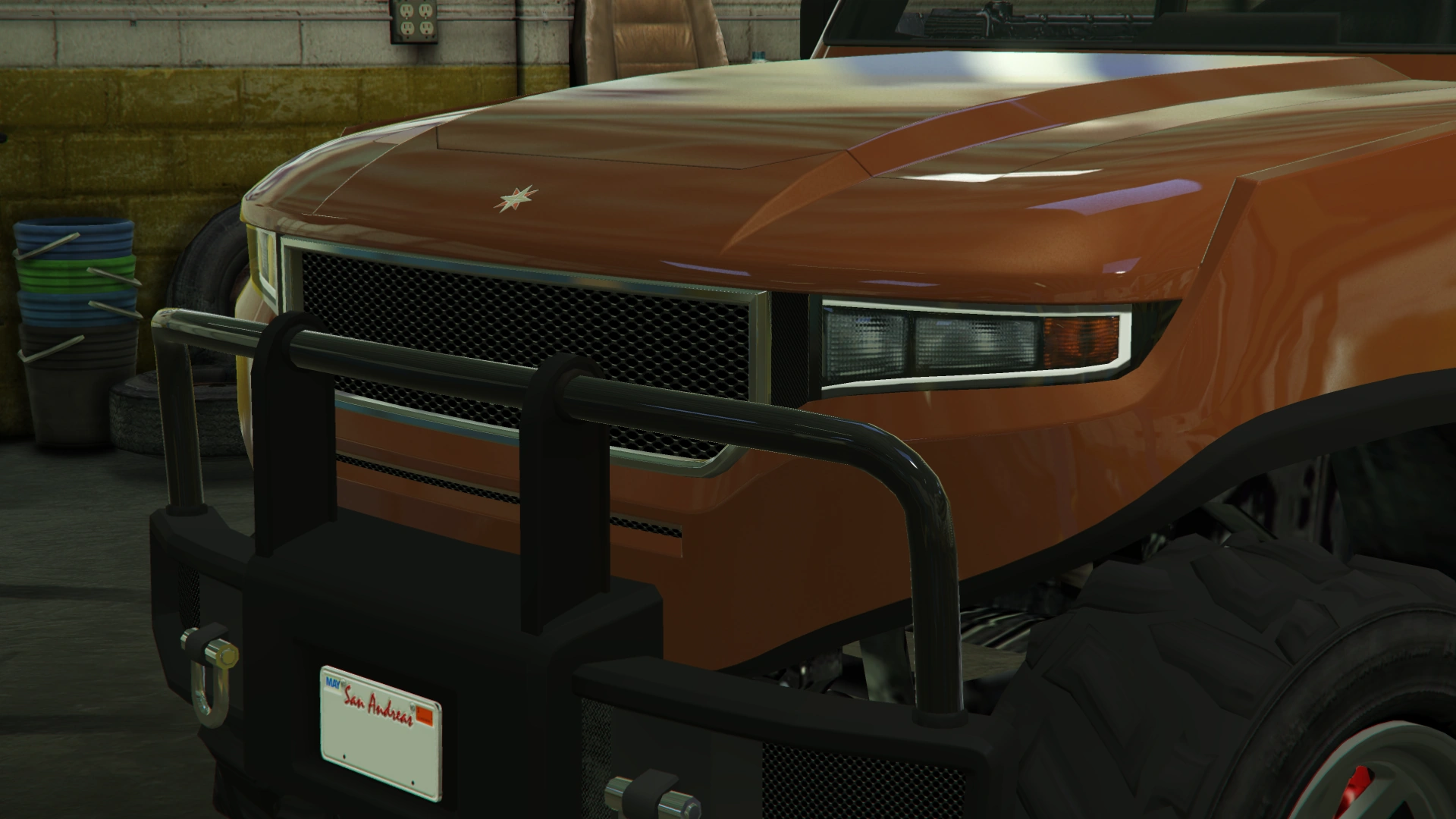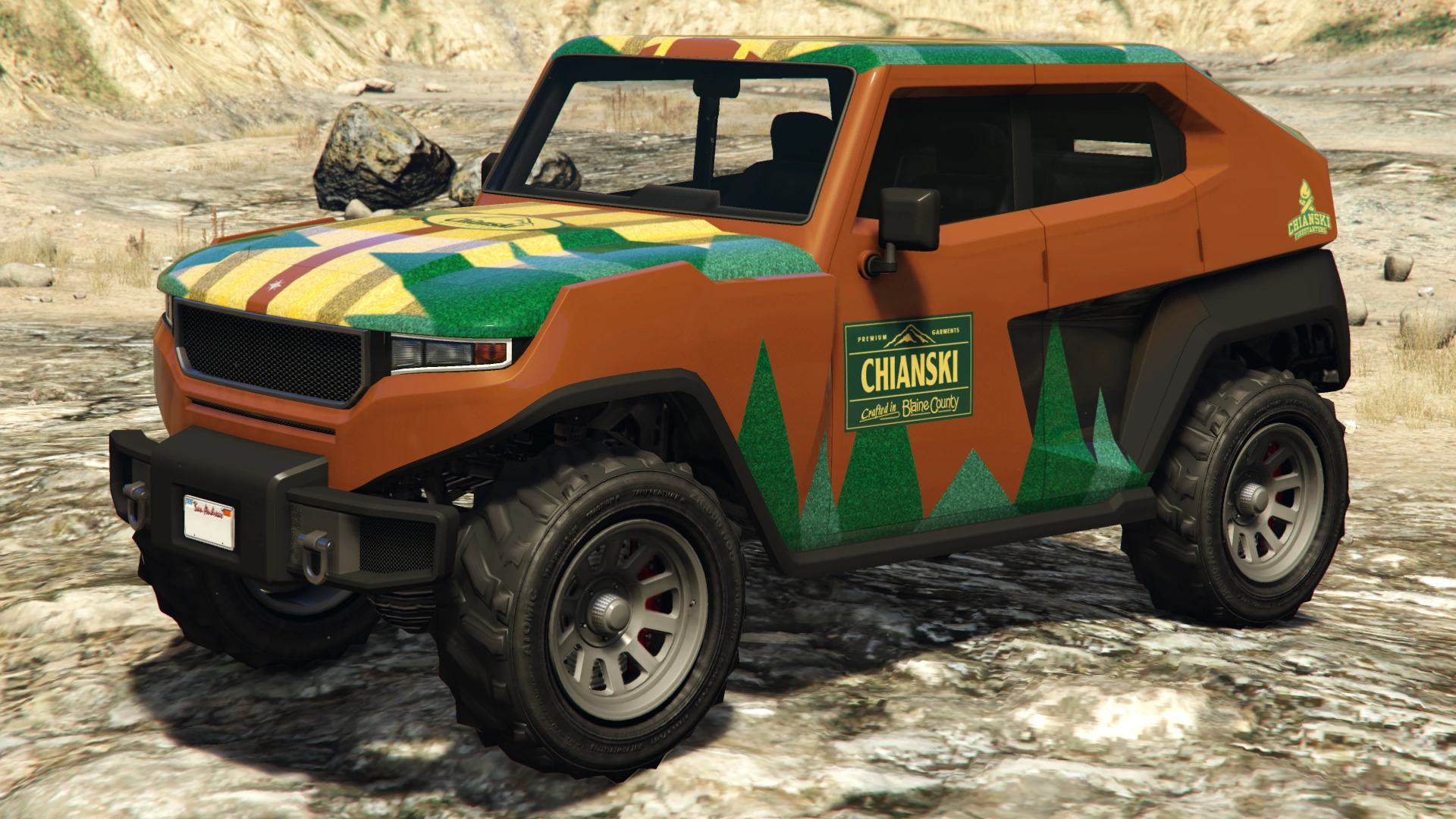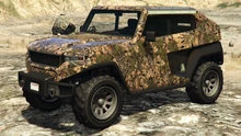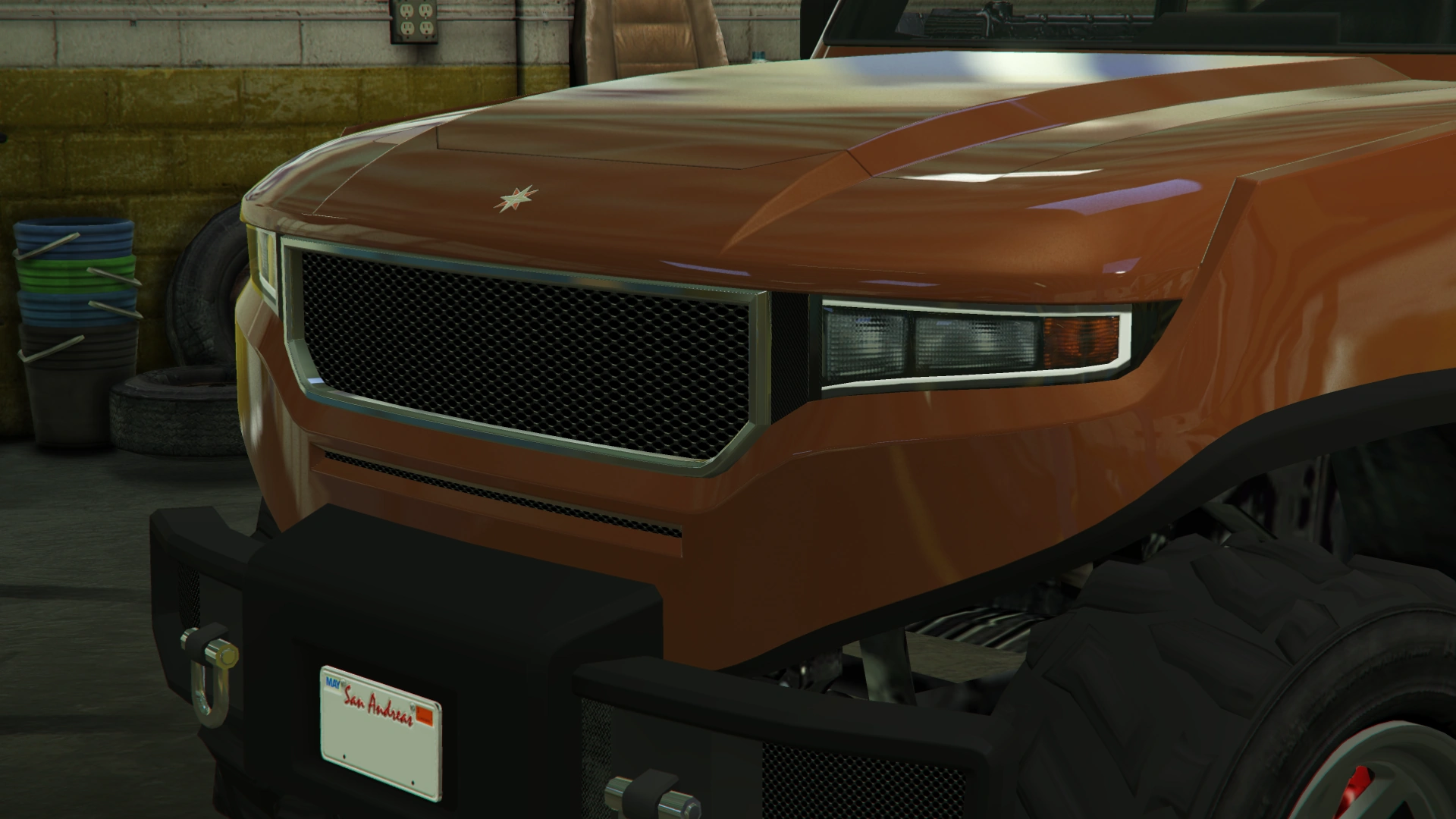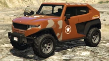Most of the car's bodywork and the sump guards are painted in a primary color, while the concave portions on the sides, the outer section just near the rear wheel arches and the suspension springs are painted in a secondary color. Its stock wheels are identical to the "Nevis" off-road wheels available in Los Santos Customs, albeit using the old rugged tread pattern and painted with a wheel color.