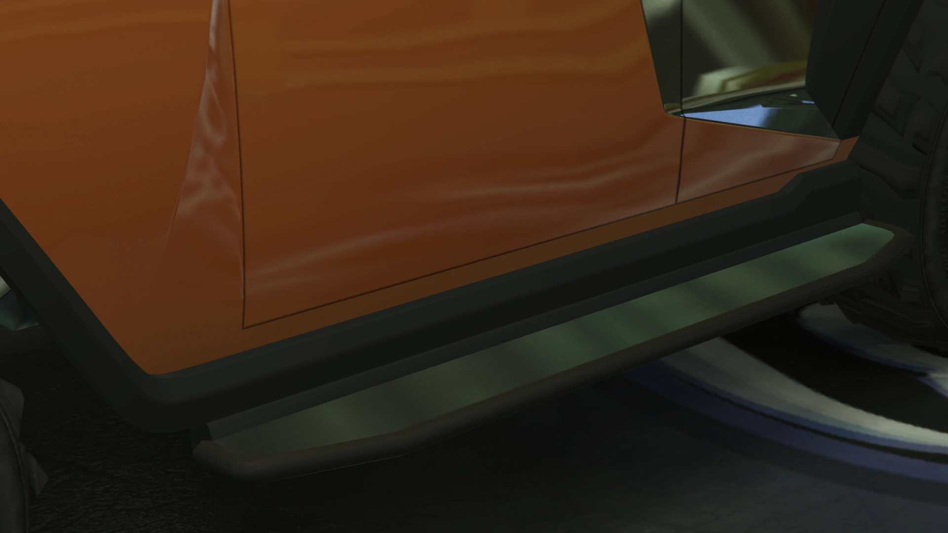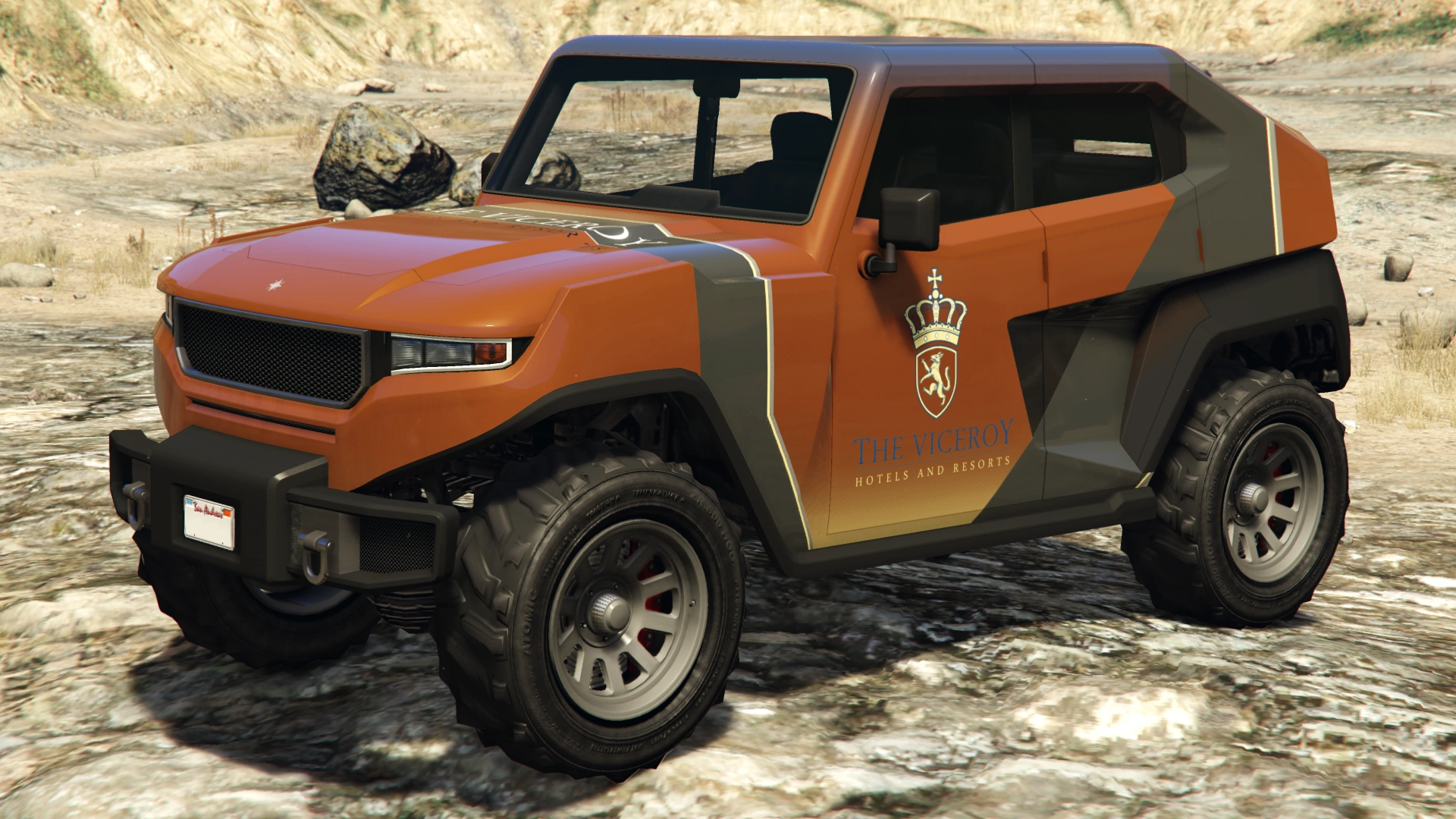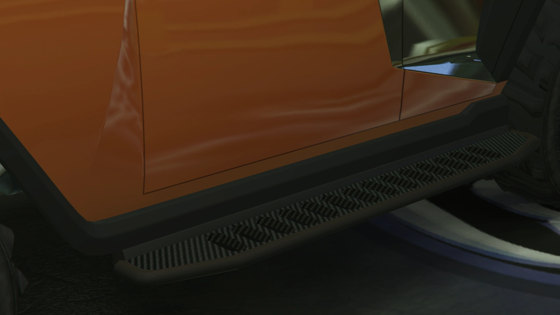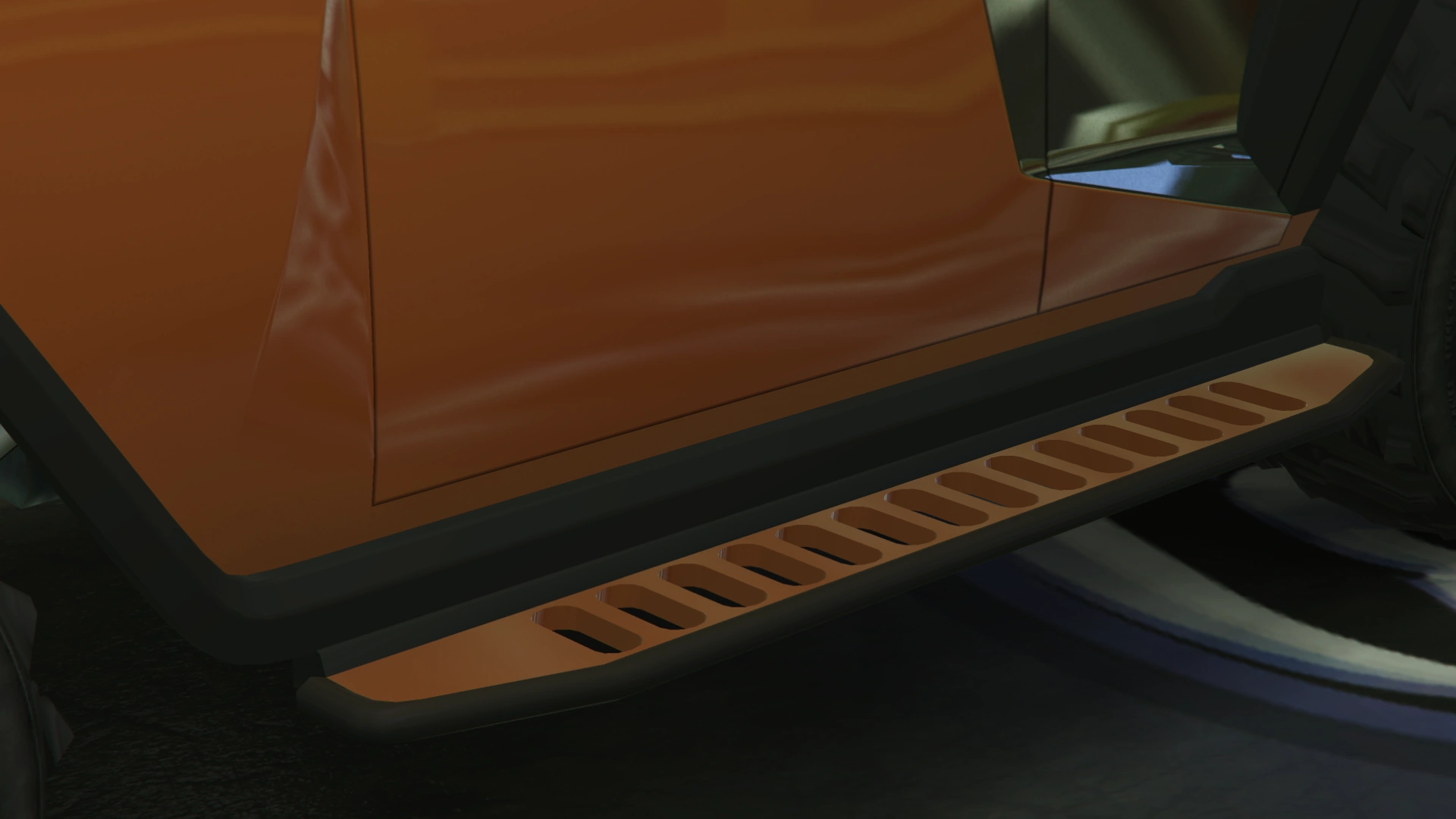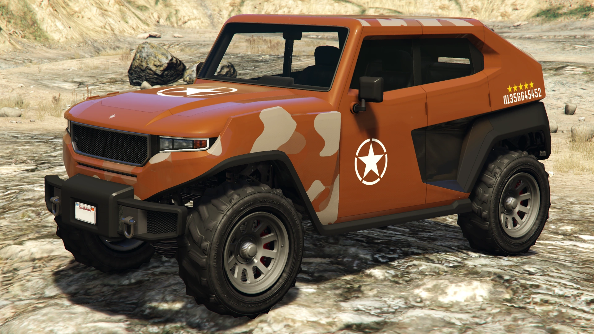 Most of the car's bodywork and the sump guards are painted in a primary color, while the concave portions on the sides, the outer section just near the rear wheel arches and the suspension springs are painted in a secondary color. Its stock wheels are identical to the "Nevis" off-road wheels available in Los Santos Customs, albeit using the old rugged tread pattern and painted with a wheel color.