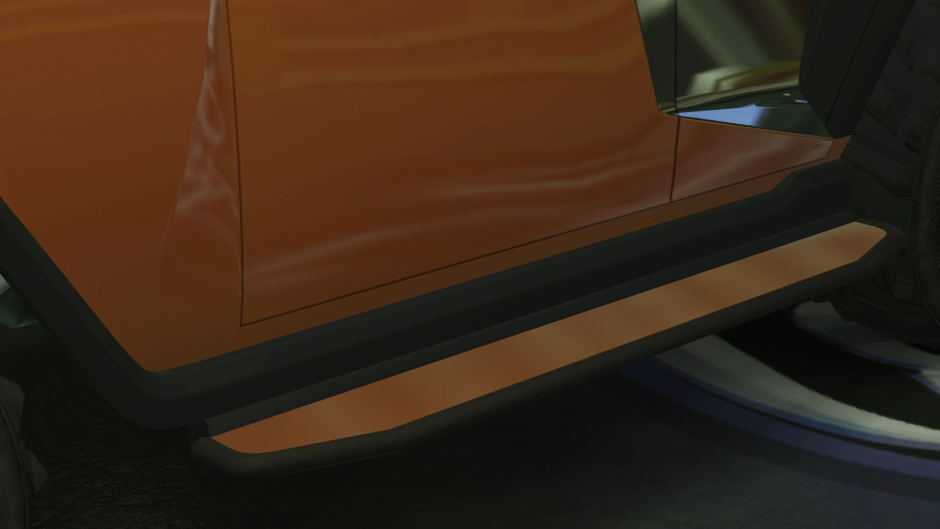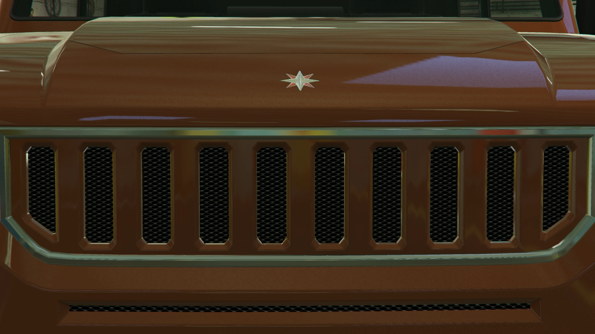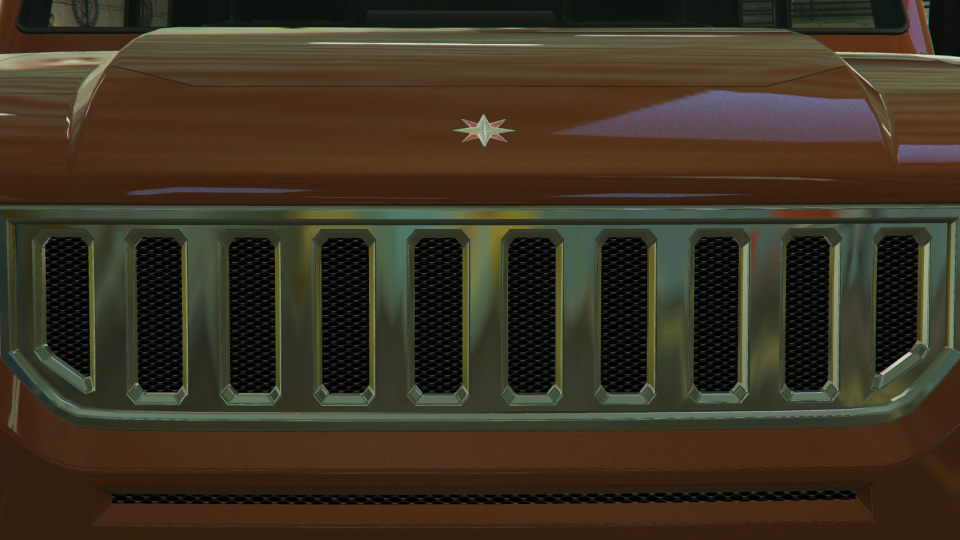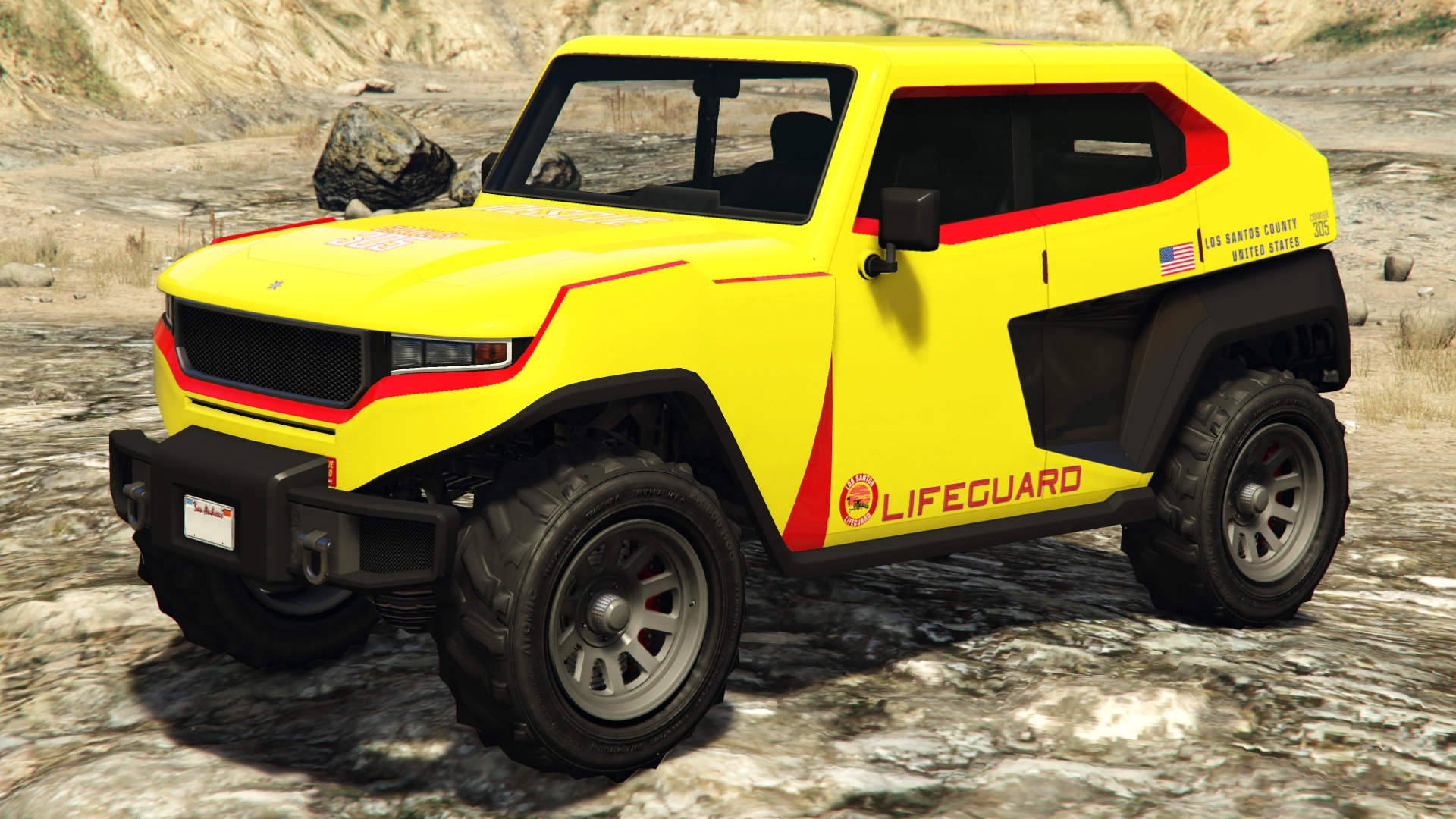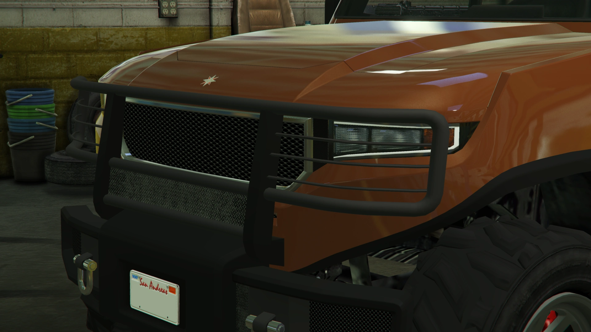 Most of the car's bodywork and the sump guards are painted in a primary color, while the concave portions on the sides, the outer section just near the rear wheel arches and the suspension springs are painted in a secondary color. Its stock wheels are identical to the "Nevis" off-road wheels available in Los Santos Customs, albeit using the old rugged tread pattern and painted with a wheel color.