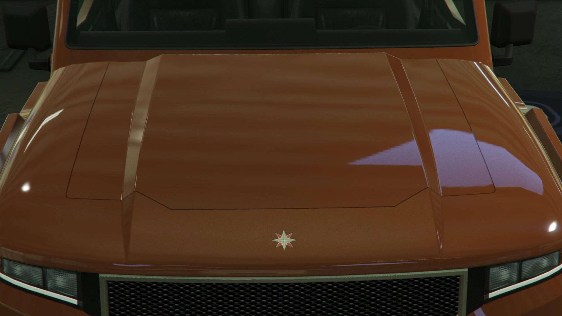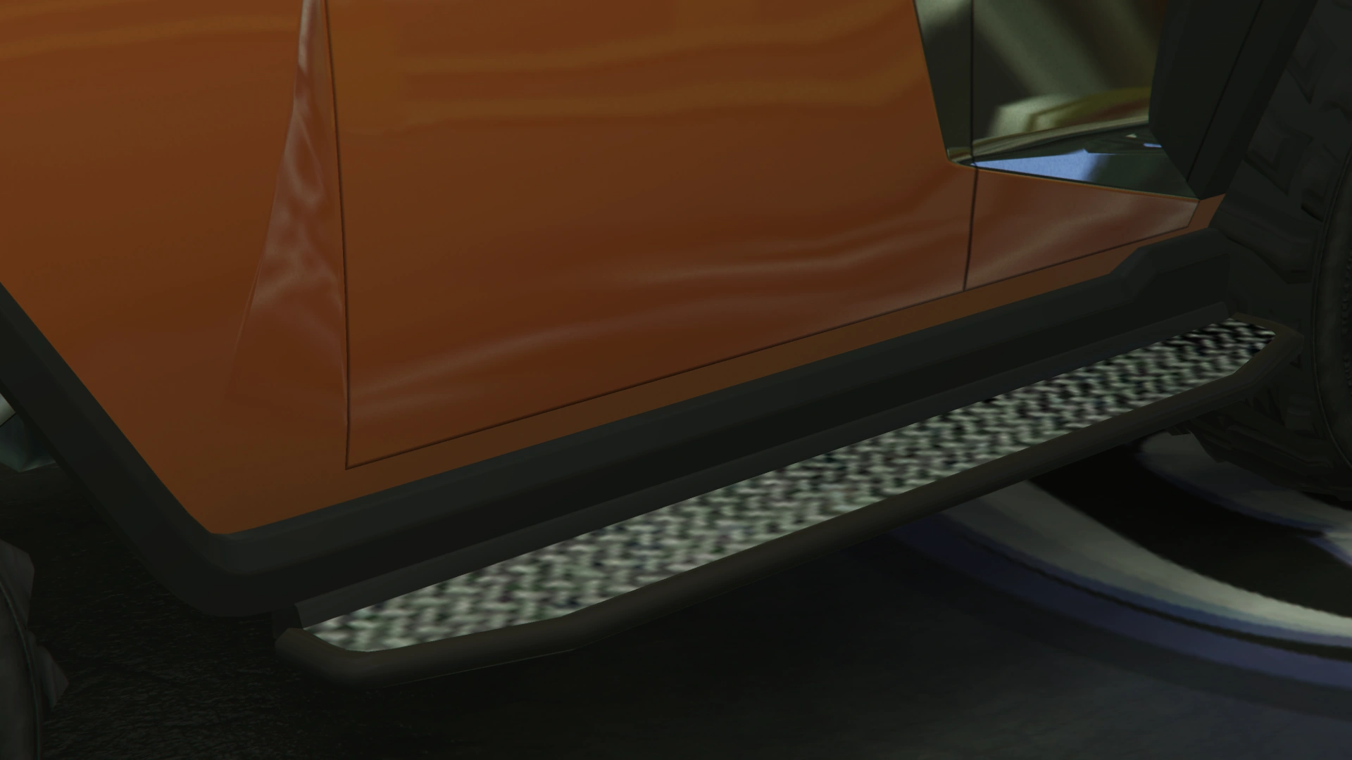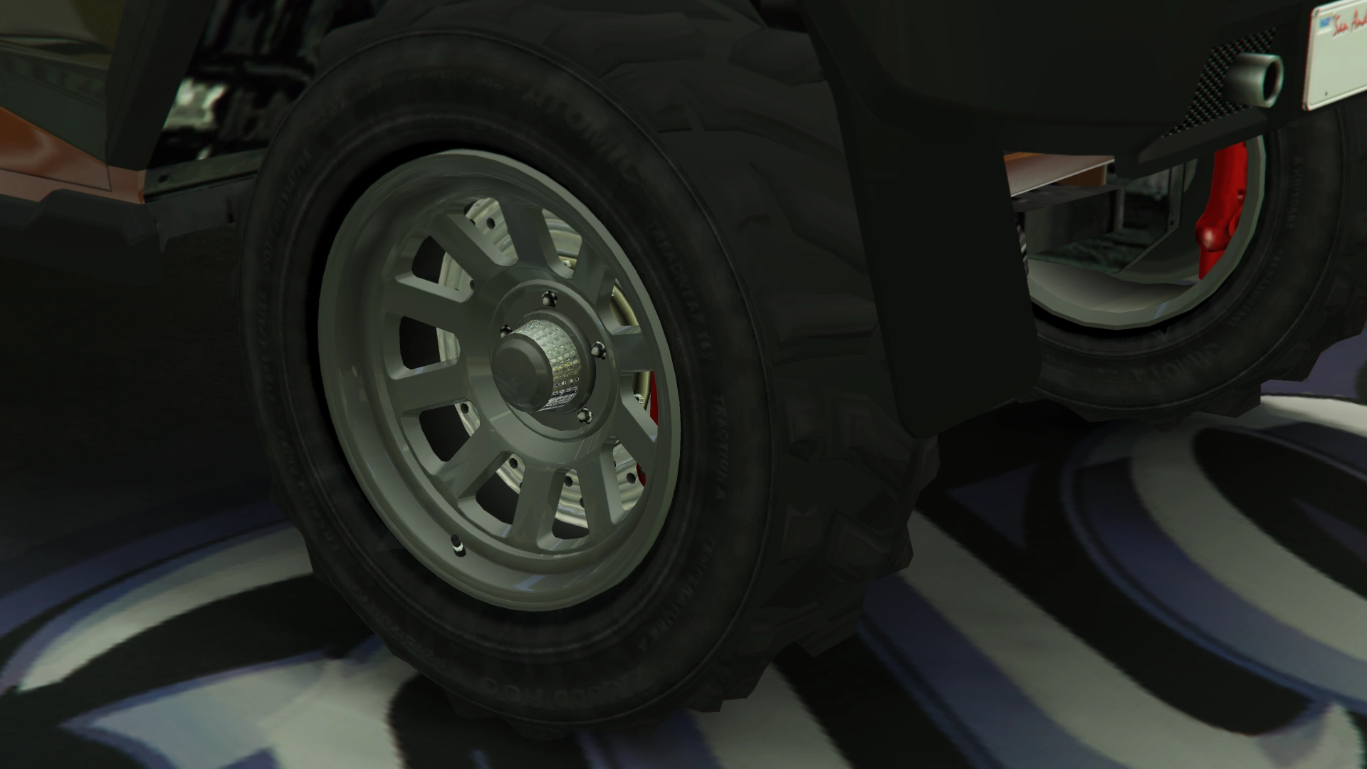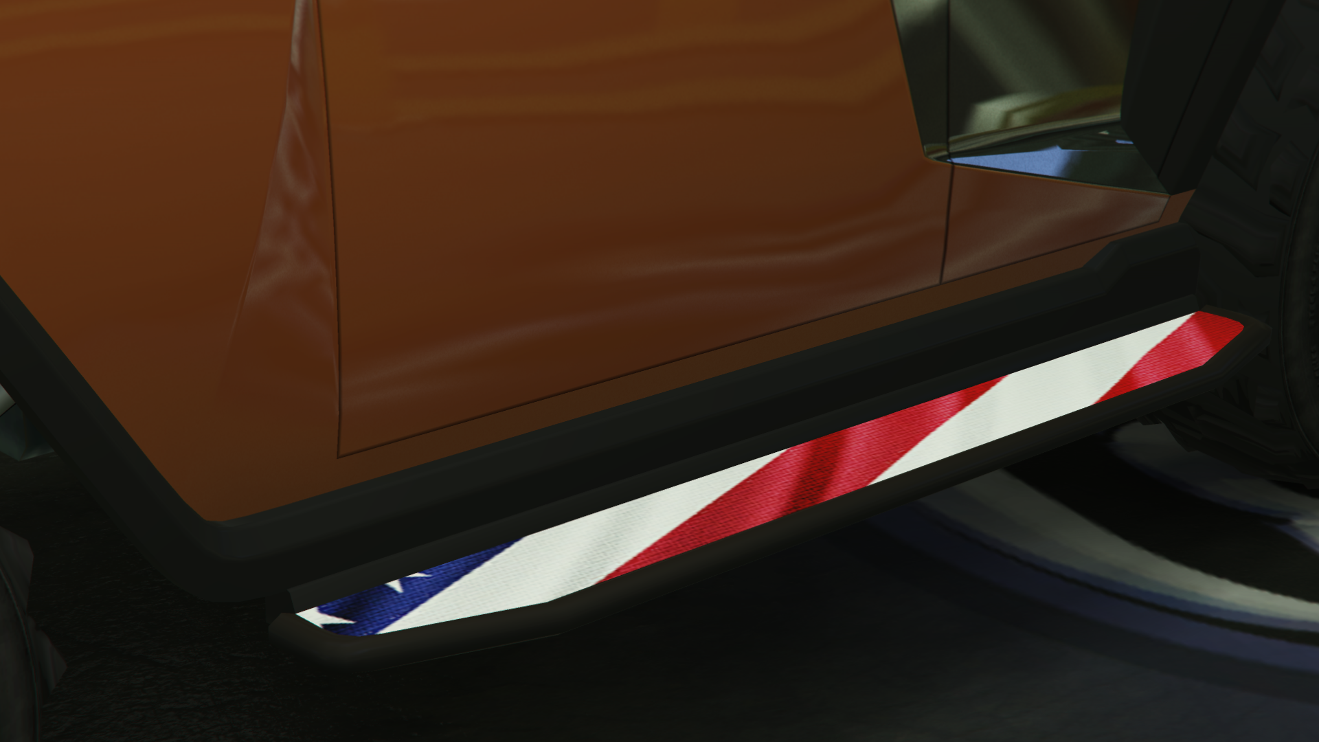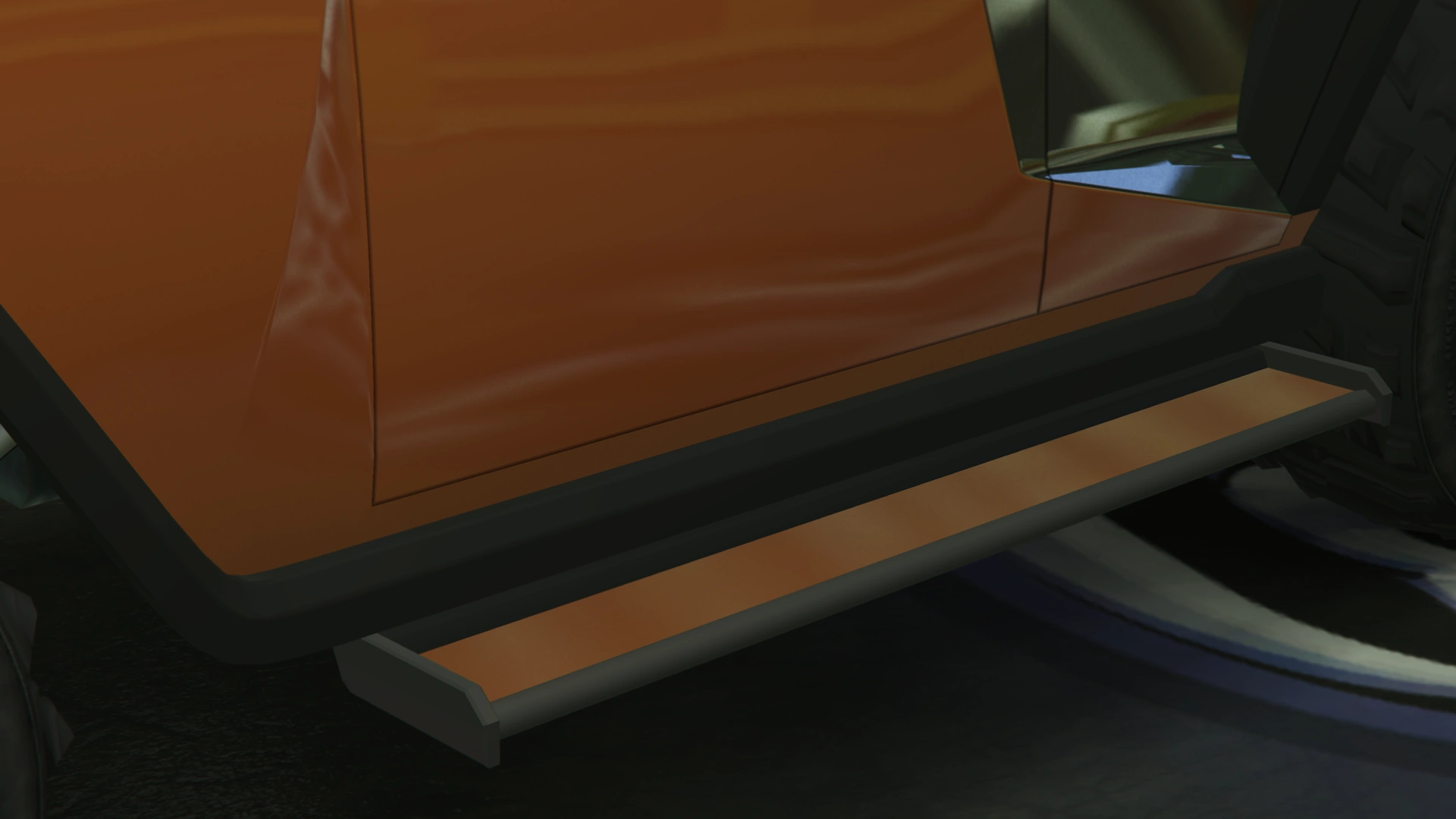 Most of the car's bodywork and the sump guards are painted in a primary color, while the concave portions on the sides, the outer section just near the rear wheel arches and the suspension springs are painted in a secondary color. Its stock wheels are identical to the "Nevis" off-road wheels available in Los Santos Customs, albeit using the old rugged tread pattern and painted with a wheel color.