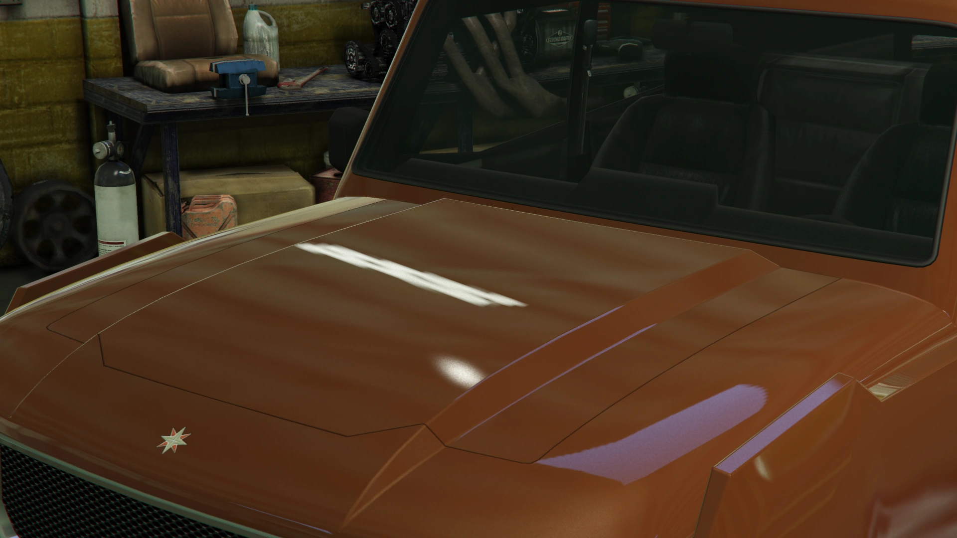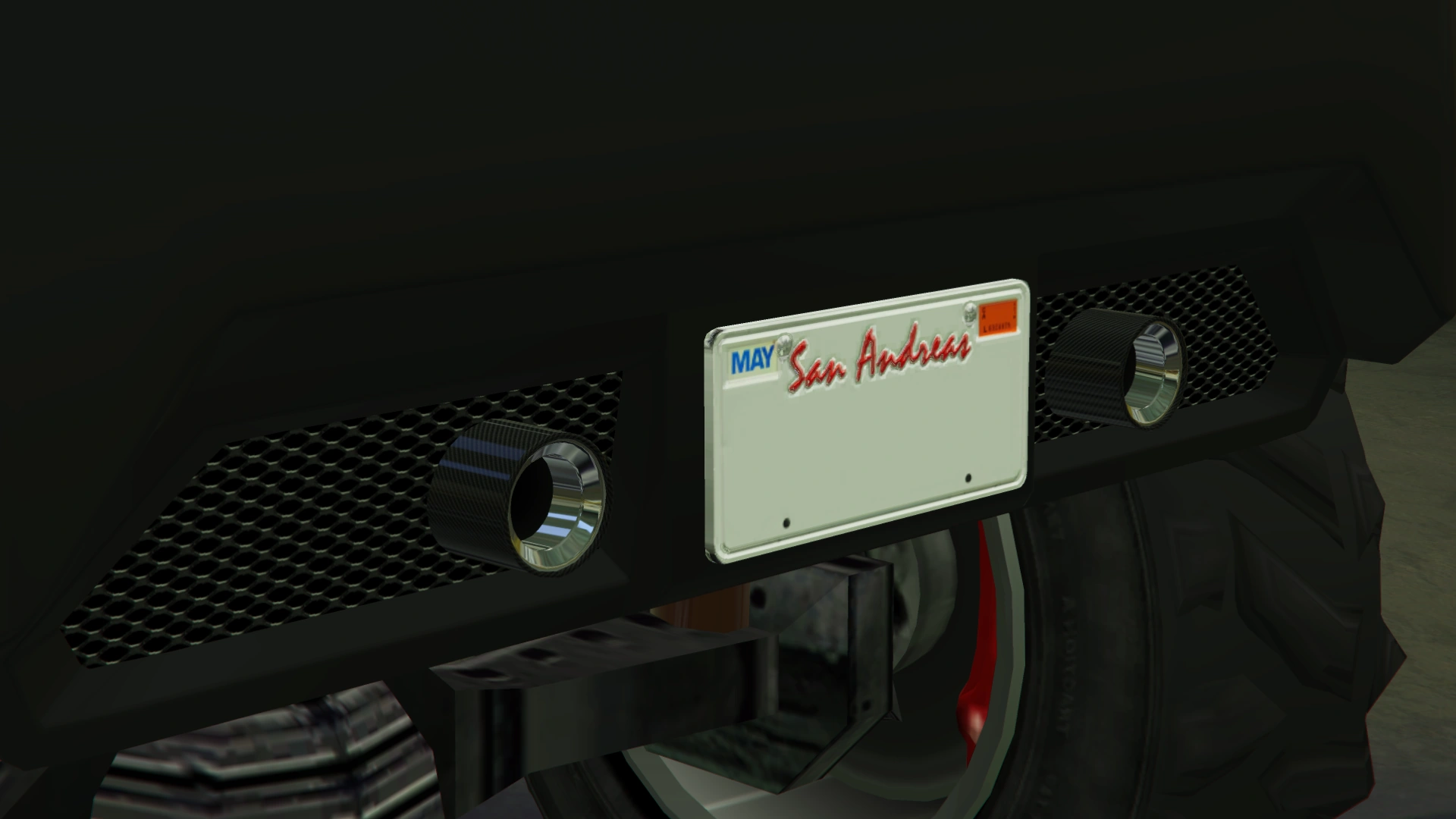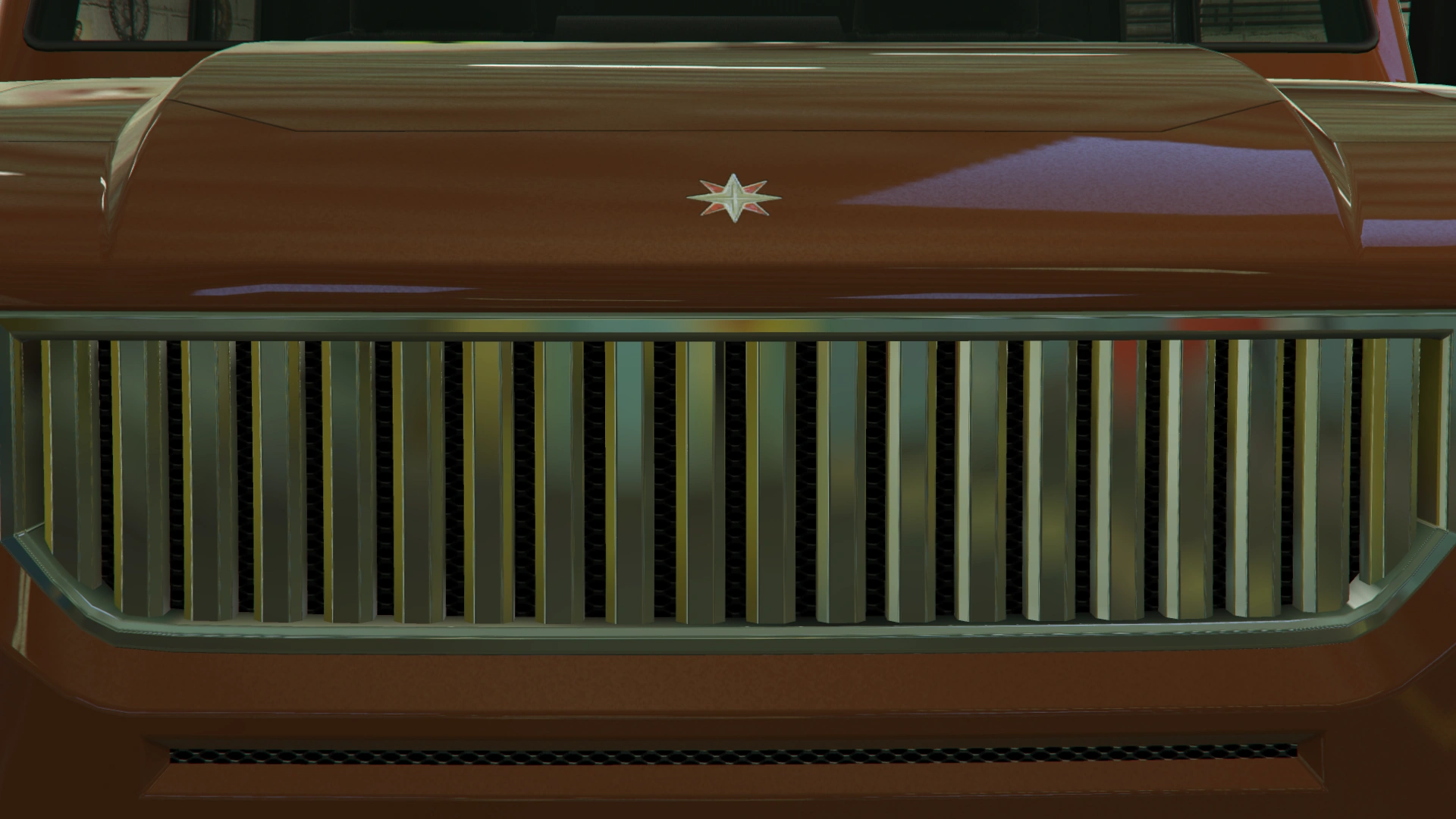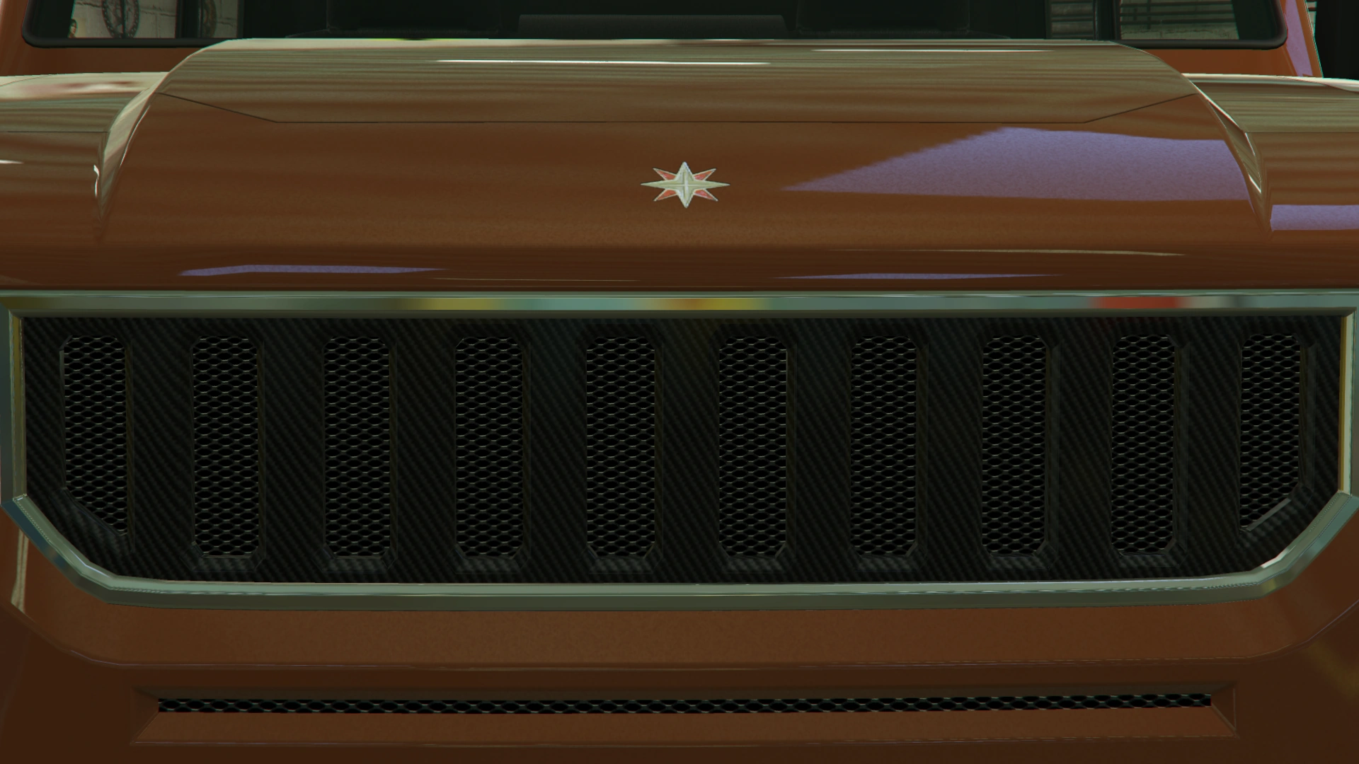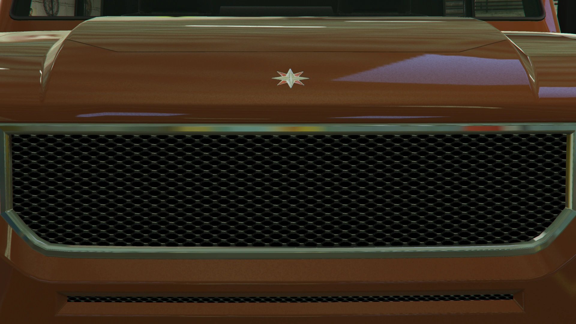 Most of the car's bodywork and the sump guards are painted in a primary color, while the concave portions on the sides, the outer section just near the rear wheel arches and the suspension springs are painted in a secondary color. Its stock wheels are identical to the "Nevis" off-road wheels available in Los Santos Customs, albeit using the old rugged tread pattern and painted with a wheel color.