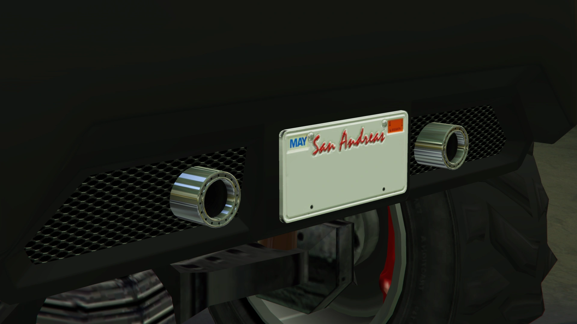 The rear end denotes its tall design, sporting an angled roof and a seemingly lower rear window. It sports two rectangular tail lights, separated from the rear window by black trims. The rear bumper is very large and spans through the rear end and rear wheel arches. Two circular exhaust tubes can be seen below the bumper, as well as the license plate. Similar to various off-road vehicles, sump guards can be seen on both ends of the underside, almost above the axles. The car features two rear compartment doors, which opens up at once when using the corresponding option through the Interaction Menu.