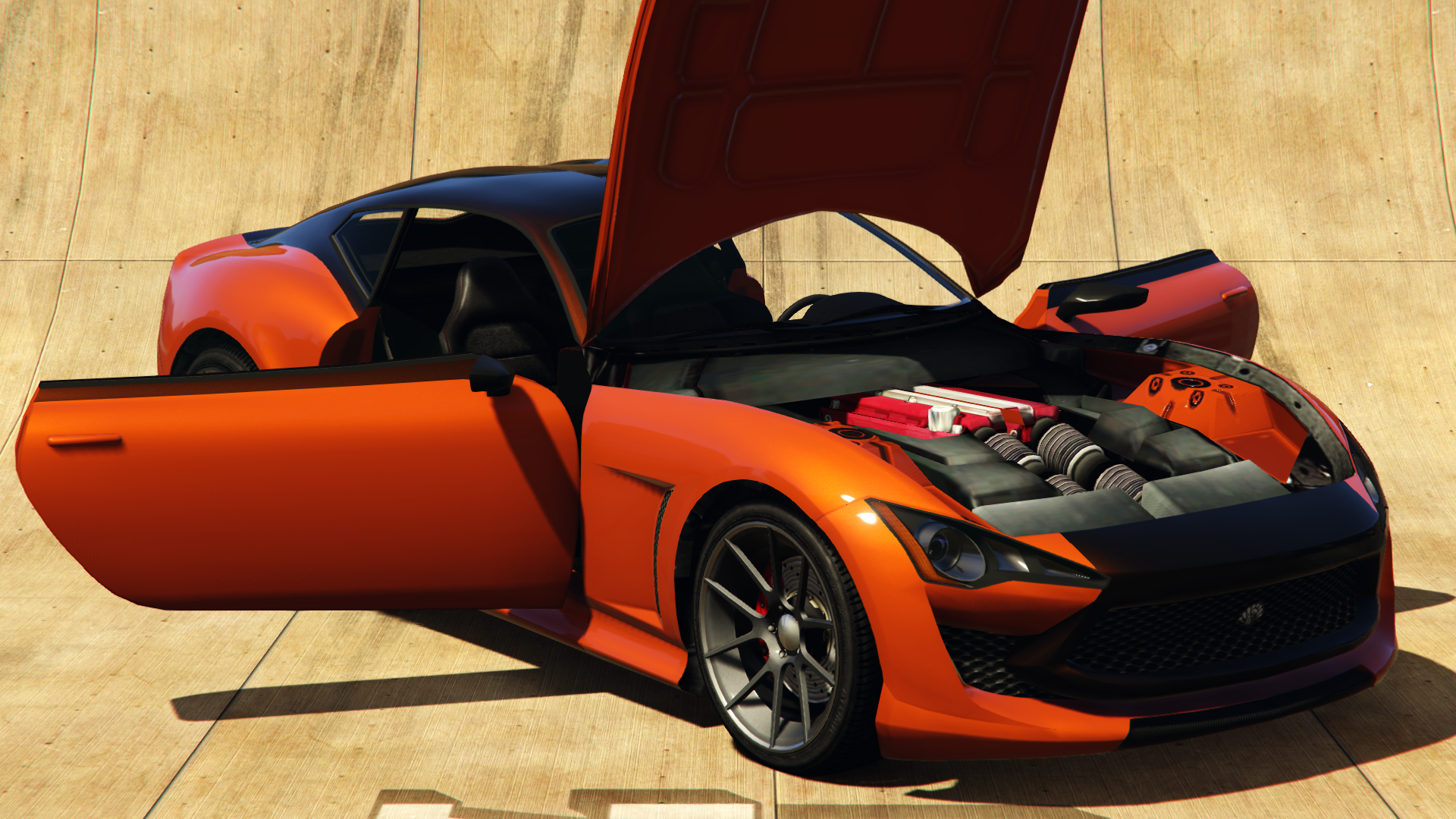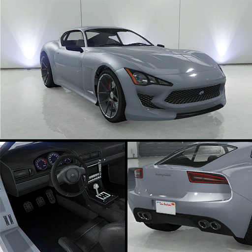The primary colour of the car is applied on the bodywork and the interior stitching, while the secondary colour is applied on the portion surrounding the central grille intake, most of the bonnet, the cabin area and a portion of the rear bumper that separates it from the upper area. The car uses a set of wheels similar to the "Sinthetic Z" sport rims seen in Los Santos Customs, but the detail in the centre is slightly larger. They also appear to apply a darker shade if a custom wheel colour is set (though it is only possible in Content Creator through the colour option). It also uses low-profile tyres, with the rear ones being wider than the front ones.