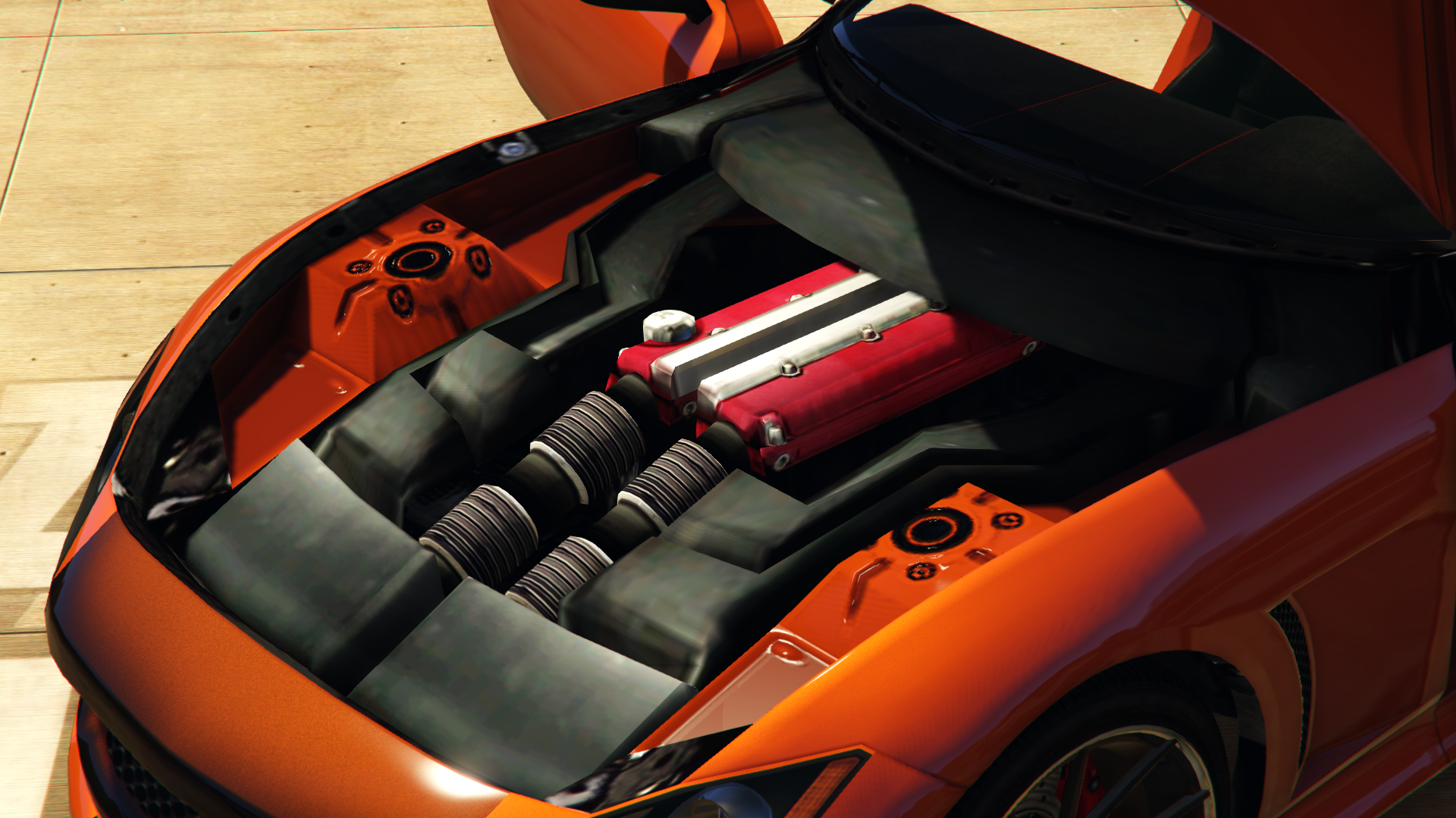 The engine model is shared with the Exemplar and Rapid GT, and appears to be directly based on the real-life Ferrari DOHC engines, particularly the V8 models. It features red rocker covers and has large cold-air ram intake pipes coming from the front grille. Its engine sound is almost identical to that of the Monroe; being slightly lower in pitch and volume.