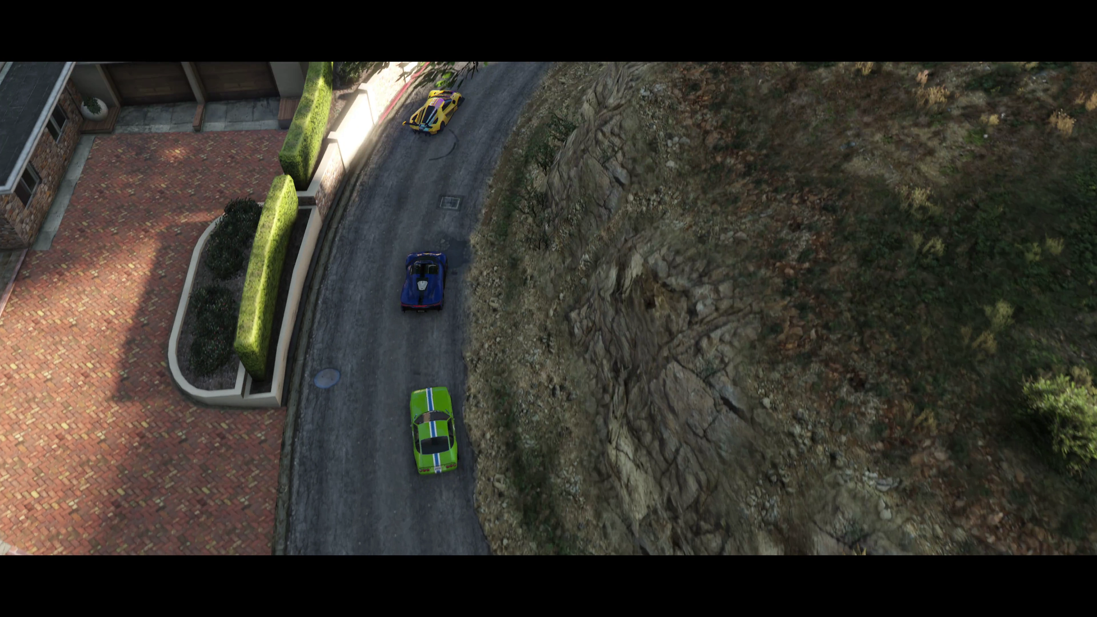 Three unreleased vehicles driving along Ace Jones Drive; from bottom to top: a Grotti sports car, a Pfister supercar, and the FMJ MK V.