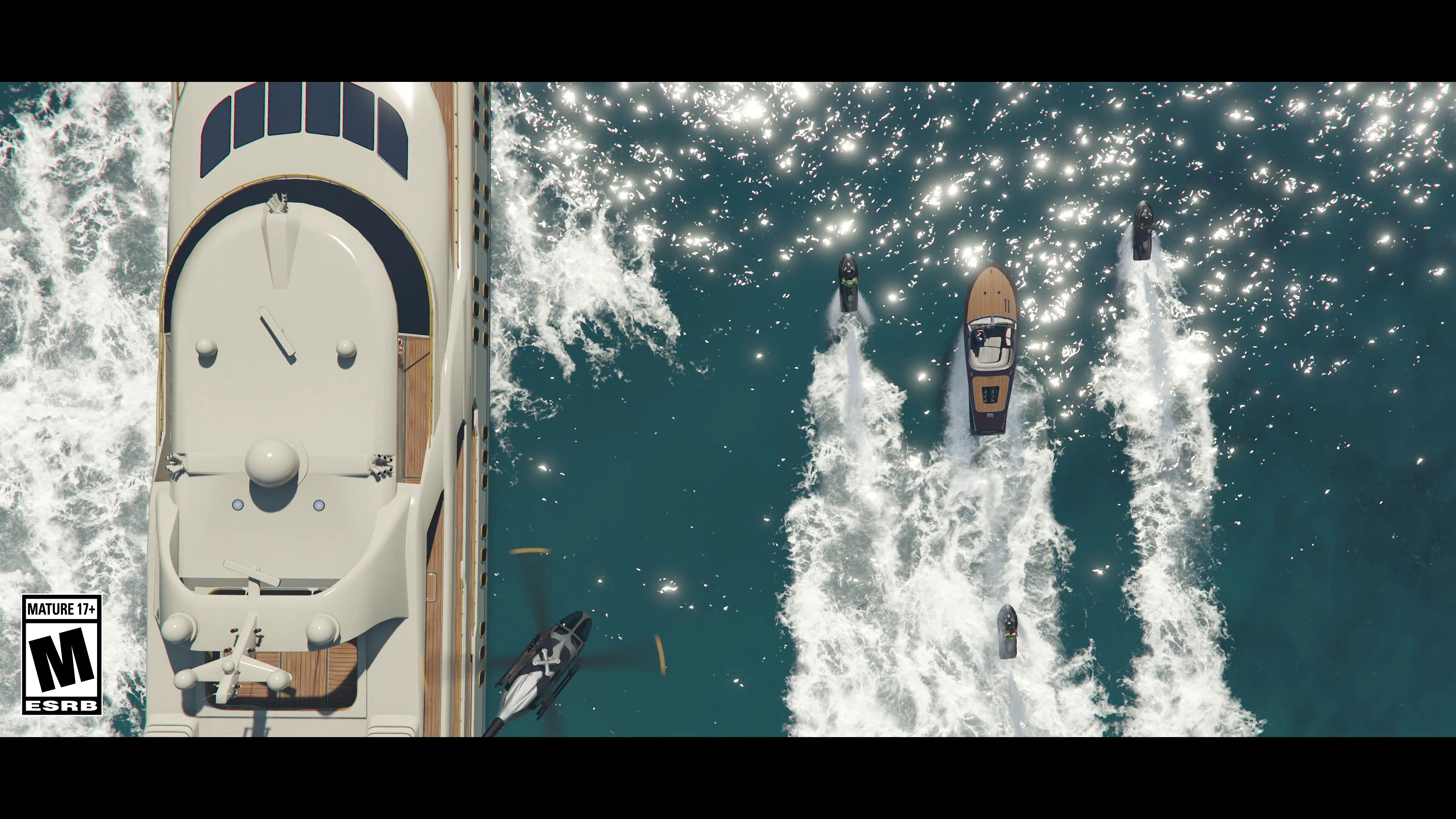 A Toro, three Seasharks, and a SuperVolito Carbon departing from an "Aquarius" model Galaxy Super Yacht.