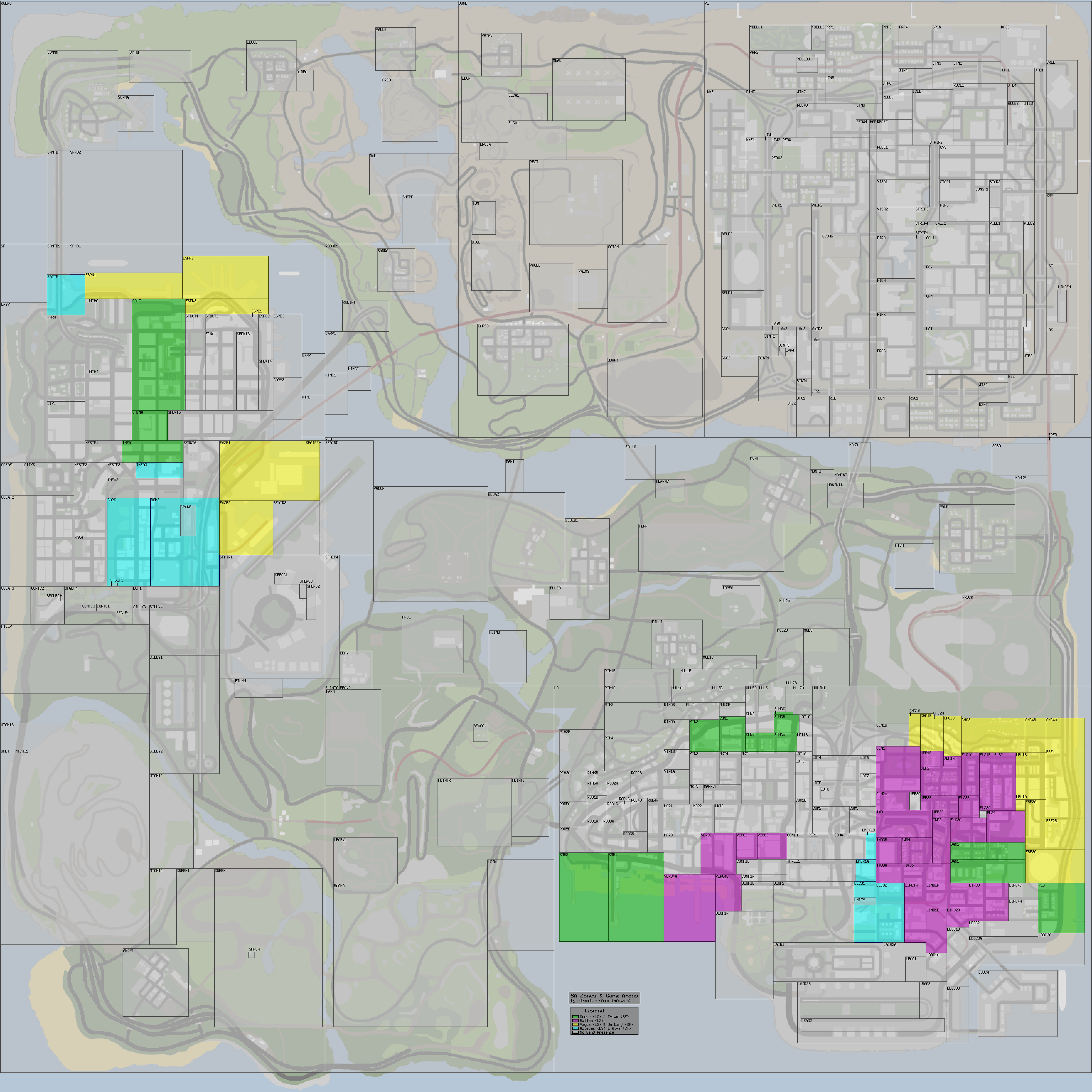 The gang territories in San Andreas are denoted by colored areas on the map. This is a list of gangs whose territories Carl can take over, with their corresponding colors: