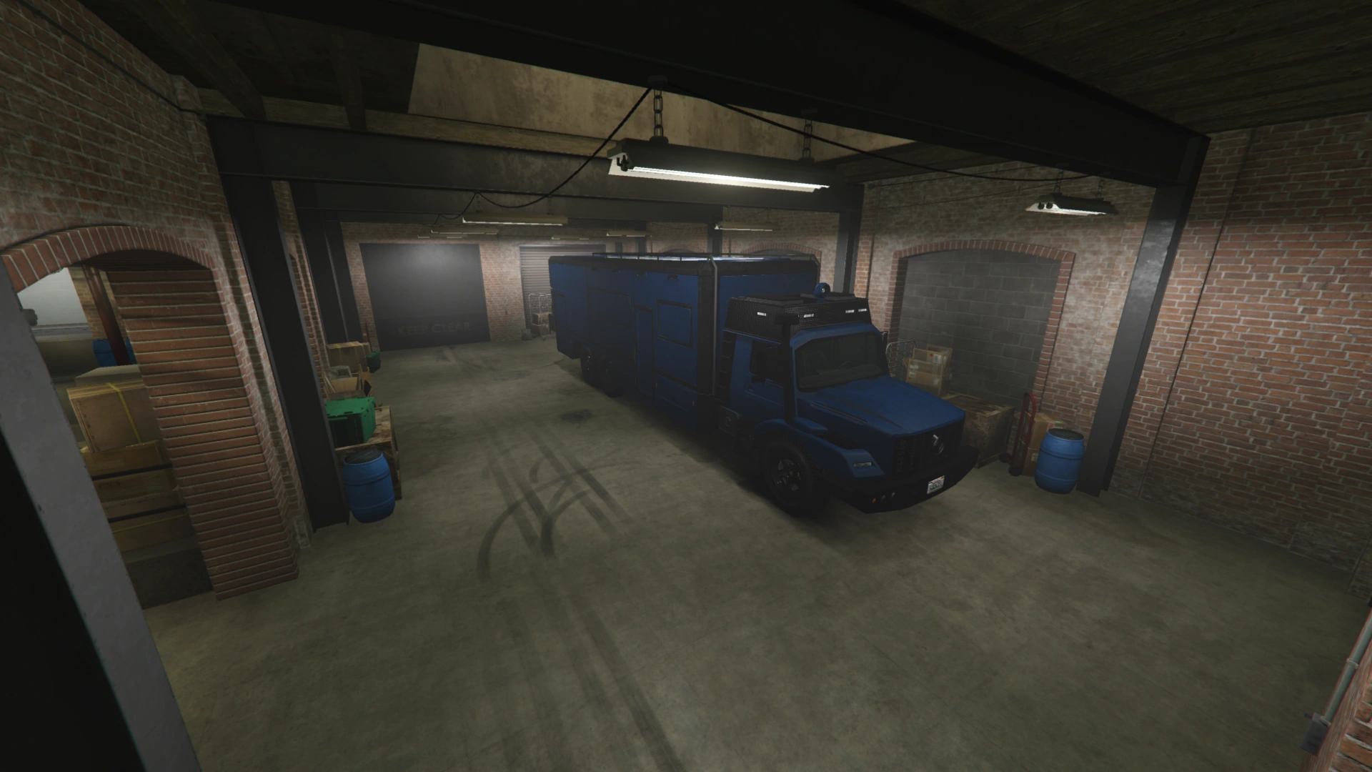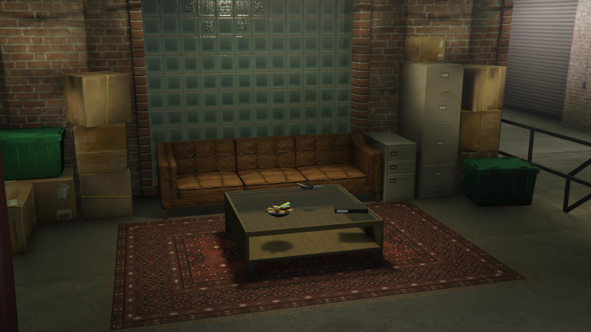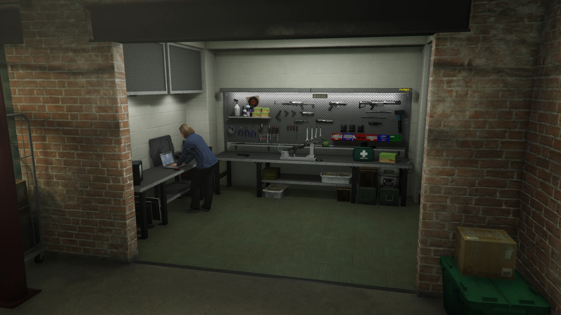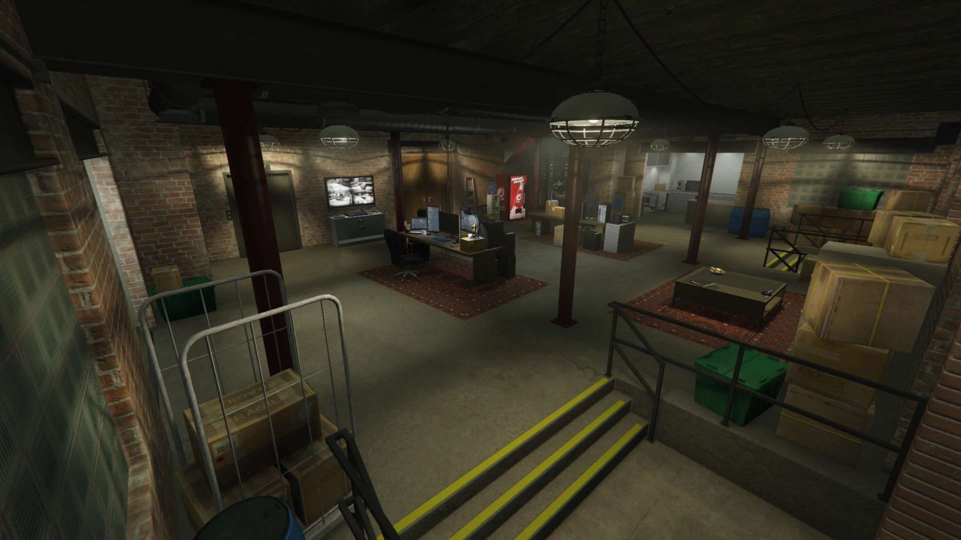 The Basement Garage holds ten vehicle storage slots, split in groups of five by a large brick wall. On one side of the garage is an elevator allowing access back to the operations room, while the other side of the garage contains a Fast Travel access door. The Fast Travel door depicts a map of Los Santos Transit's "The Arrow" subway system. Also found in the Basement Garage is a green plastic bin with a fire-damaged photo of the factory, pairs of Bugstars coveralls, and gas masks, as well as a Carbine Rifle leaning against it, which can be picked up by the player. These are intended to be leftover equipment from the "Smart" approach for The Jewel Store Job in Grand Theft Auto V, which was planned within the garment factory. The photo of the factory in the bin can also be found on the wall in the heist planning room in GTA V, its fire damage coming from when the factory was lit on fire during the opening cutscene of The Bureau Raid.