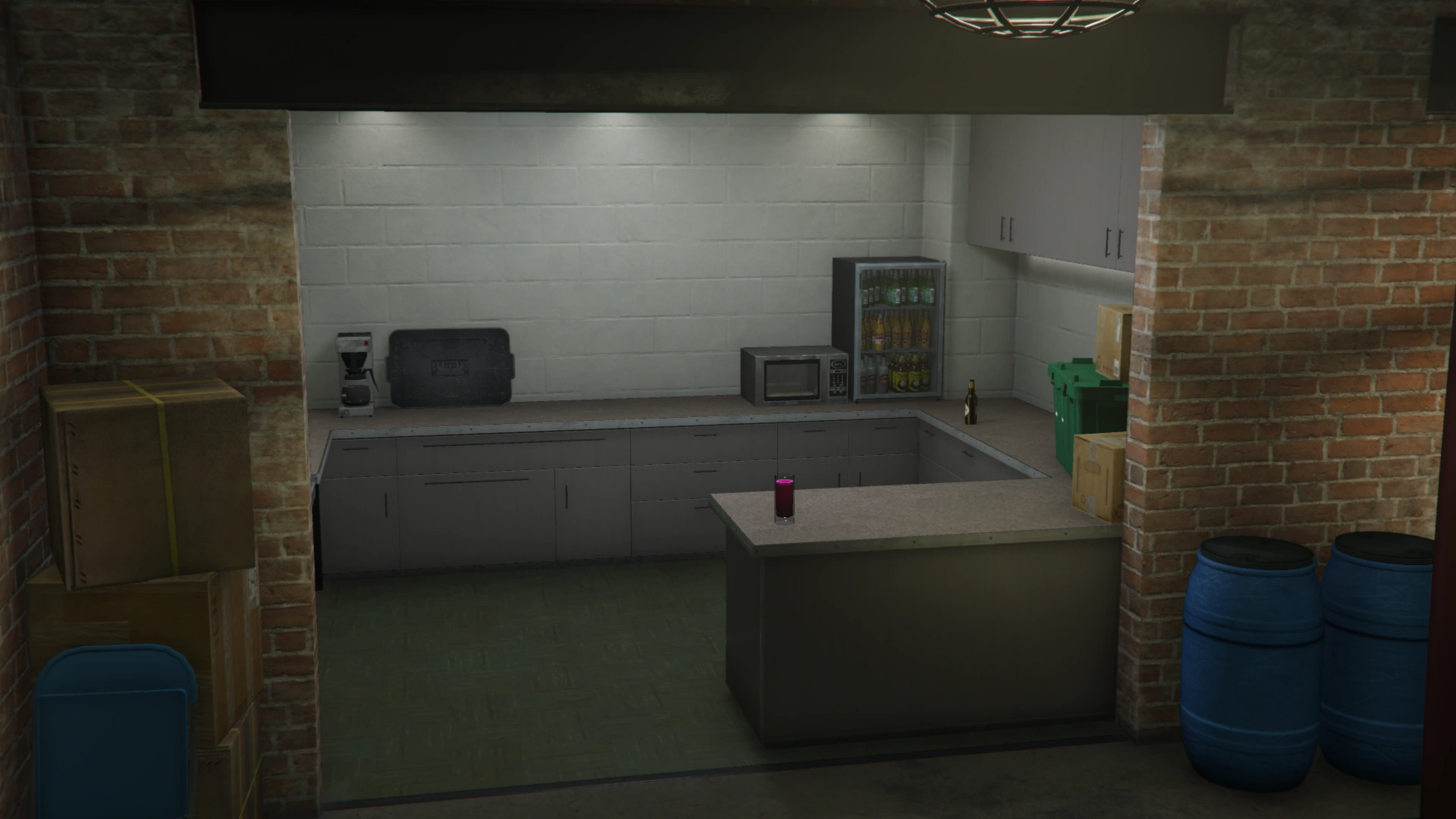 Upon entering through the front doors, the player comes to the first level of the building. The doors immediately face a set of stairs to the textile workshop and living quarters, but to the right of the stairs is a set of doors to the base of operations. Inside the operations center, the player can find two desks with computer equipment; the desk closer to the elevator may be used by the player to initiate The FIB Files, while the other is Jodi Marshall's desk and is not intractable. There is also a security camera monitoring station, a lounge area with a bowl of snacks, and an ECola vending machine. The west end of the room features a kitchenette with a drinkable glass of Limey's juice and bottle of Pißwasser. The east end of the room contains the MKII Weapons Workshop, where the player can upgrade and customize their MKII weapons. The room also features an elevator down to the Basement Garage.