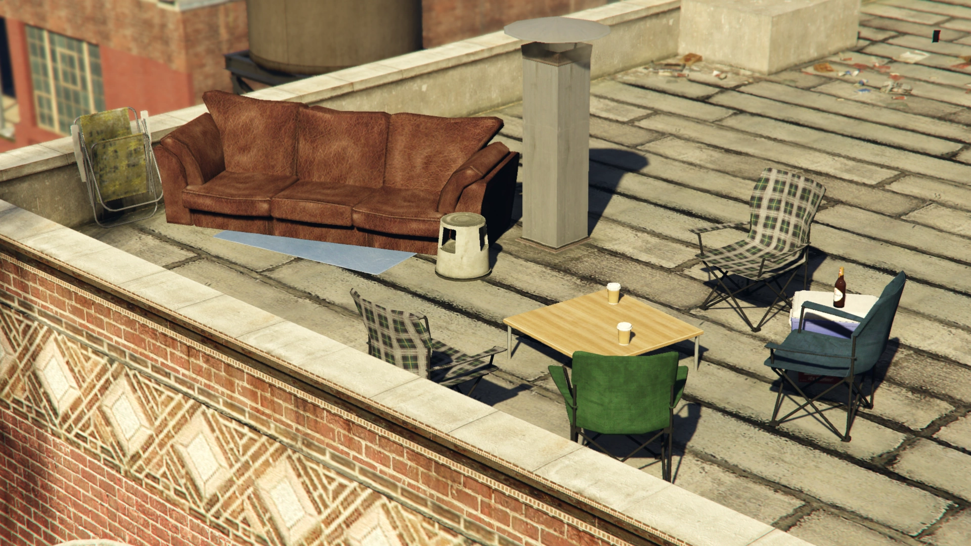 The rooftop of the factory received an updated roof material texture compared to its GTA V counterpart, as well as a new roof access door replacing a chimney on the northeast corner. A seating area made up of several folding chairs and a dilapidated couch can be found on the west end of the roof, facing the Downtown Los Santos skyline. Sitting on the couch offers a cinematic camera view of the Los Santos skyline. Also on the rooftop is a billboard for the Jack Howitzer television show, replacing the Republican Space Rangers billboard that originally occupied the space.