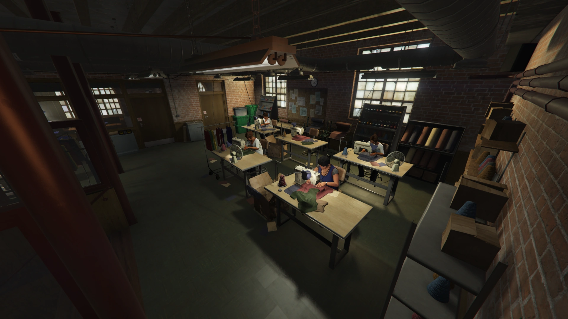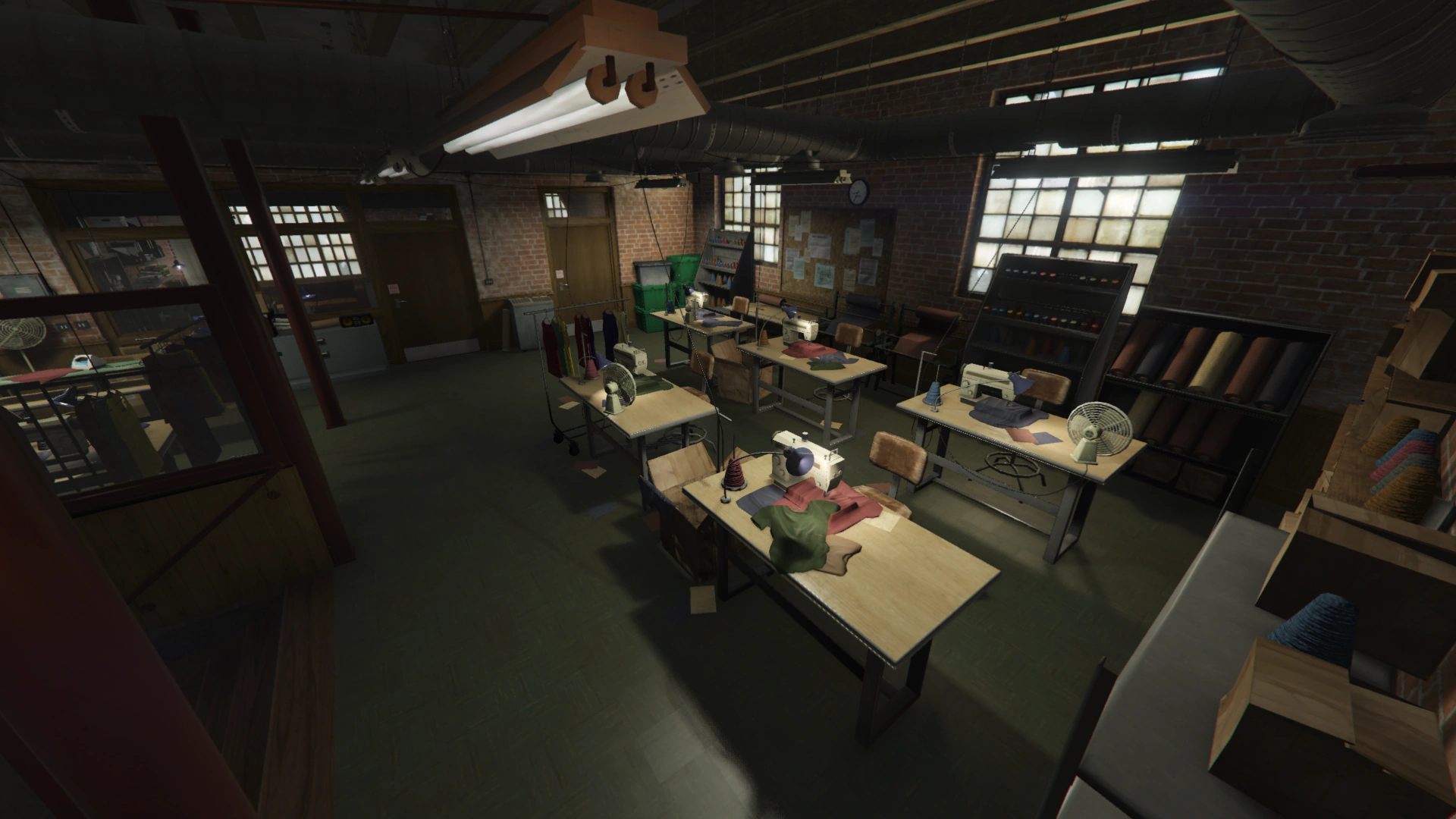 The upper level of the factory largely contains the textile workshop, where several sewing stations and various materials are stored. Depending on the time of day, the sewing stations may be occupied with workers or vacant. On the west side of the upper level are two rooms that serve as a lounge and sleeping area for the player. In the room that once served as Lester Crest's office and heist planning area, a small office area with an intractable cigarette and ECola vending machine can be found. This room also contains the safe where the Garment Factory's daily income can be collected. Adjacent to this room is a bedroom area with a bed and small wardrobe where the player can change their outfit. On the east side of the upper level is a roof access door where players can reach the rooftop of the factory.