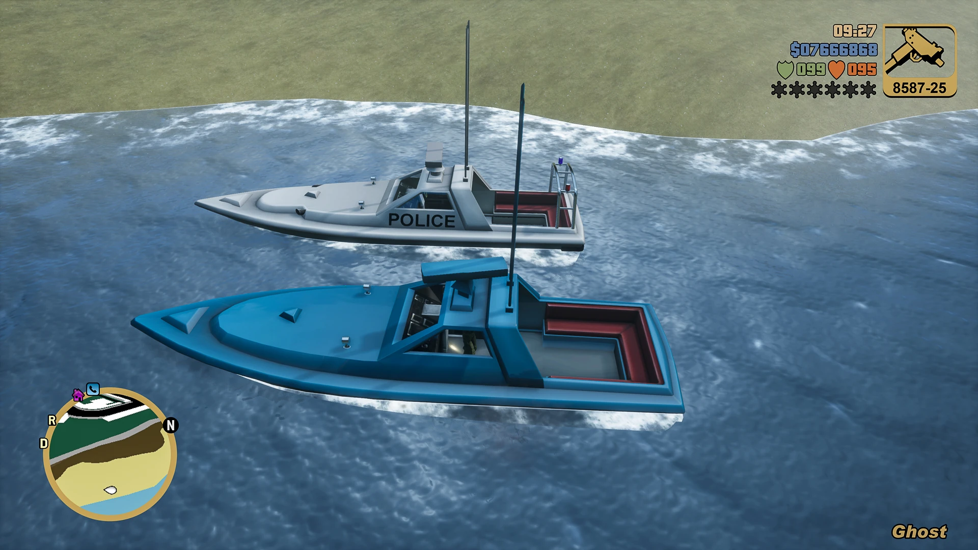 The Ghost sailing alongside a Predator, as seen in Grand Theft Auto III - The Definitive Edition.