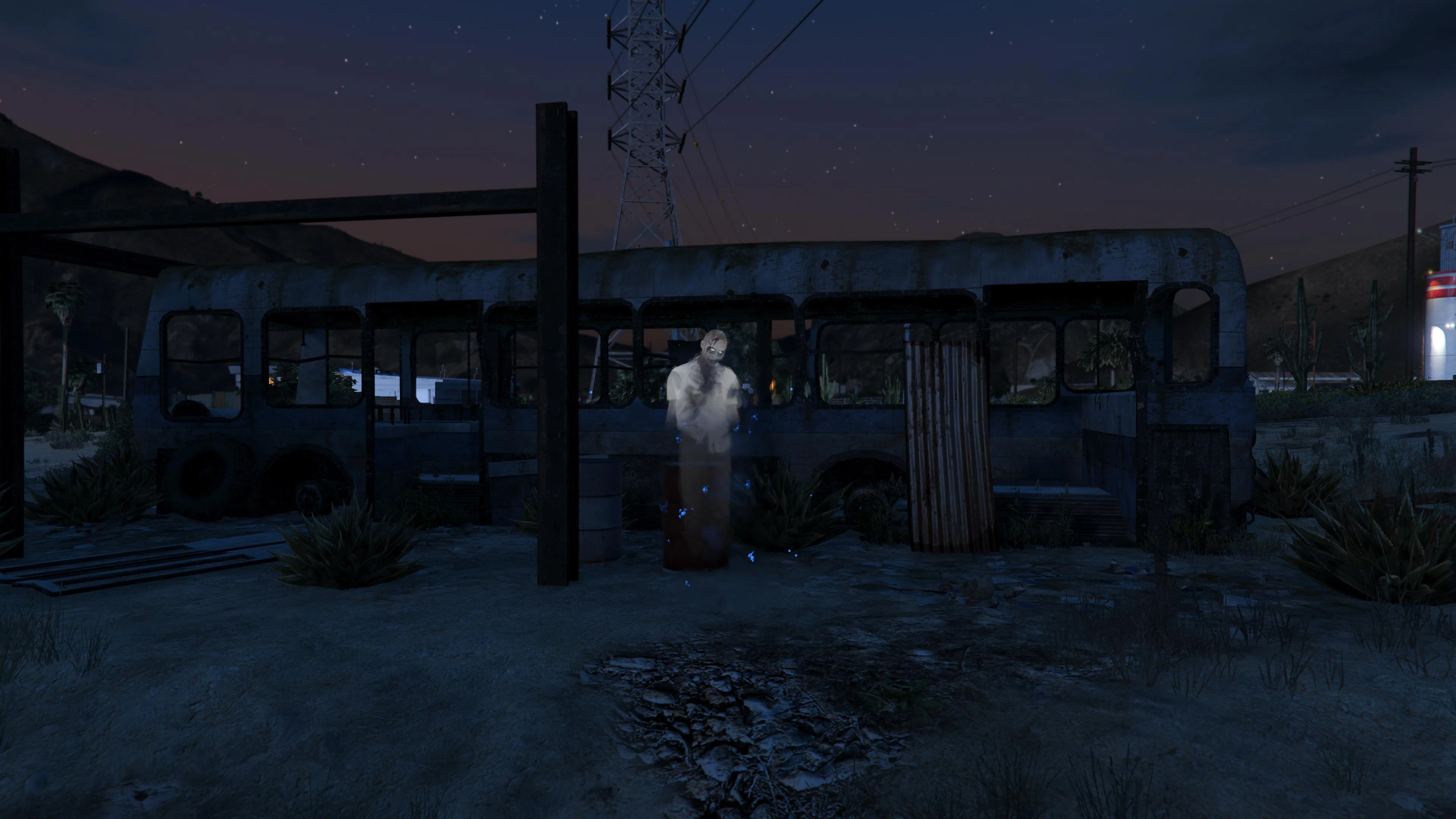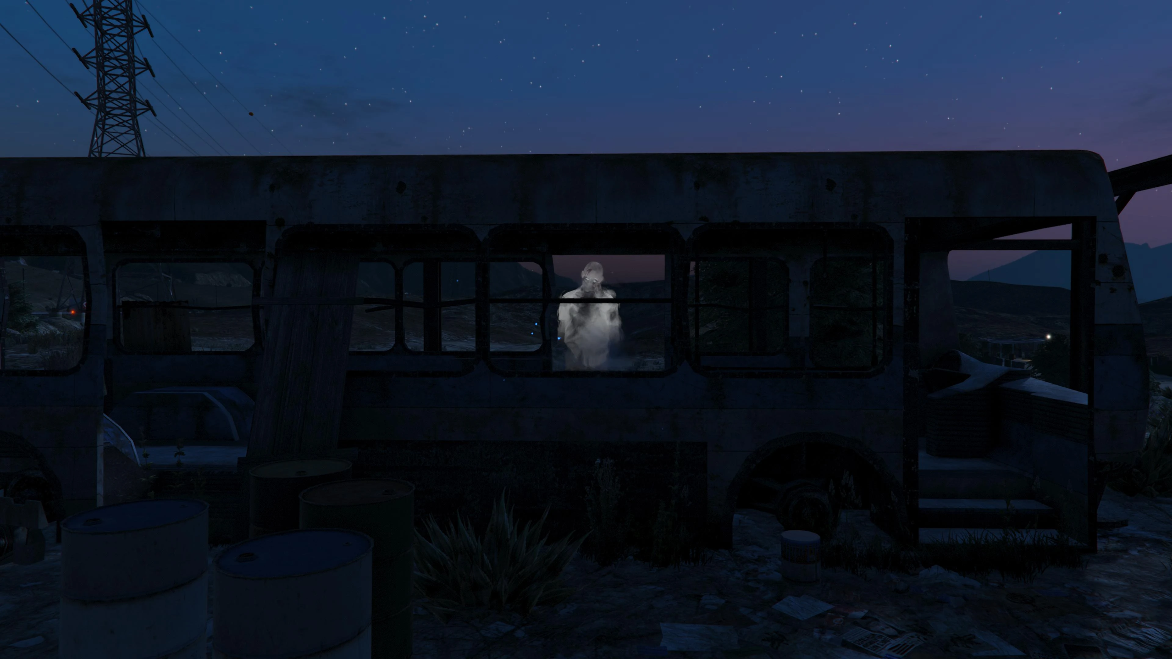3 | Inside a wrecked bus in the desert, to the east of Maude's Trailer in Grapeseed, bordered by Senora Freeway. | 22:00 to 23:00 | ![]() |