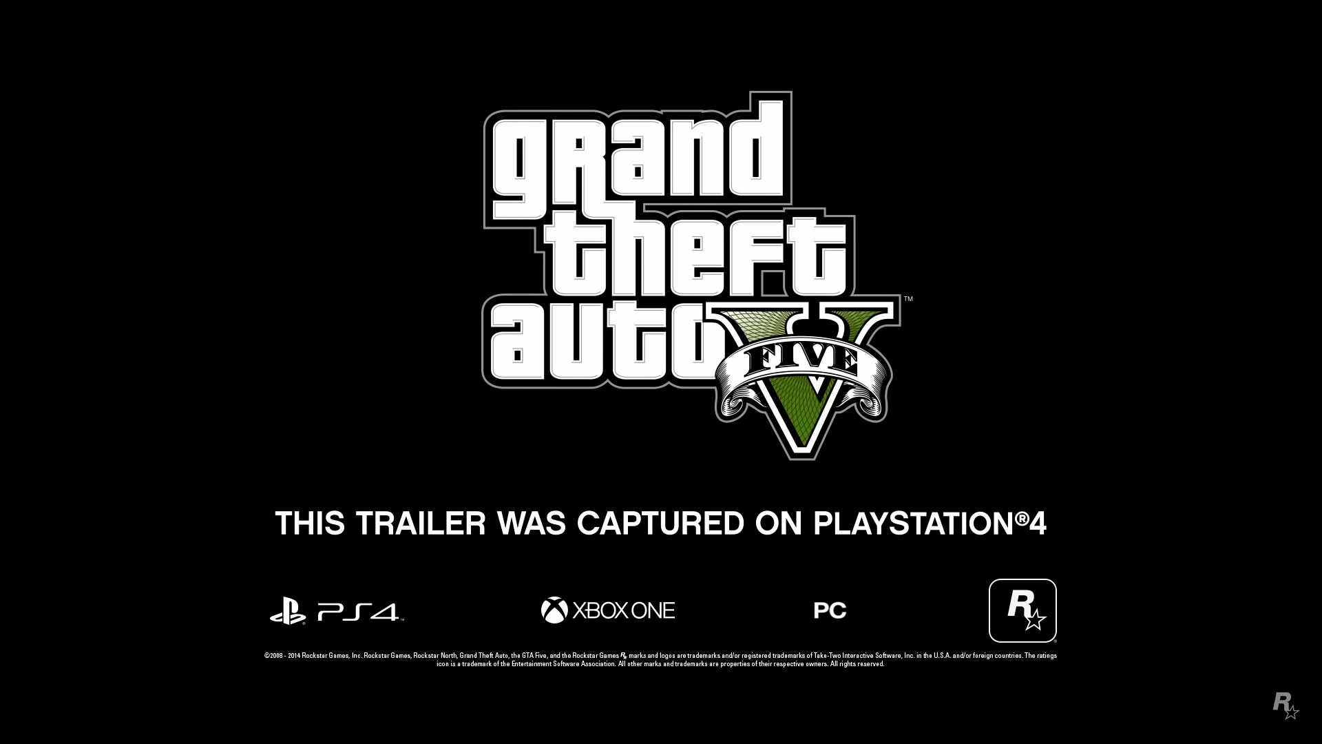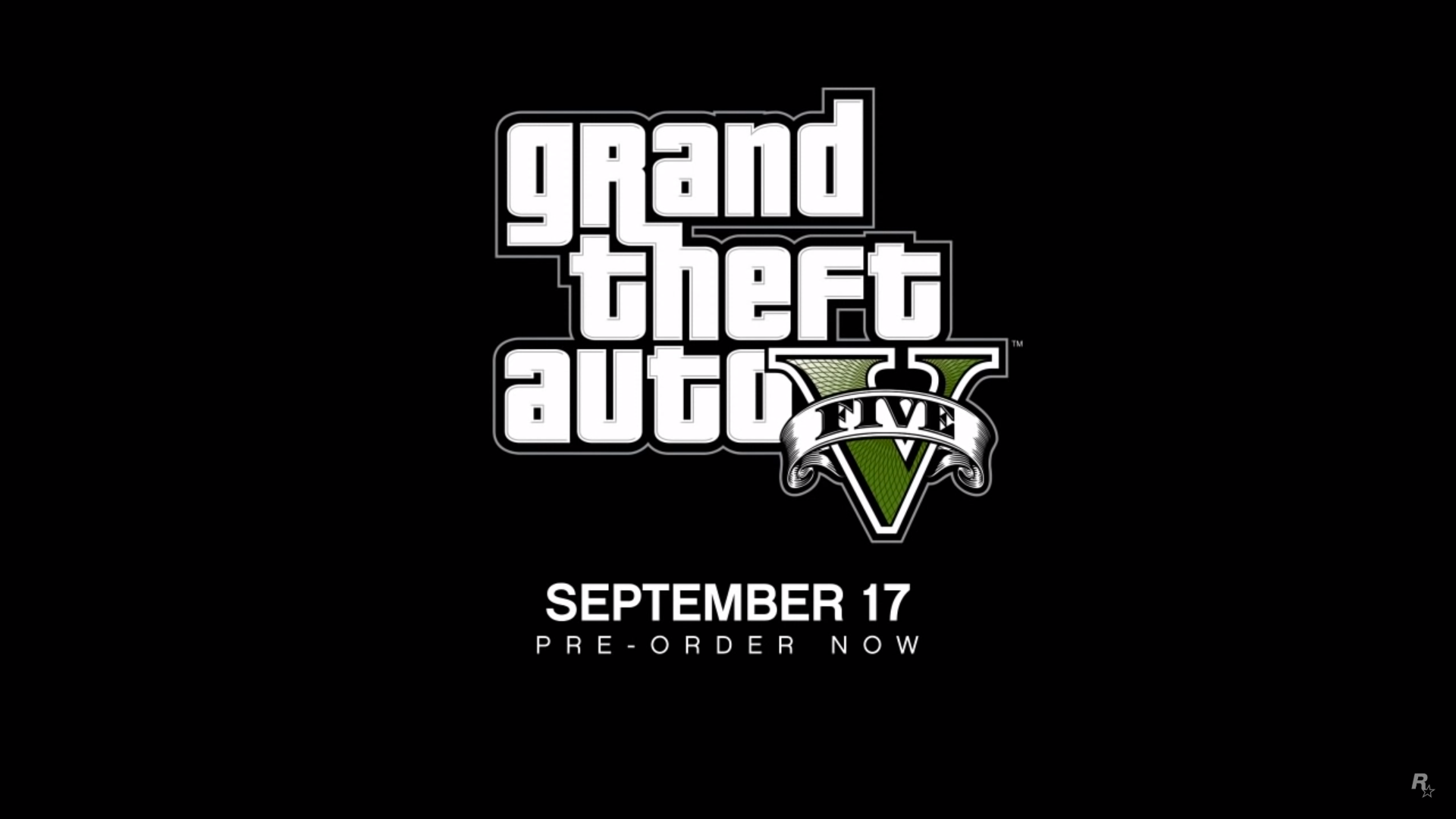 A black screen with the Grand Theft Auto V logo is shown. The ESRB, PlayStation 3, Xbox 360 and Rockstar Games logos are shown. GRAND THEFT AUTO V: SEPTEMBER 17
