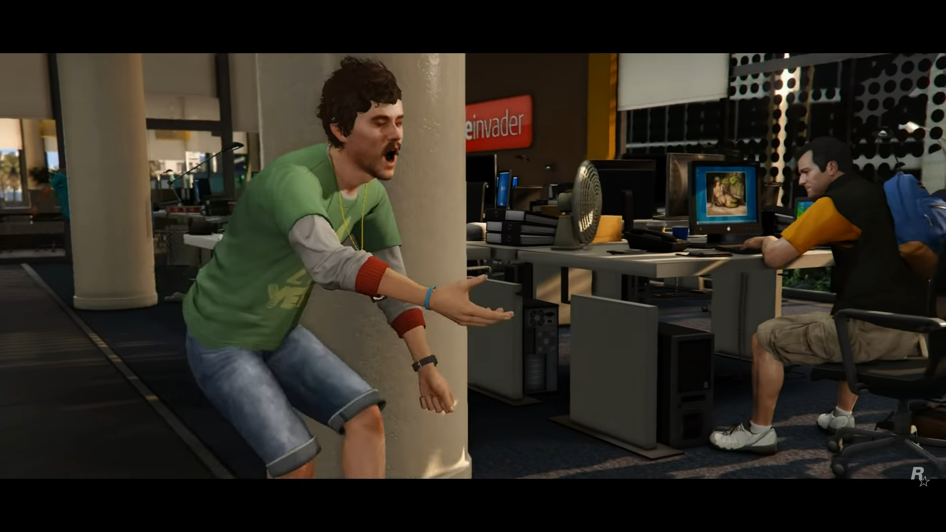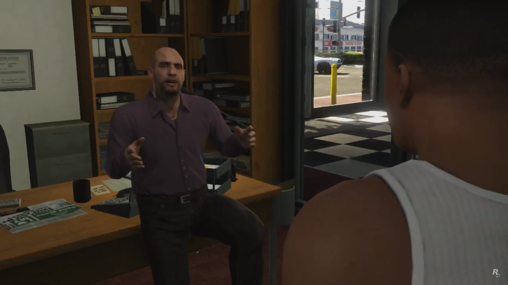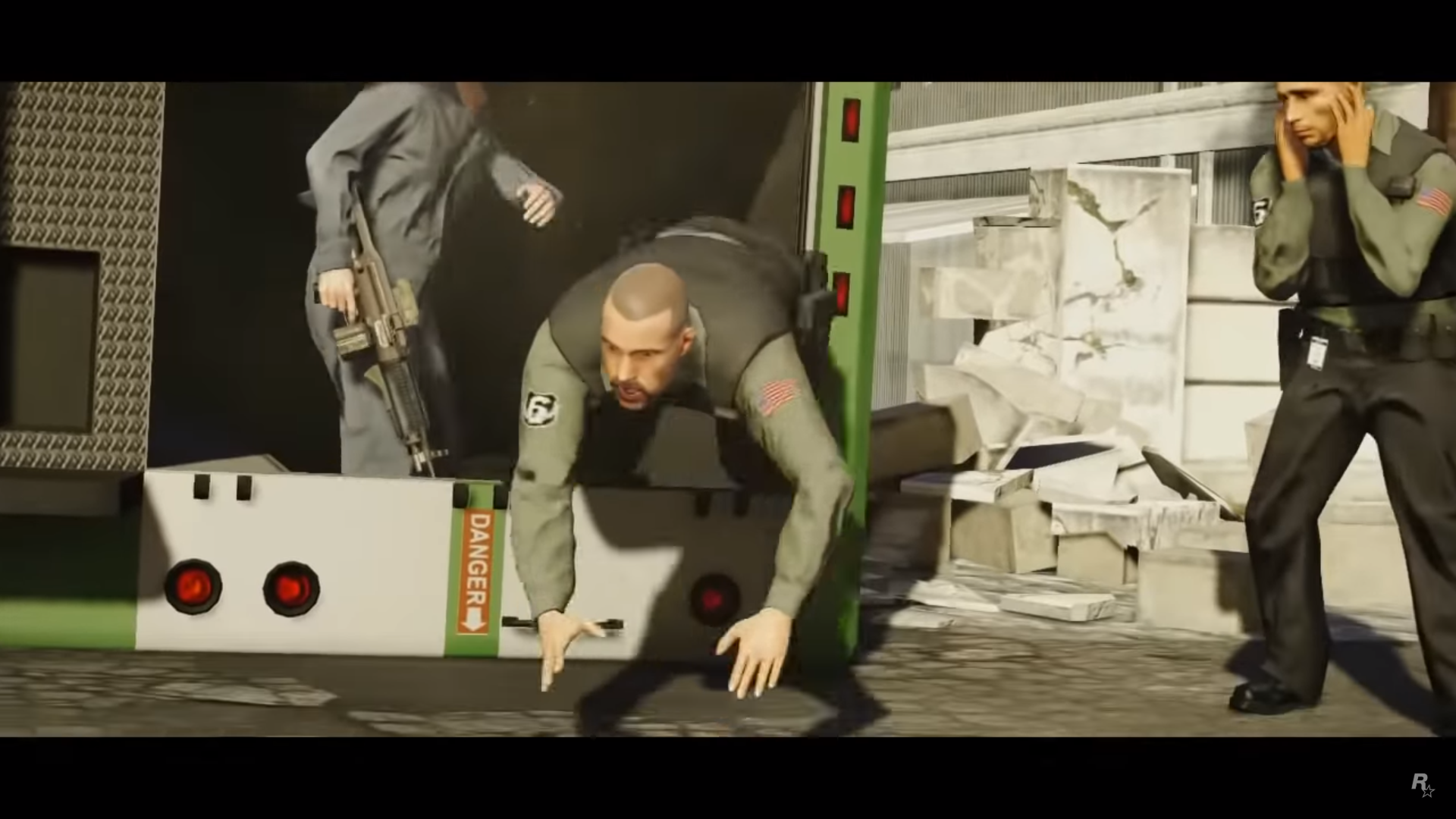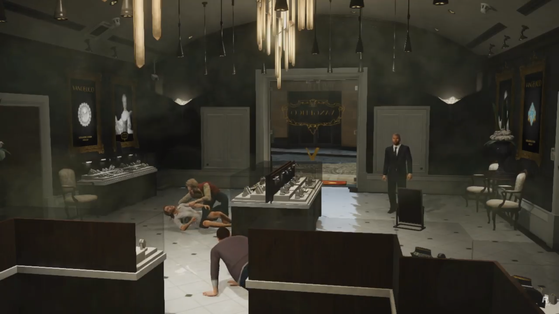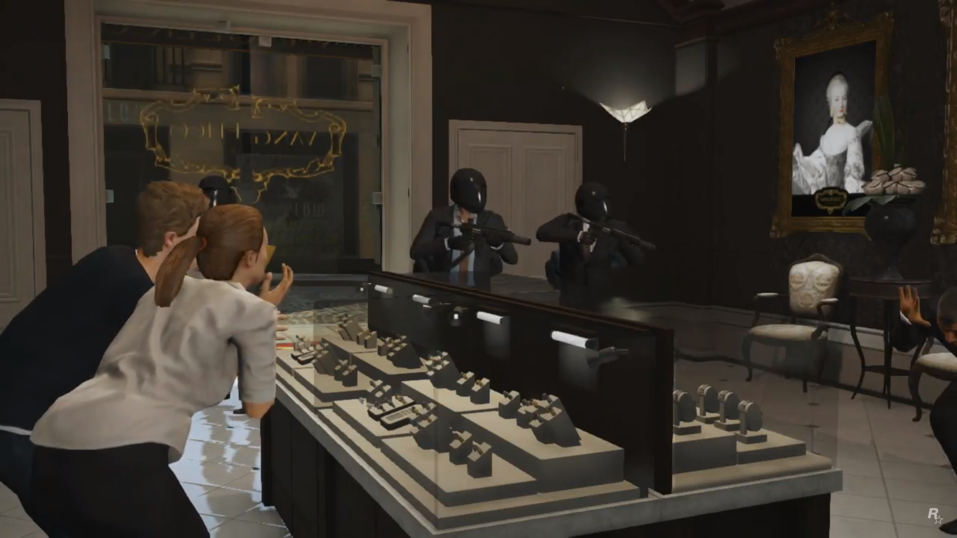 Michael, armed and wearing a Bugstars outfit, bangs on the side of a Bugstars Burrito as two gunmen exit the rear doors before proceeding to burst open Vangelico's main doors.
