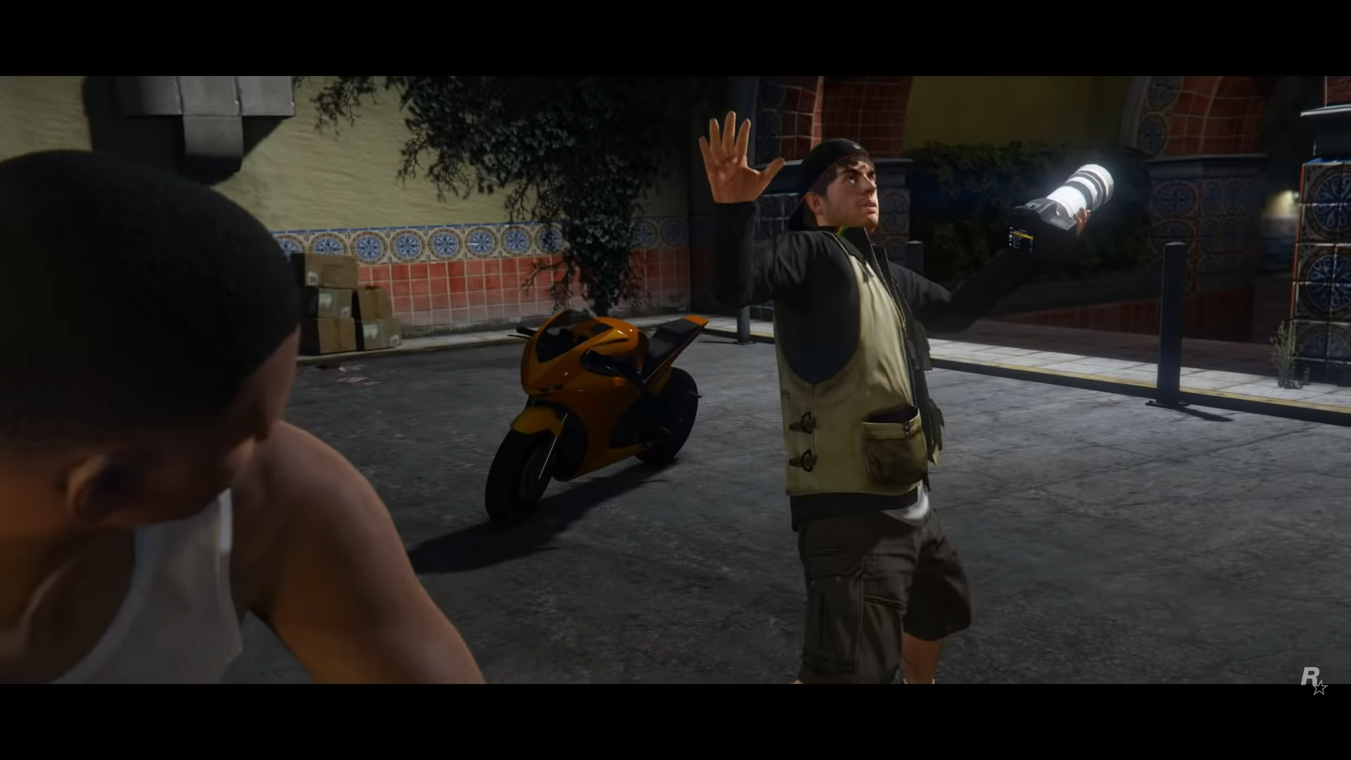 Franklin is now on Grove Street, shooting Ballas gang members, during the mission Hood Safari. He is seen firing an SMG with no attachments equipped. Franklin then throws a Grenade at the Felon. He quickly switches his weapon to the Carbine Rifle with the suppressor, scope, extended clip, grip & flashlight attachments and kills the Ballas members who get out of the cars. The cars then explode.